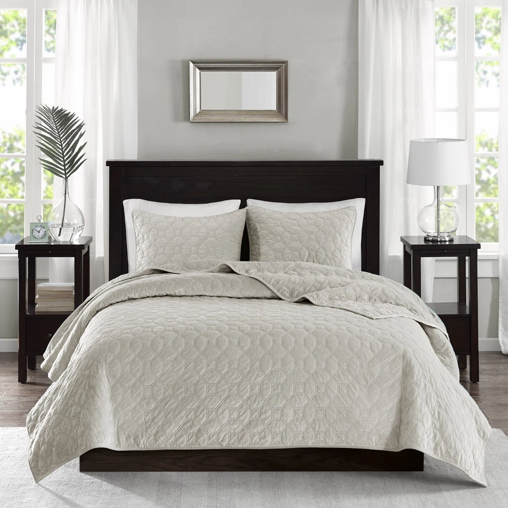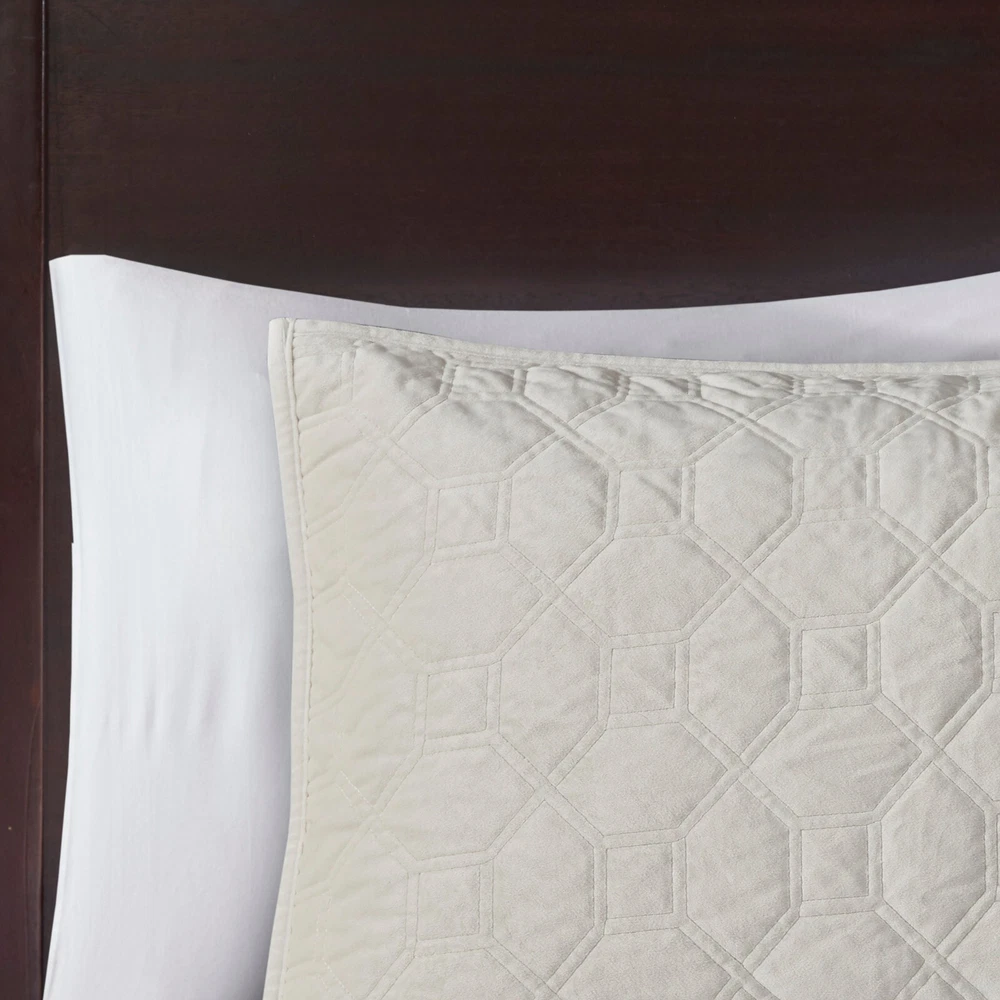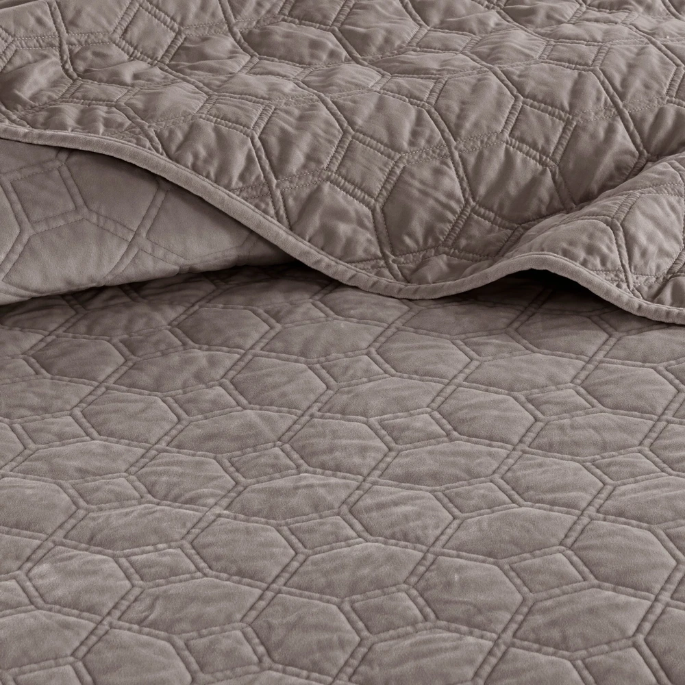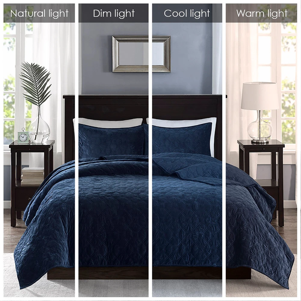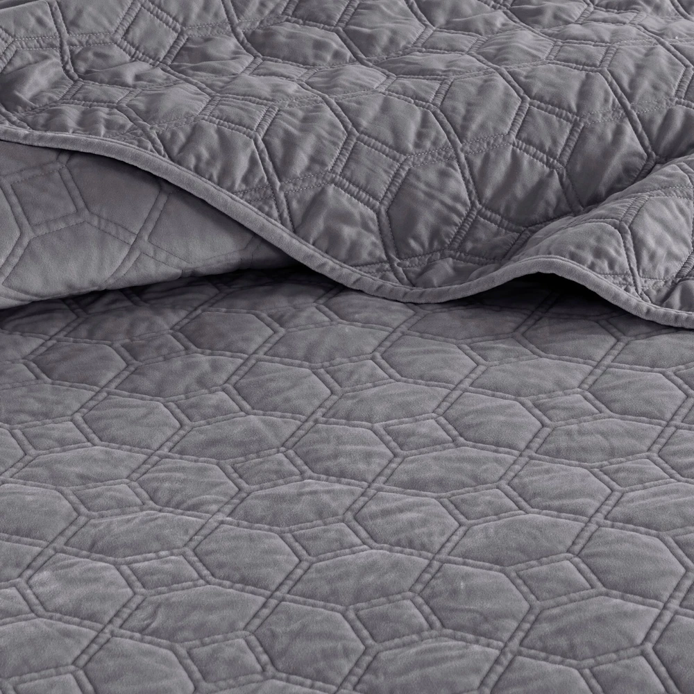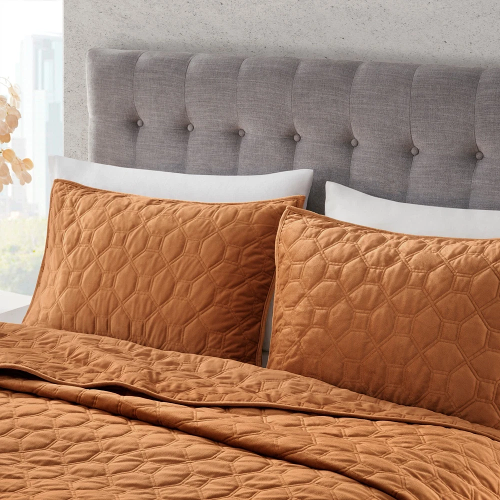 Store Categories Store Categories Bedding Comforters Decorative Pillows Duvet Covers Quilts & Coverlets Sheets Blankets & Throws Mattress Pads Pillows Home Decor Window Treatments Wall Art Home Accents Furniture Beds Dining Seating Ottomans & Benches Accent Chairs Accent Tables Dining Tables Sofas Bath Bath Robes Shower Curtains Towels Bath Rugs Bath Accessories Apparel Pajama Sets Nightgowns Rugs Rugs & Carpets Lighting Lamp Pendant Other Product Overview Details DESCRIPTION The Madison Park Harper Velvet 3 Piece Quilt Set offers a casual and comfortable update to your bedroom. The polyester velvet quilt features a soft texture with a geometric quilted design, for a rich look and feel. Matching shams pair beautifully with the quilt to complete the quilt set. Providing a charming layering piece to your bed, this quilt has an antimicrobial treatment that helps reduce bacteria buildup and odors, keeping the fabric fresh longer. FEATURES • Elegant and soft velvet quilt set in geometric quilting technique • Great for added layer for extra warmth in cold season • Set includes 1 quilt and 2 matching shams • Cotton filling for comfort and durability • Anti-microbial treatment for health and wellness - helps reduce the growth of odor causing bacteria and keeps fabric lasting longer • Machine washable for easy care MATERIAL Quilt/Sham: 100% Polyester velvet with quilted face, microfiber reverse Fill: 90% Cotton, 10% other fiber filling Prewash Finish Available Sizes: Full/Queen Quilt Set includes: 1 Quilt: 90"W x 90"L 2 Standard Shams: 20"W x 26"L + 0.5"D King/California King Quilt Set includes: 1 Quilt: 104"W x 94"L 2 King Shams: 20"W x 36"L + 0.5"D DESCRIPTION The Madison Park Harper Velvet 3 Piece Quilt Set offers a casual and comfortable update to your bedroom. The polyester velvet quilt features a soft texture with a geometric quilted design, for a rich look and feel. Matching shams pair beautifully with the quilt to complete the quilt set. Providing a charming layering piece to your bed, this quilt has an antimicrobial treatment that helps reduce bacteria buildup and odors, keeping the fabric fresh longer. FEATURES • Elegant and soft velvet quilt set in geometric quilting technique • Great for added layer for extra warmth in cold season • Set includes 1 quilt and 2 matching shams • Cotton filling for comfort and durability • Anti-microbial treatment for health and wellness - helps reduce the growth of odor causing bacteria and keeps fabric lasting longer • Machine washable for easy care MATERIAL Quilt/Sham: 100% Polyester velvet with quilted face, microfiber reverse Fill: 90% Cotton, 10% other fiber filling Prewash Finish Available Sizes: Full/Queen Quilt Set includes: 1 Quilt: 90"W x 90"L 2 Standard Shams: 20"W x 26"L + 0.5"D King/California King Quilt Set includes: 1 Quilt: 104"W x 94"L 2 King Shams: 20"W x 36"L + 0.5"D