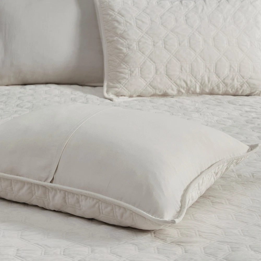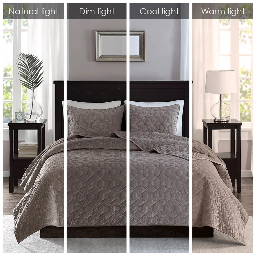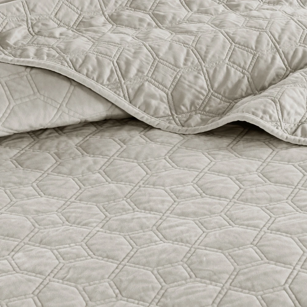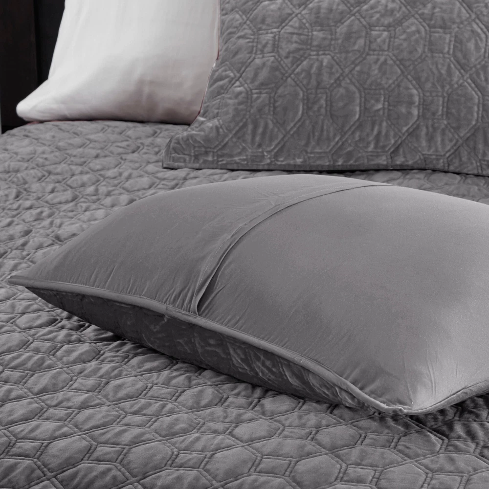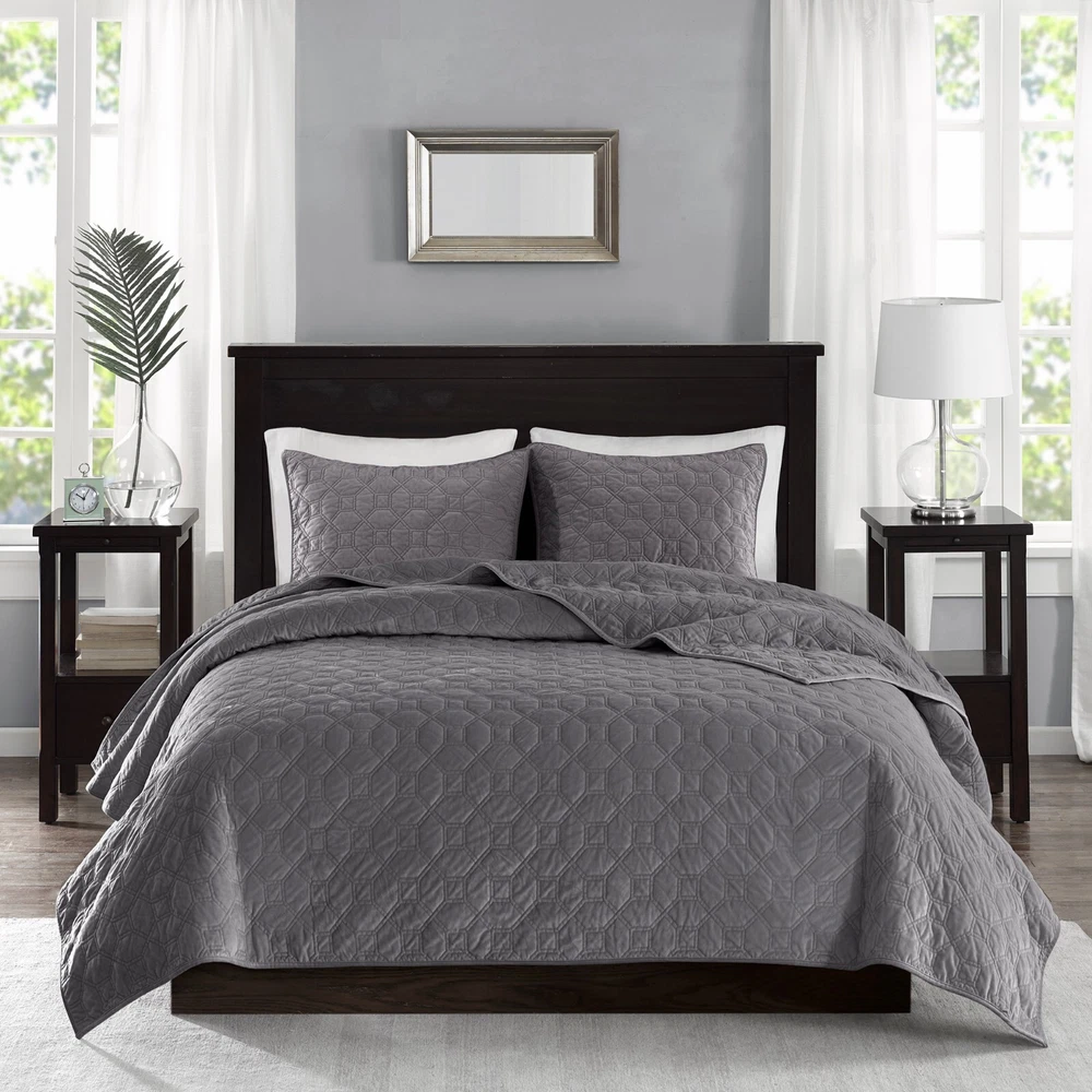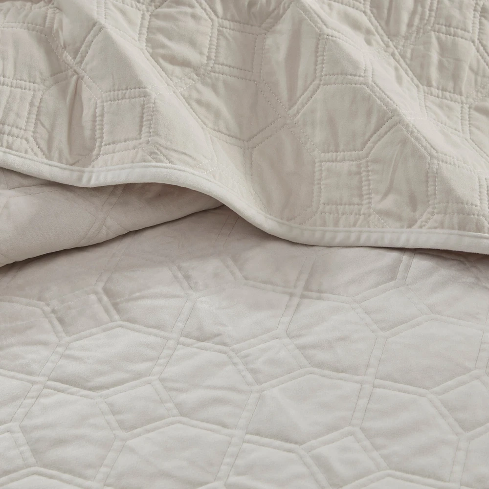 Store Categories Store Categories Bedding Comforters Decorative Pillows Duvet Covers Quilts & Coverlets Sheets Blankets & Throws Mattress Pads Pillows Home Decor Window Treatments Wall Art Home Accents Furniture Beds Dining Seating Ottomans & Benches Accent Chairs Accent Tables Dining Tables Sofas Bath Bath Robes Shower Curtains Towels Bath Rugs Bath Accessories Apparel Pajama Sets Nightgowns Rugs Rugs & Carpets Lighting Lamp Pendant Other Product Overview Details DESCRIPTION The Madison Park Harper Velvet 3 Piece Quilt Set offers a casual and comfortable update to your bedroom. The polyester velvet quilt features a soft texture with a geometric quilted design, for a rich look and feel. Matching shams pair beautifully with the quilt to complete the quilt set. Providing a charming layering piece to your bed, this quilt has an antimicrobial treatment that helps reduce bacteria buildup and odors, keeping the fabric fresh longer. FEATURES • Elegant and soft velvet quilt set in geometric quilting technique • Great for added layer for extra warmth in cold season • Set includes 1 quilt and 2 matching shams • Cotton filling for comfort and durability • Anti-microbial treatment for health and wellness - helps reduce the growth of odor causing bacteria and keeps fabric lasting longer • Machine washable for easy care MATERIAL Quilt/Sham: 100% Polyester velvet with quilted face, microfiber reverse Fill: 90% Cotton, 10% other fiber filling Prewash Finish Available Sizes: Full/Queen Quilt Set includes: 1 Quilt: 90"W x 90"L 2 Standard Shams: 20"W x 26"L + 0.5"D King/California King Quilt Set includes: 1 Quilt: 104"W x 94"L 2 King Shams: 20"W x 36"L + 0.5"D DESCRIPTION The Madison Park Harper Velvet 3 Piece Quilt Set offers a casual and comfortable update to your bedroom. The polyester velvet quilt features a soft texture with a geometric quilted design, for a rich look and feel. Matching shams pair beautifully with the quilt to complete the quilt set. Providing a charming layering piece to your bed, this quilt has an antimicrobial treatment that helps reduce bacteria buildup and odors, keeping the fabric fresh longer. FEATURES • Elegant and soft velvet quilt set in geometric quilting technique • Great for added layer for extra warmth in cold season • Set includes 1 quilt and 2 matching shams • Cotton filling for comfort and durability • Anti-microbial treatment for health and wellness - helps reduce the growth of odor causing bacteria and keeps fabric lasting longer • Machine washable for easy care MATERIAL Quilt/Sham: 100% Polyester velvet with quilted face, microfiber reverse Fill: 90% Cotton, 10% other fiber filling Prewash Finish Available Sizes: Full/Queen Quilt Set includes: 1 Quilt: 90"W x 90"L 2 Standard Shams: 20"W x 26"L + 0.5"D King/California King Quilt Set includes: 1 Quilt: 104"W x 94"L 2 King Shams: 20"W x 36"L + 0.5"D