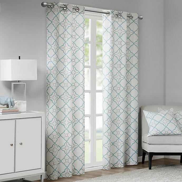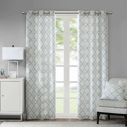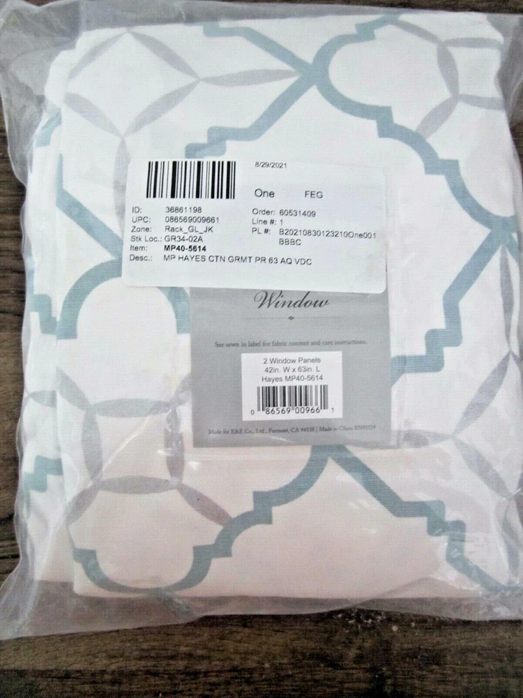 Madison Park Hayes Cotton Duck Grommet Window Curtain Panels Aqua PAIR 63"Lx43"W Open package - this is a new pair, but PLEASE NOTE* the cotton duck print has random pin-point blue flecks throughout the fabric. Please view photos. They are very light and minor, but these are being sold AS IS and priced accordingly. MSRP is $42.99 Curtains are 63" long, so please measure your window - they are SHORTER than the pair in the photo. Ships within 24 hours of payment with tracking
