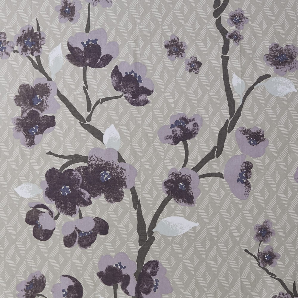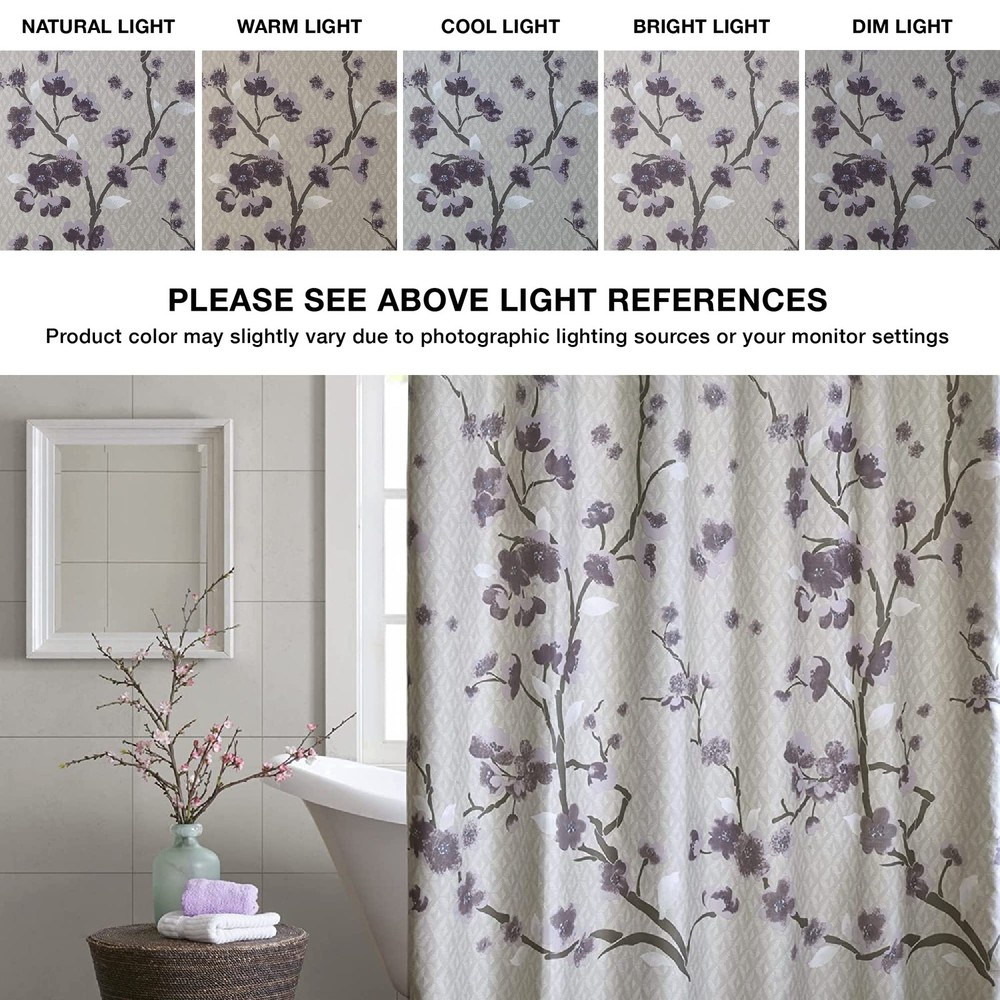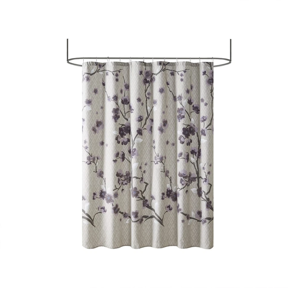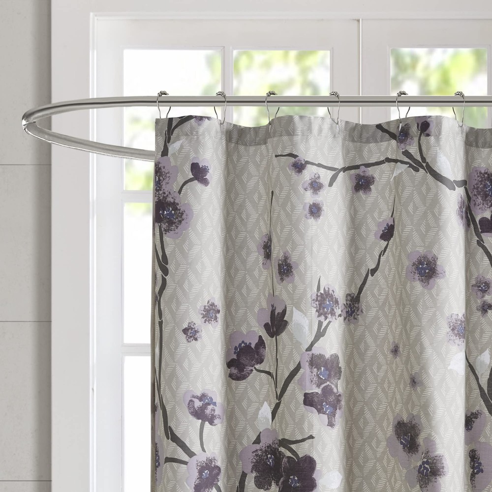 Holly cotton shower curtain features beautiful cherry blossoms floral design adding a sophisticated flair to your bathroom decor. Modern design features an allover cherry blossom design with branches. The soft grey background pairs beautifully with the purple and grey flowers for the perfect update to your space. A water repellant liner is not included and highly recommended. 1 Shower Curtain: 72"W x 72"L Care instructions: machine washable