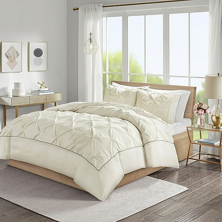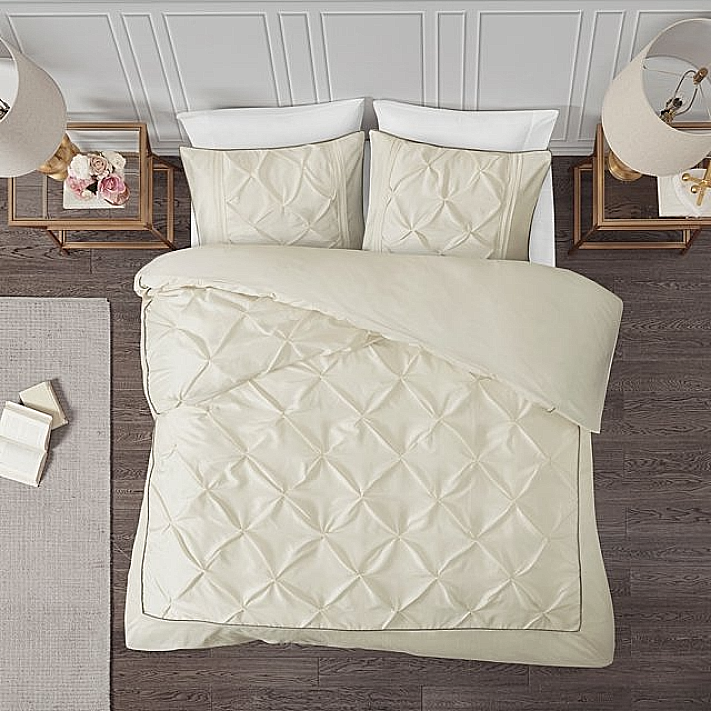 Details: Full/Queen Set Includes: 1 Duvet Cover (90"W x 90"L), 2 Standard Shams (20"W x 26"L) Duvet/Sham: Faux Silk , Pieced, Tufted 100% Brushed Polyester Reverse Sham Closure: Overlap Elegant Tufted 3-Piece Pinch Pleat Duvet Cover Set Inside Corner Ties To Secure The Insert Button Closure Faux Silk Fabric That Offers Luster And Easy Care After Steam Press Duvet Cover Is Machine Washable Delicate Cycle