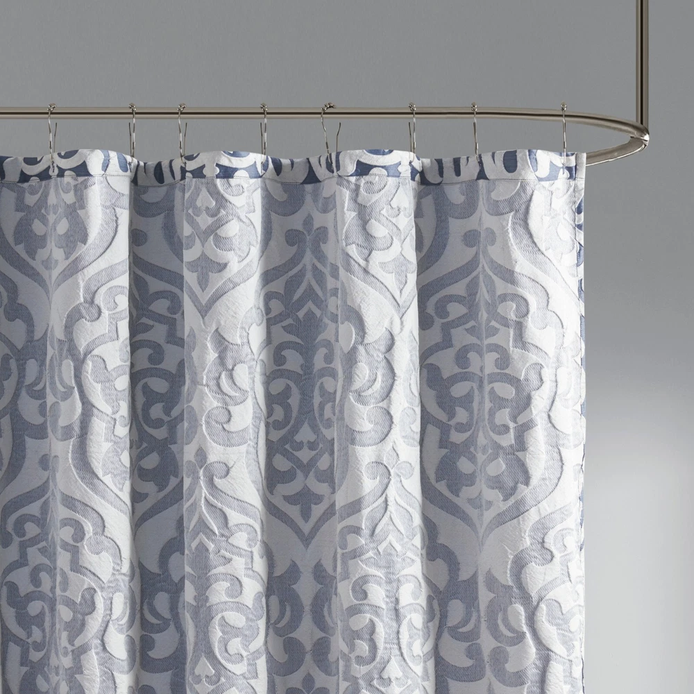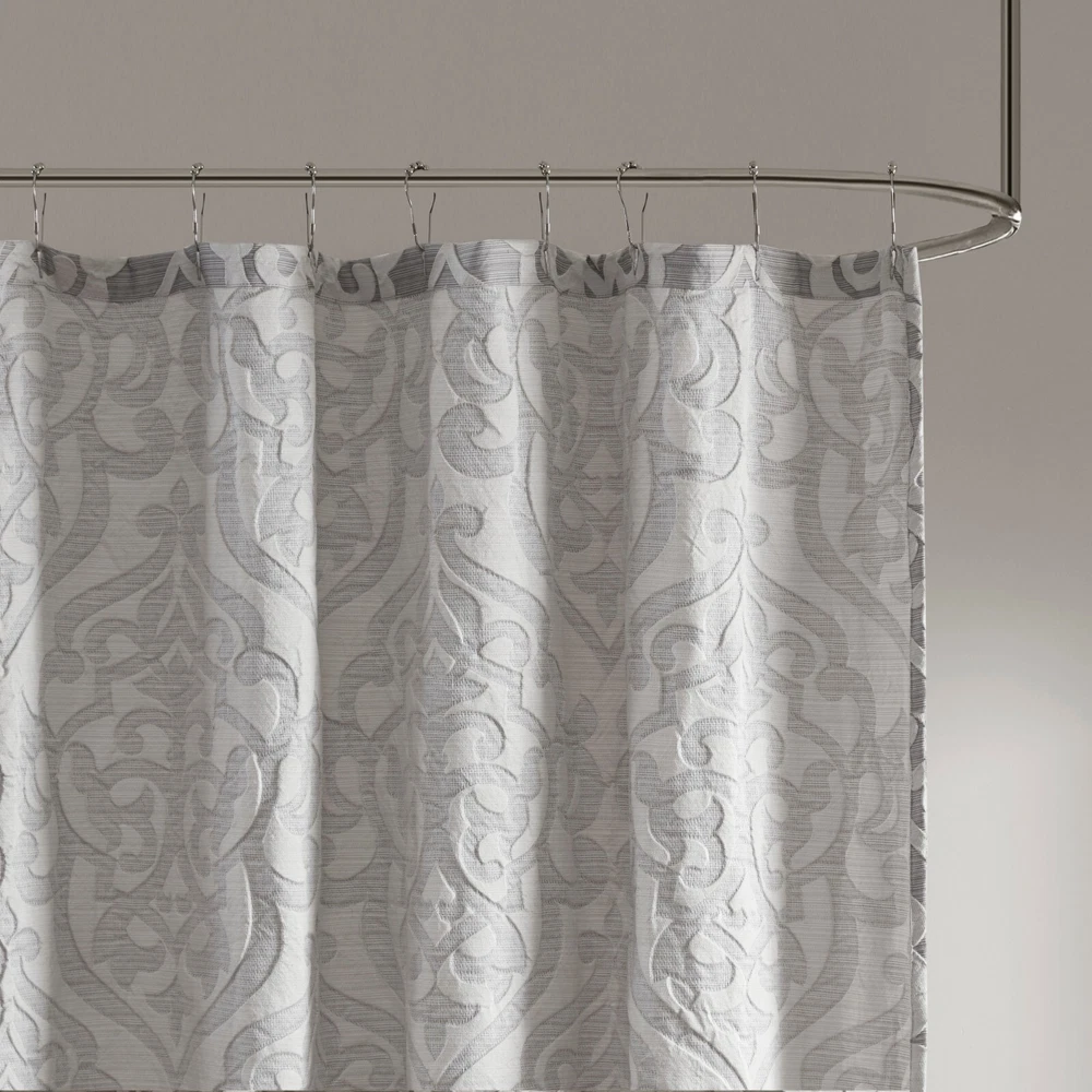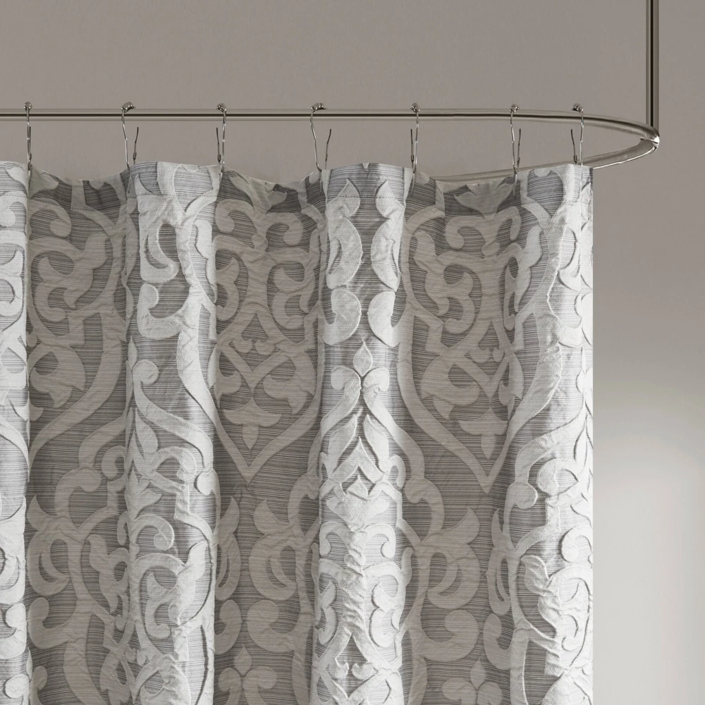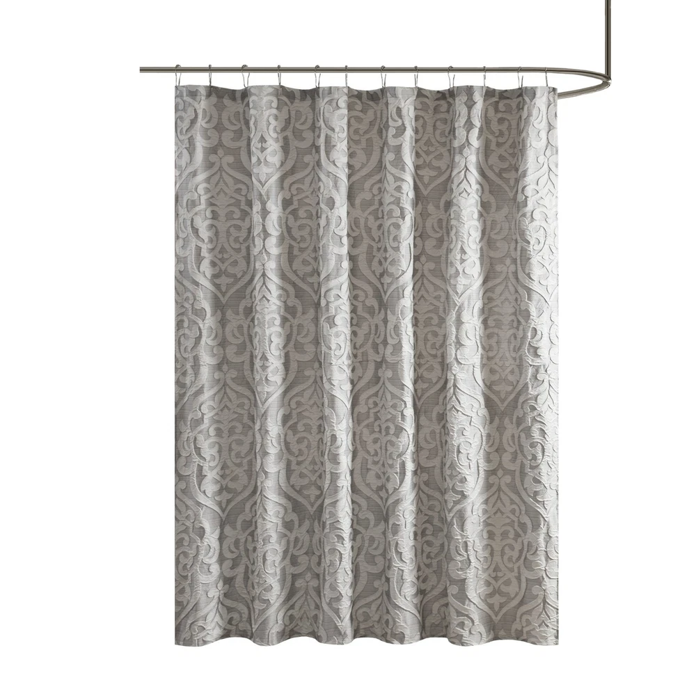 Madison Park Jacquard Water Repellant Shower Curtain 72"x72" for Bathroom Decor Description: Add a touch of class to your bathroom with our Madison Park Odette Jacquard Shower Curtain. This luxurious textured shower curtain flaunts a gorgeous silver damask medallion design on a stria grey jacquard ground that adds rich texture and dimension to the lavish look. Measuring 72x72", each shower curtain is finished with 12 button holes on top making it easy to assemble hooks and hang onto rod (hooks and rod not included). To better preserve this beautiful shower curtain, a water repellant liner is highly recommended and can be purchased separately (liner not included). Machine washable for easy care; complete the collection with coordinate matching bedding, alas available and sold separately. 72x72" Size include: 1 Shower Curtain:72"W x 72"L Care Instruction: Machine Washable Material Details: 100% Polyester Jacquard