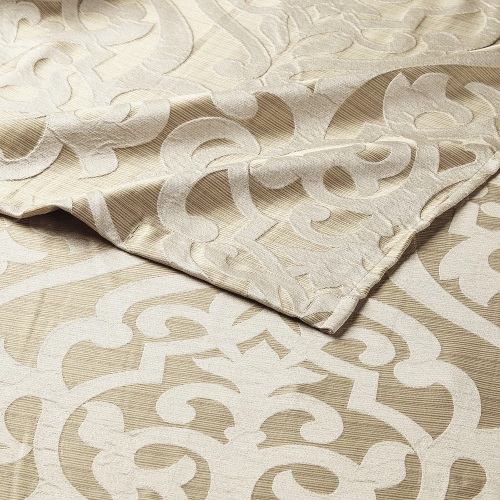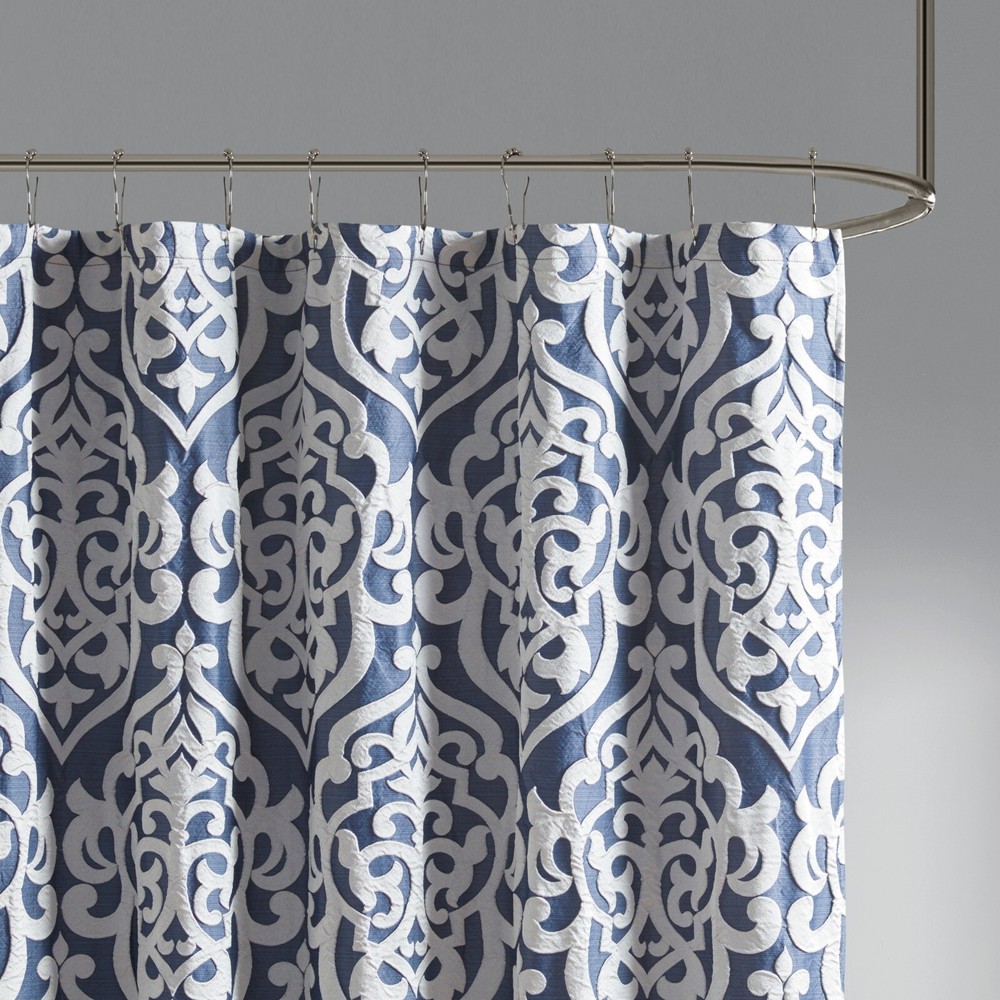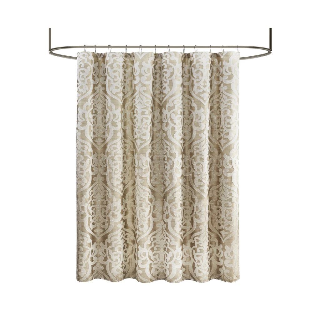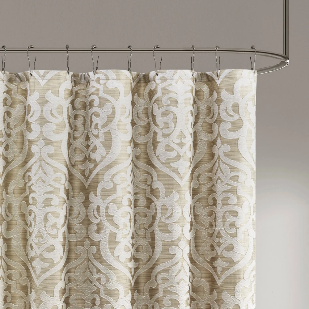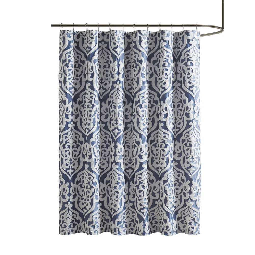 Madison Park Jacquard Water Repellant Shower Curtain 72"x72" for Bathroom Decor Description: Add a touch of class to your bathroom with our Madison Park Odette Jacquard Shower Curtain. This luxurious textured shower curtain flaunts a gorgeous silver damask medallion design on a stria grey jacquard ground that adds rich texture and dimension to the lavish look. Measuring 72x72", each shower curtain is finished with 12 button holes on top making it easy to assemble hooks and hang onto rod (hooks and rod not included). To better preserve this beautiful shower curtain, a water repellant liner is highly recommended and can be purchased separately (liner not included). Machine washable for easy care; complete the collection with coordinate matching bedding, alas available and sold separately. 72x72" Size include: 1 Shower Curtain:72"W x 72"L Care Instruction: Machine Washable Material Details: 100% Polyester Jacquard
