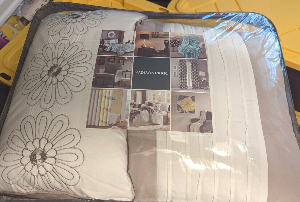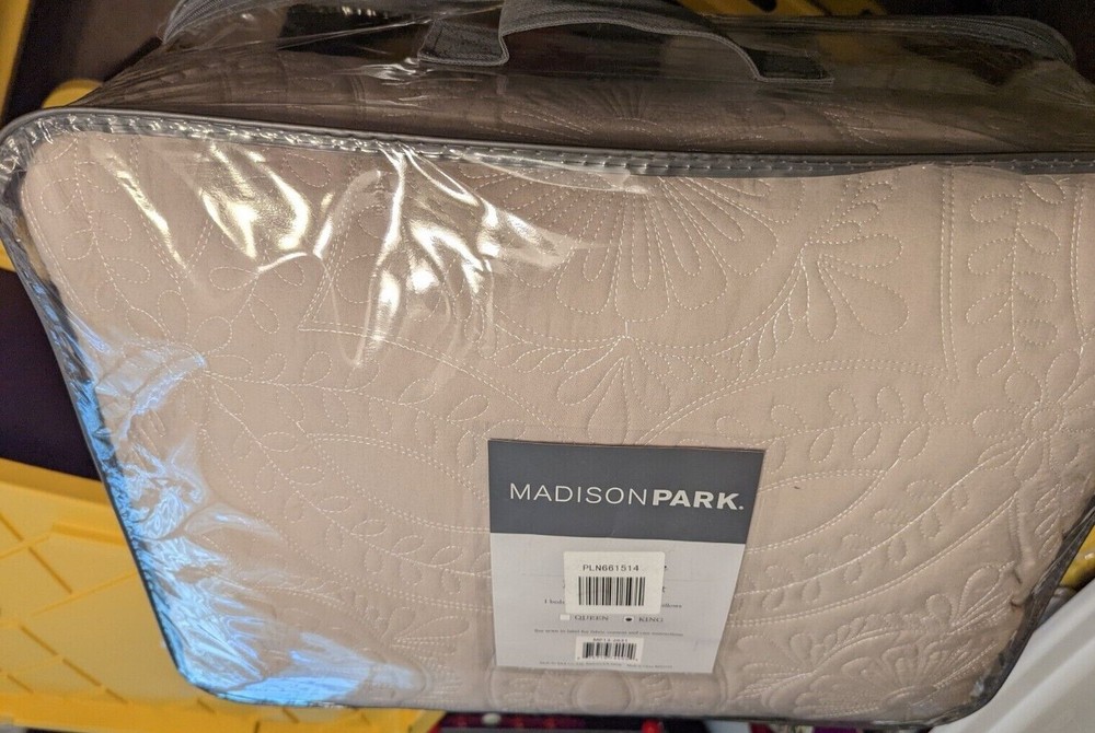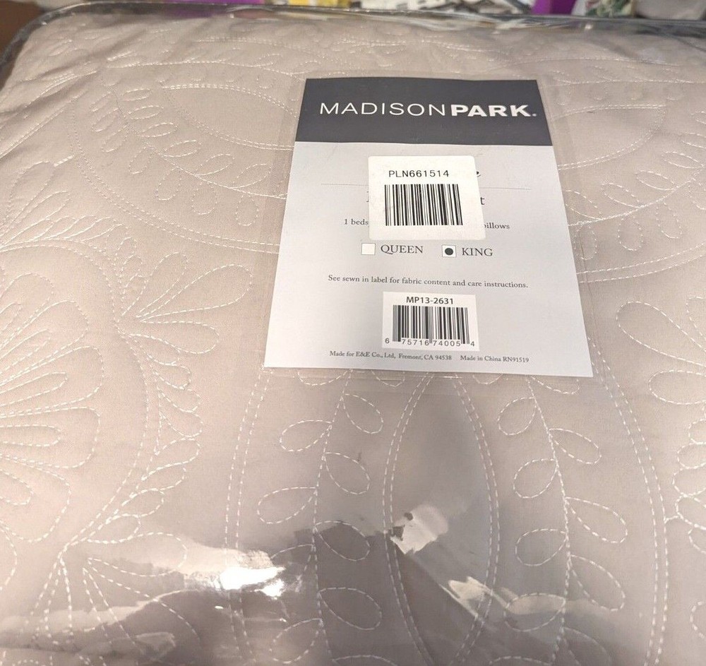 Madison Park King 5 Piece Reversible Bedspread Set In Khaki Finish MP13-2631 Add color to your traditional space with the Madison Park Ashbury Bedspread Set. The khaki base is accented with large quilting in a medallion pattern while a large ivory border makes a statement on your bedding. Two decorative pillows complete this collection with embroidery and fabric manipulation ion corresponding colors to the top of bed. Features Color: Khaki Material: Polyester 1 Bedspread: 120x118" 2 Decorative Pillows: 12x18"/18x18" 2 King Shams: 20x36+2"(2) Made in China Care Instructions: Machine Wash Cold, Gentle Cycle, And Separately. Do Not Bleach. Tumble Dry Low, Remove Promptly, Do Not Iron. If There Is No Free Movement In The Washer Or Dryer, Use Large Capacity Commercial Washer/Dryer.
