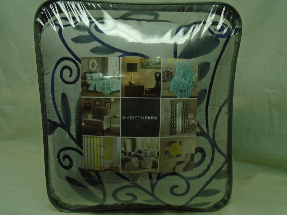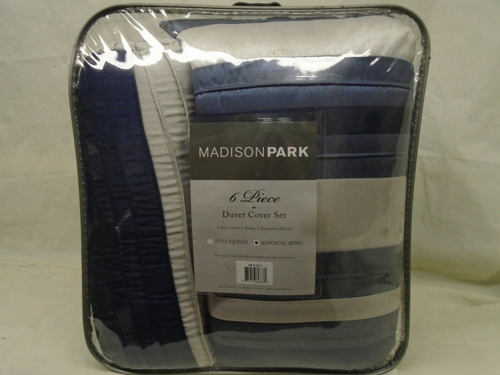 Madison Park King 6 Piece Duvet Cover Set In Navy Finish MP12-2211 The Amherst bed set is where casual meets contemporary. The clean color lines of this set make it simple in a way that you can accessorize any way you want. Sleek piping of the fabric on the duvet cover and pillows gives a strong visual dimension and ties the whole bed together. In addition, there is a floral pillow that adds a softness which is different from the manipulation of fabric and colors on the rest of the set. A duvet cover is a protective cover for your comforter, most likely for your down comforter. Sometimes it's referred to as a comforter cover. Duvet covers are not filled. It has an opening where you can insert your comforter. Filler not included. Features Color: Navy Material: Polyester 1 Duvet Cover: 104x92" 3 Decorative Pillows: 18x18"/16x16"/12x20" 2 King Shams: 20x36"(2) Made in China Care Instructions: Machine Wash Cold, Gentle Cycle, And Separately. Do Not Bleach. Tumble Dry Low, Remove Promptly, Do Not Iron. If There Is No Free Movement In The Washer Or Dryer, Use Large Capacity Commercial Washer/Dryer. BRAND NEW IN ORIGINAL PACKAGE. PART OF A MAJOR RETAILER BUYOUT. PACKAGING MAY SHOW SIGNS OF SHELF WEAR, HAVE MINOR DAMAGE OR BE DUSTY FROM STORAGE. ALL ITEMS ARE NEW UNLESS NOTED OTHERWISE. PLEASE SEE PICTURES FOR BOX QUALITY OR PLEASE ASK FOR ADDITIONAL PHOTOS. WE WILL DO COMBINED SHIPPING IF YOU PURCHASE MORE THAN ONE ITEM FROM OUR STORE. ITEMS MUST BE PAID FOR IN THE SAME TRANSACTION TO SHIP TOGETHER AND BE COMBINED. When will this ship: We Ship Monday – Friday UNTIL 2 PM, Order placed over the weekend or after 2pm on Friday will go out following Monday. If at any time during your purchasing process you feel you are not 100% satisfied, please contact us and, we will respond as soon as possible.