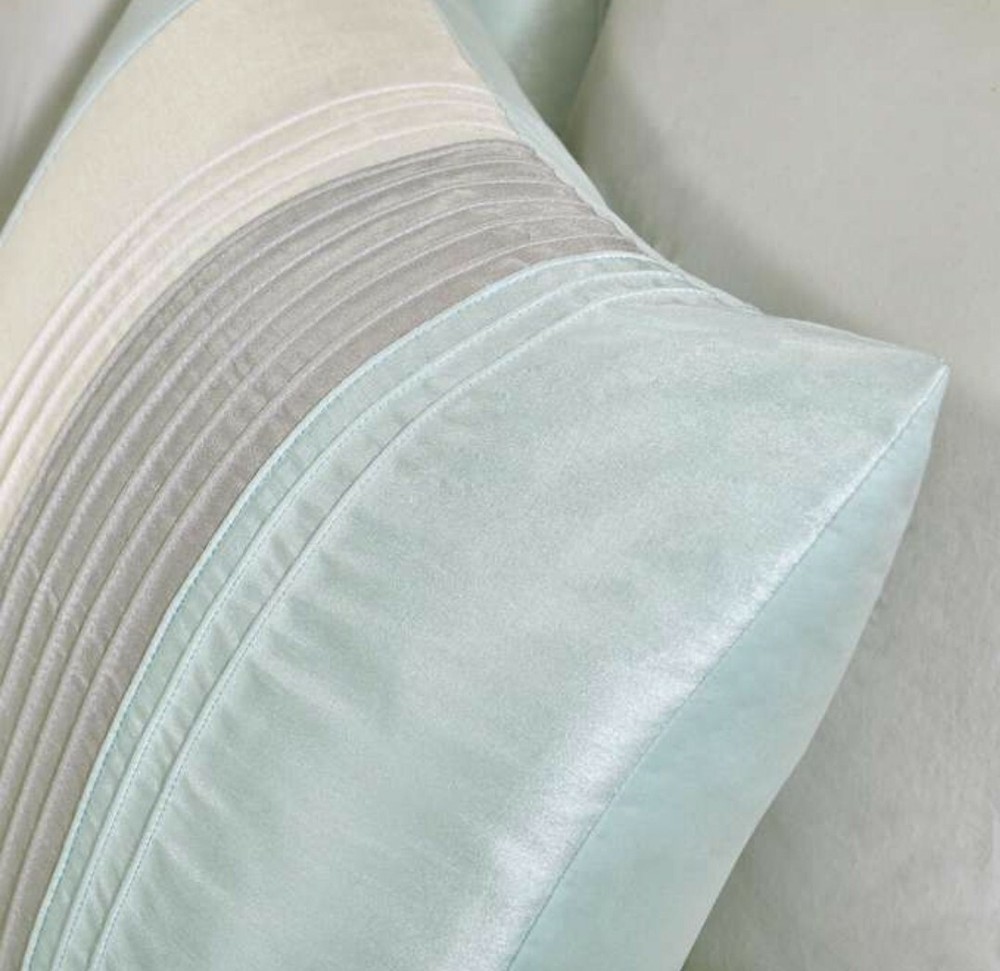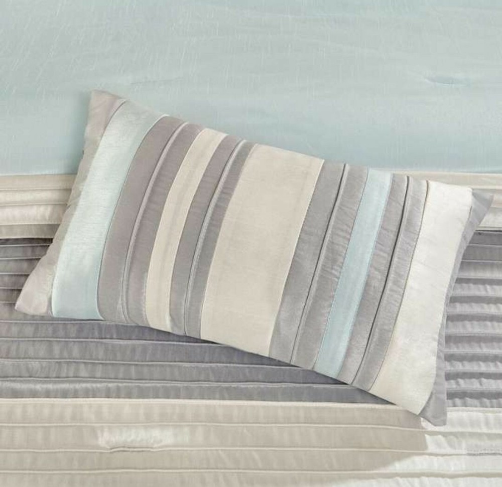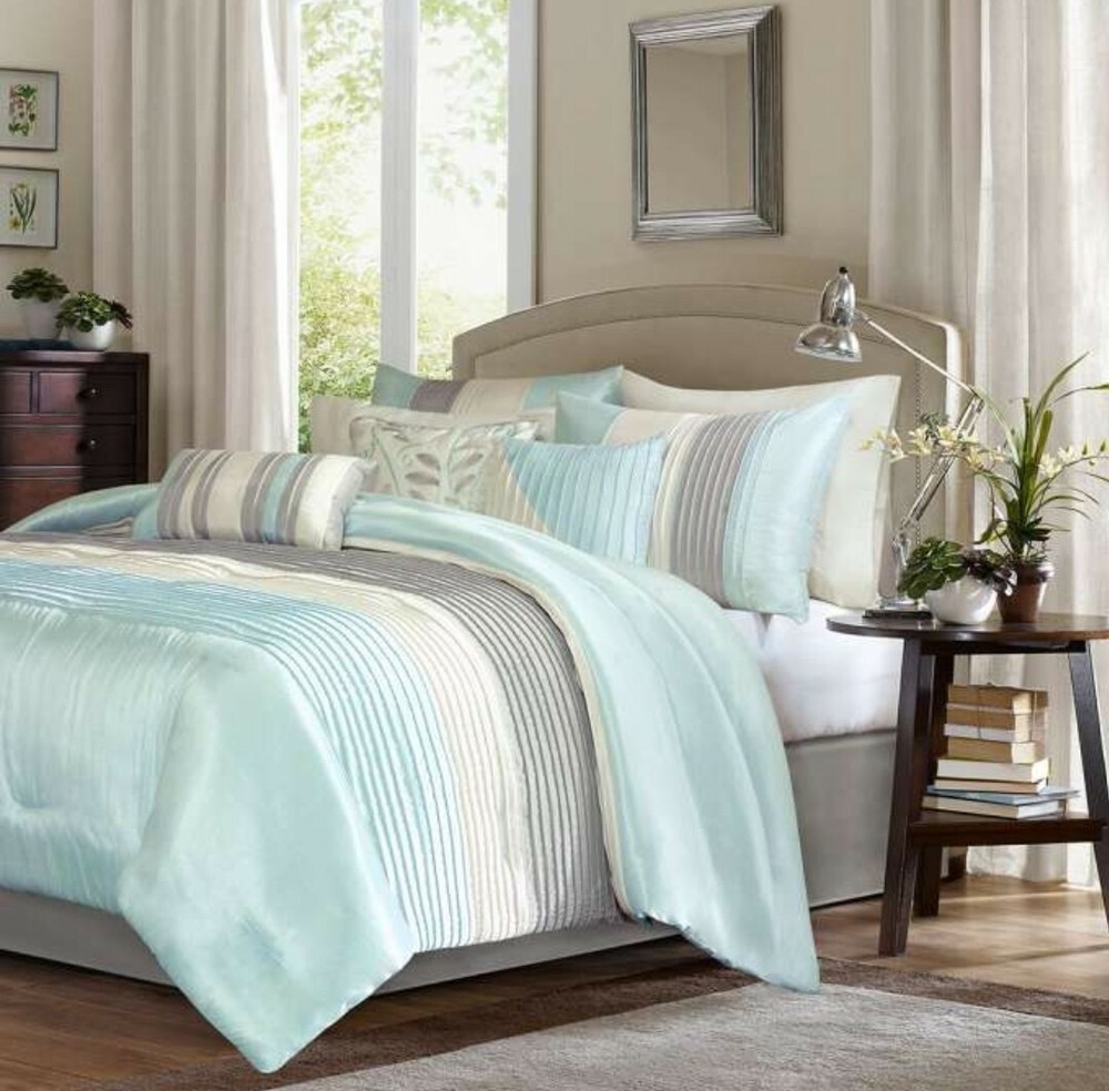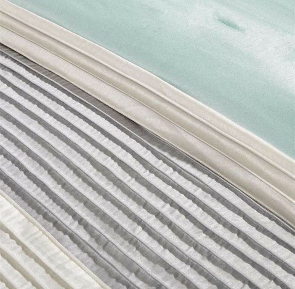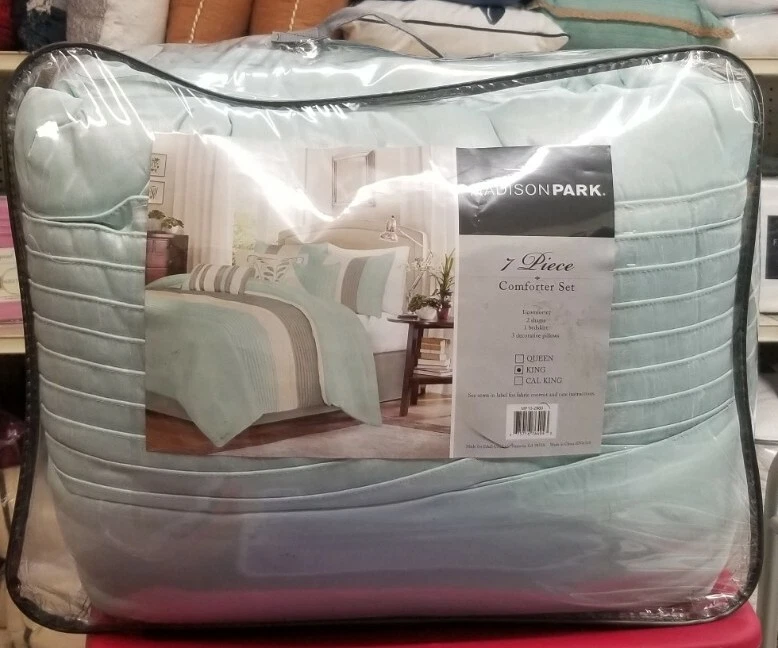 Madison Park King 7 Piece Comforter Set In Aqua. Condition is "New". Size: King 1 Comforter: 104x92" 2 king shams: 20x36"(2) 1 Bed skirt: 78x80+15" 3 Decorative pillows: 18x18/16x16"/12x20" Color: Aqua Transitional Style 7 Piece Comforter Set In Pintucking And Embroidery Details Pieced Faux Silk Face Fabric In Complimentary Colors With Pintucking Set Includes Comforter, Bedskirt, 2 Shams, 2 Square And 1 Oblong PillowsEmbroidery And Pintucking Details On The Decorative Pillows Hypoallergenic Polyester Filling In The Comforter And Pillows Machine Washable For Easy Care Amherst's modern color blocked design is a simple way to add style to your room. This comforter is covered in larges stripes in shades of aqua and grey. Made from polyester jacquard and a brushed fabric reverse this comforter is soft to the touch and is machine washable for easy care. The comforter set includes two matching standard shams and three decorative pillows that accent the color blocked look.