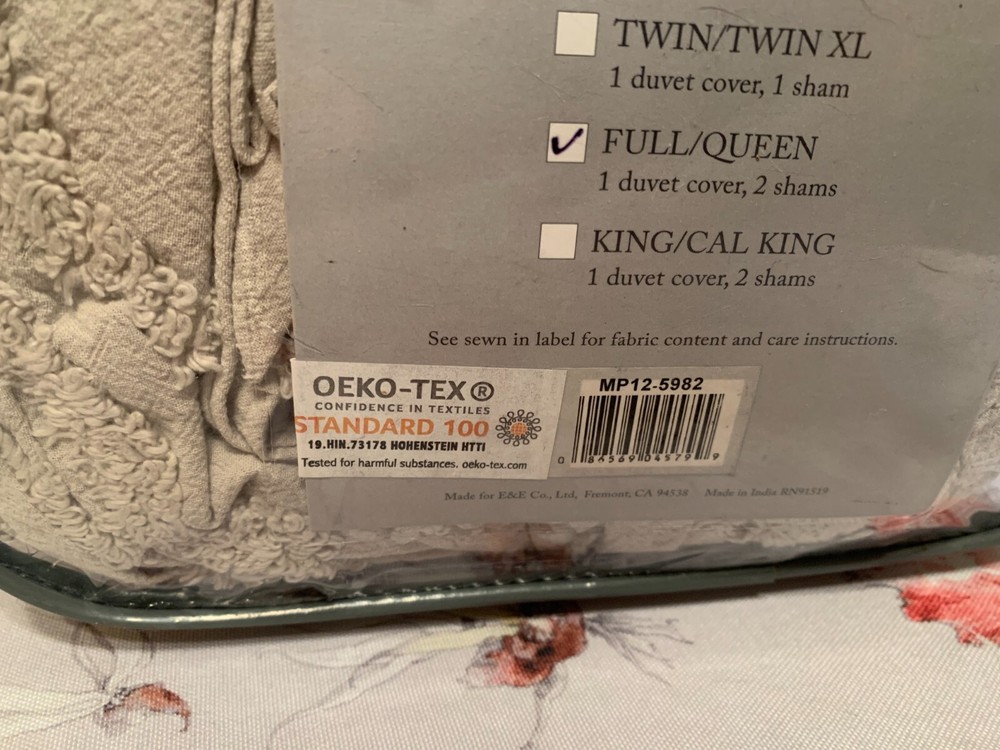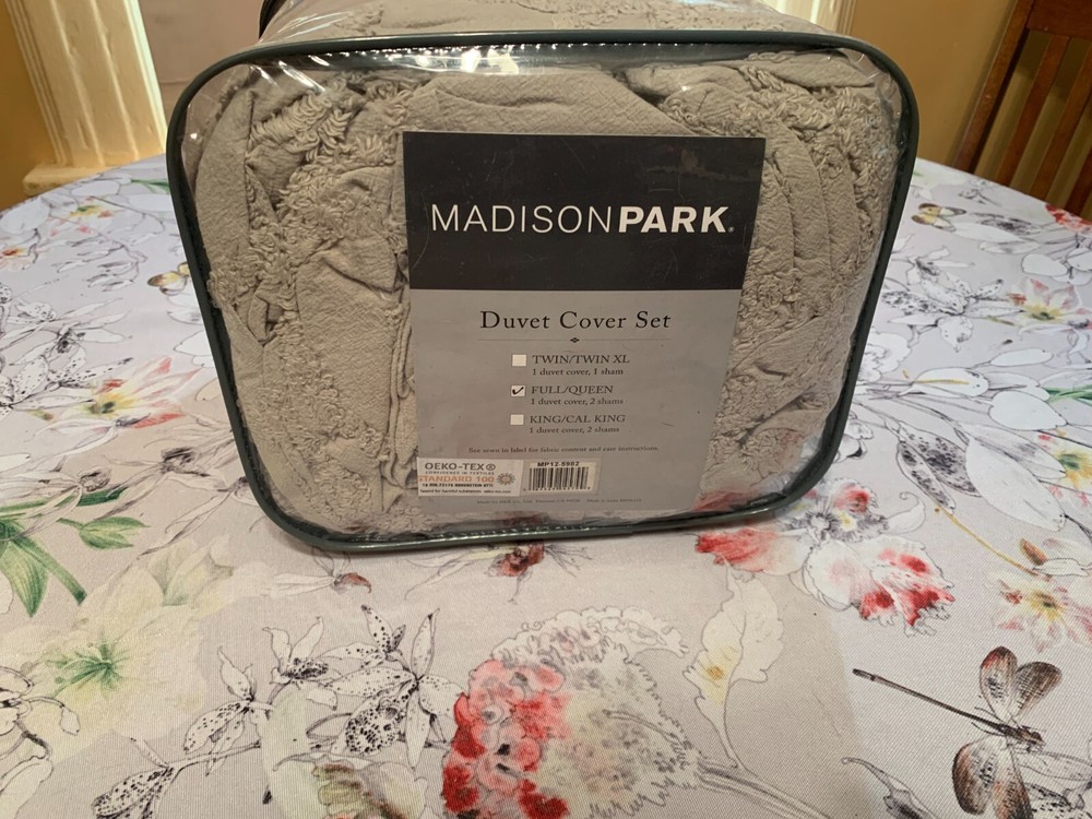 Madison Park Laetitia Full/Queen 3-Piece Tufted Cotton Chenille Medallion - Model # MP12 -5982: MP12-5982 Features: Globally inspired/Shabby Chic/Boho lifestyle cotton chenille medallion at the center of the bed 100% cotton duvet cover and matching shams that provide comfort and style 4 inside ties to secure the insert to stay in place Set includes 1 duvet cover, 2 matching shams Machine washable for easy care Material/Fabrication: 100% cotton Style: Global Inspired/Shabby Chic|Modern/Contemporary Primary Color: Grey 1 Duvet Cover:90"W x 90"L 2 Standard Shams:20"W x 26"L(2)