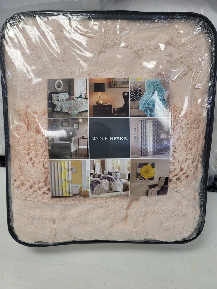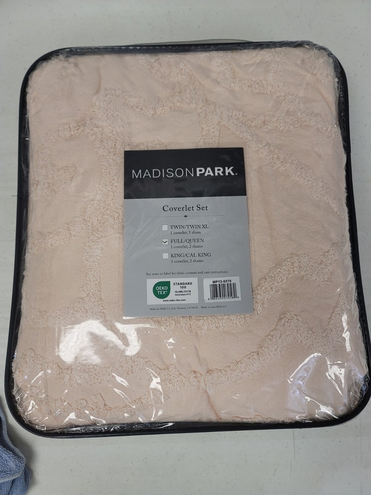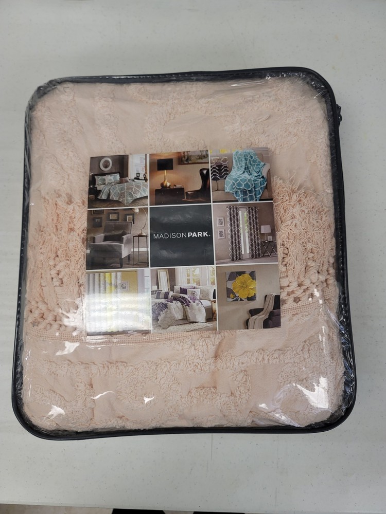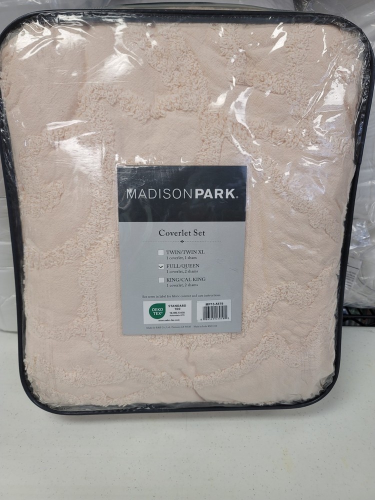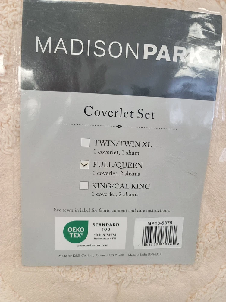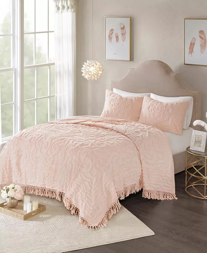 The Madison Park Laetitia 3-Piece Cotton Chenille Coverlet Set provides a soft and alluring update to your bedroom decor. A decorative fringe hem adds dimension, while matching shams beautifully coordinate with the cotton coverlet to create a stunning Boho and Globally inspired look. Product Features Coverlet - 90" x 90", 2 Standard sham - 20" x 26" Includes - Coverlet, 2 Shams 100% cotton with an elegant chenille medallion design centered on the bed Fabric Pattern - Solid Bedding Feature - Textured Coverlet/Sham - 100% Cotton Machine Washable Imported