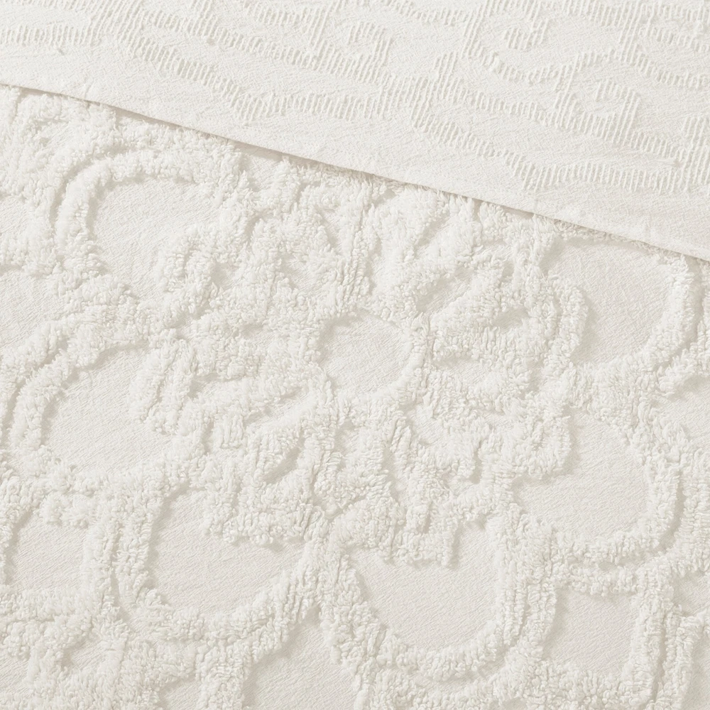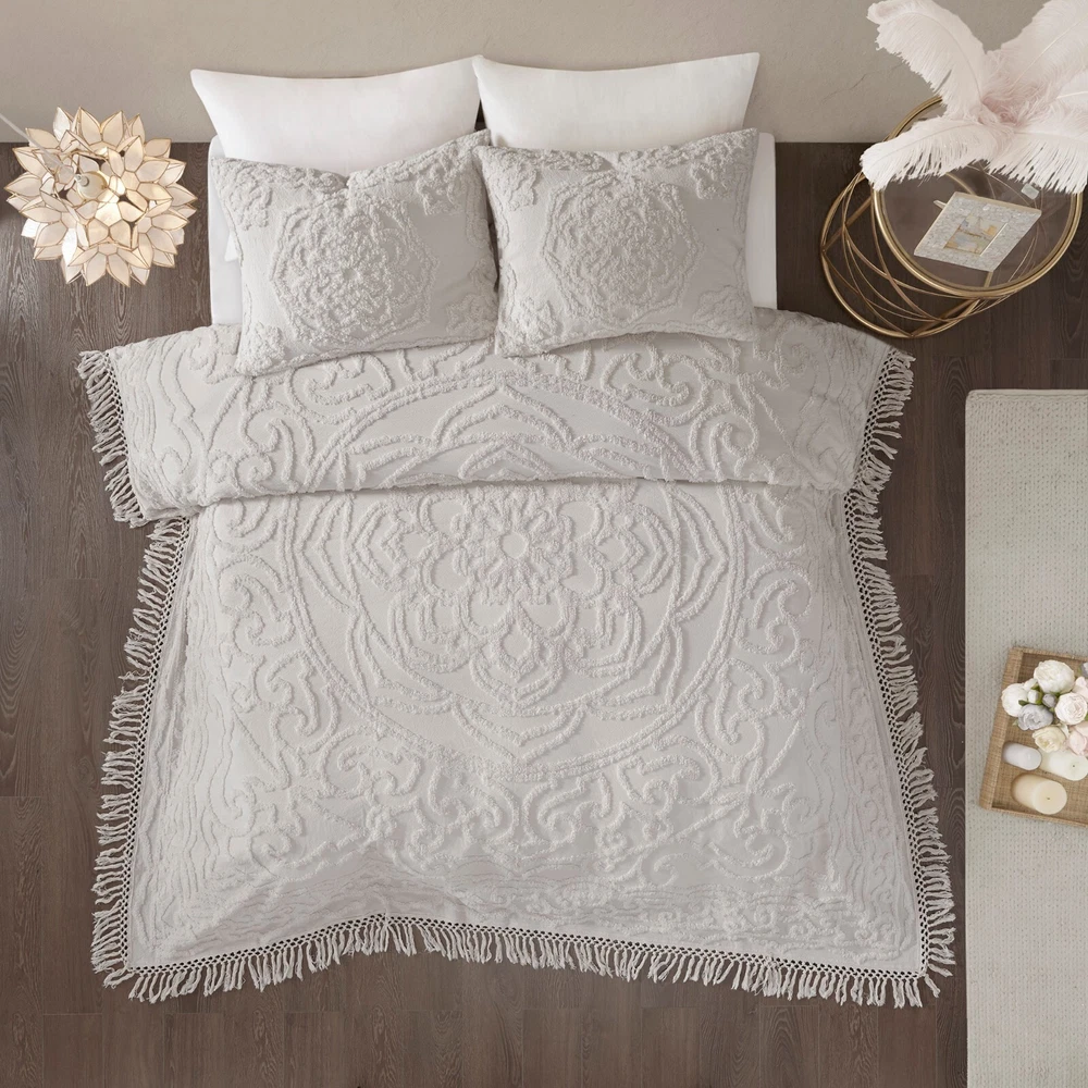Store Categories Store Categories Bedding Comforters Decorative Pillows Duvet Covers Quilts & Coverlets Sheets Blankets & Throws Mattress Pads Pillows Home Decor Window Treatments Wall Art Home Accents Furniture Beds Dining Seating Ottomans & Benches Accent Chairs Accent Tables Dining Tables Sofas Bath Bath Robes Shower Curtains Towels Bath Rugs Bath Accessories Apparel Pajama Sets Nightgowns Rugs Rugs & Carpets Lighting Lamp Pendant Other Product Overview Details DESCRIPTION The Madison Park Laetitia Tufted Cotton Chenille Medallion Comforter Set provides an alluring shabby chic update to your bedroom. This globally inspired comforter features a 100% cotton face and reverse with a tufted chenille medallion centered on top of the bed. The 2 matching shams (1 in Twin/Twin XL) coordinate with the cotton comforter to complete the boho look. Perfect for all season use, this bedding set is also OEKO-TEX certified, meaning it does not contain any harmful substances or chemicals to ensure quality comfort and wellness. Due to the nature of the chenille fabric, some shedding will occur naturally in the first 3-4 washes. Items in the set may come in a rolled or compressed packaging, which will need to be fluffed up or steam ironed before use to remove wrinkles. FEATURES • Globally inspired/Shabby Chic/Boho lifestyle solid cotton chenille in large medallion pattern at the center • Cover fabric is 100% cotton with 100% polyester filling • Design for all season use, add a coverlet layer for cold weather • Set includes 1 comforter and 2 matching shams (1 in Twin/Twin XL) • Oeko-Tex Certified, includes no harmful substances or chemicals • Due to the nature of the chenille fabric, some shedding will occur naturally in the first 3-4 washes • Machine washable and steam iron for wrinkle removal • Items in this set may come in rolled or compressed packaging and will need to be fluffed up MATERIAL Cotton chenille with tufted technique, cotton solid reverse, polyester filling Available Sizes: Twin/Twin XL Comforter Set includes: 1 Comforter: 68" W x 92" L 1 Standard Sham: 20" W x 26" L Full/Queen Comforter Set includes: 1 Comforter: 90" W x 90" L 2 Standard Shams: 20" W x 26" L King/California King Comforter Set includes: 1 Comforter: 104" W x 92" L 2 King Shams: 20" W x 36" L Bedding Comforters Decorative Pillows Duvet Covers Quilts & Coverlets Sheets Blankets & Throws Mattress Pads Pillows Home Decor Window Treatments Wall Art Home Accents Furniture Beds Dining Seating Ottomans & Benches Accent Chairs Accent Tables Dining Tables Sofas Bath Bath Robes Shower Curtains Towels Bath Rugs Bath Accessories Rugs Rugs & Carpets Lighting Lamp Pendant Product Overview Product Details DESCRIPTION The Madison Park Laetitia Tufted Cotton Chenille Medallion Comforter Set provides an alluring shabby chic update to your bedroom. This globally inspired comforter features a 100% cotton face and reverse with a tufted chenille medallion centered on top of the bed. The 2 matching shams (1 in Twin/Twin XL) coordinate with the cotton comforter to complete the boho look. Perfect for all season use, this bedding set is also OEKO-TEX certified, meaning it does not contain any harmful substances or chemicals to ensure quality comfort and wellness. Due to the nature of the chenille fabric, some shedding will occur naturally in the first 3-4 washes. Items in the set may come in a rolled or compressed packaging, which will need to be fluffed up or steam ironed before use to remove wrinkles. FEATURES • Globally inspired/Shabby Chic/Boho lifestyle solid cotton chenille in large medallion pattern at the center • Cover fabric is 100% cotton with 100% polyester filling • Design for all season use, add a coverlet layer for cold weather • Set includes 1 comforter and 2 matching shams (1 in Twin/Twin XL) • Oeko-Tex Certified, includes no harmful substances or chemicals • Due to the nature of the chenille fabric, some shedding will occur naturally in the first 3-4 washes • Machine washable and steam iron for wrinkle removal • Items in this set may come in rolled or compressed packaging and will need to be fluffed up MATERIAL Cotton chenille with tufted technique, cotton solid reverse, polyester filling Available Sizes: Twin/Twin XL Comforter Set includes: 1 Comforter: 68" W x 92" L 1 Standard Sham: 20" W x 26" L Full/Queen Comforter Set includes: 1 Comforter: 90" W x 90" L 2 Standard Shams: 20" W x 26" L King/California King Comforter Set includes: 1 Comforter: 104" W x 92" L 2 King Shams: 20" W x 36" L