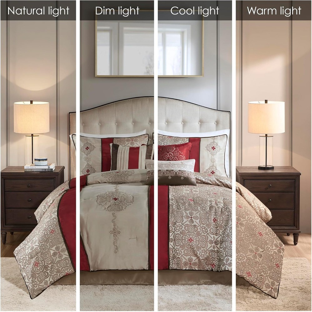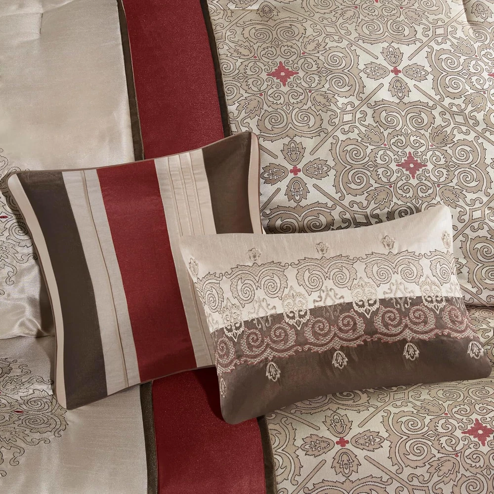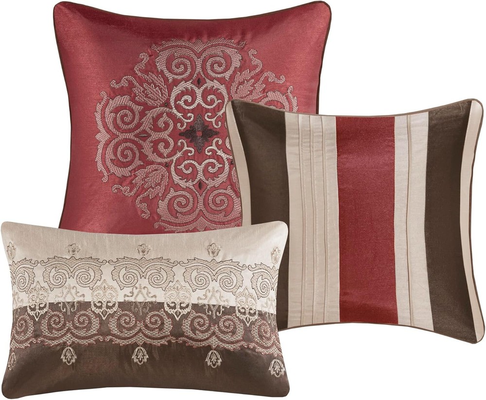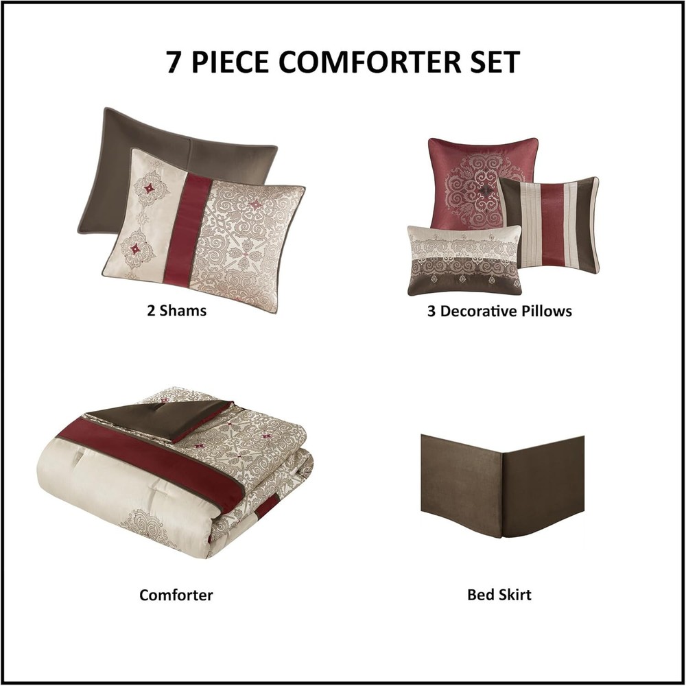 ***Item Description:*** 100% Polyester Imported Classically stylish, the Madison Park Donovan 7 Piece Comforter Set turns your bedroom into a luxurious getaway. The jacquard woven comforter showcases an elegant color palette of three embroidered medallions Beautiful faux silk fabric is not only giving a natural sheen finish, but also wrinkle resistant and colorfast. Set Includes: 1 Comforter: 104"W x 92"L, 2 King Shams: 20"W x 36"L, 1 Bed Skirt: 78"W x 80"L plus 15"D, 3 Decorative Pillows: 18"W x 18"L/16"W x 16"L/12"W x 18"L Care instructions: machine washable, spot clean pillow
