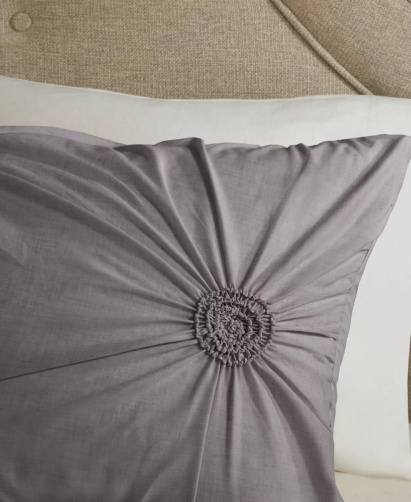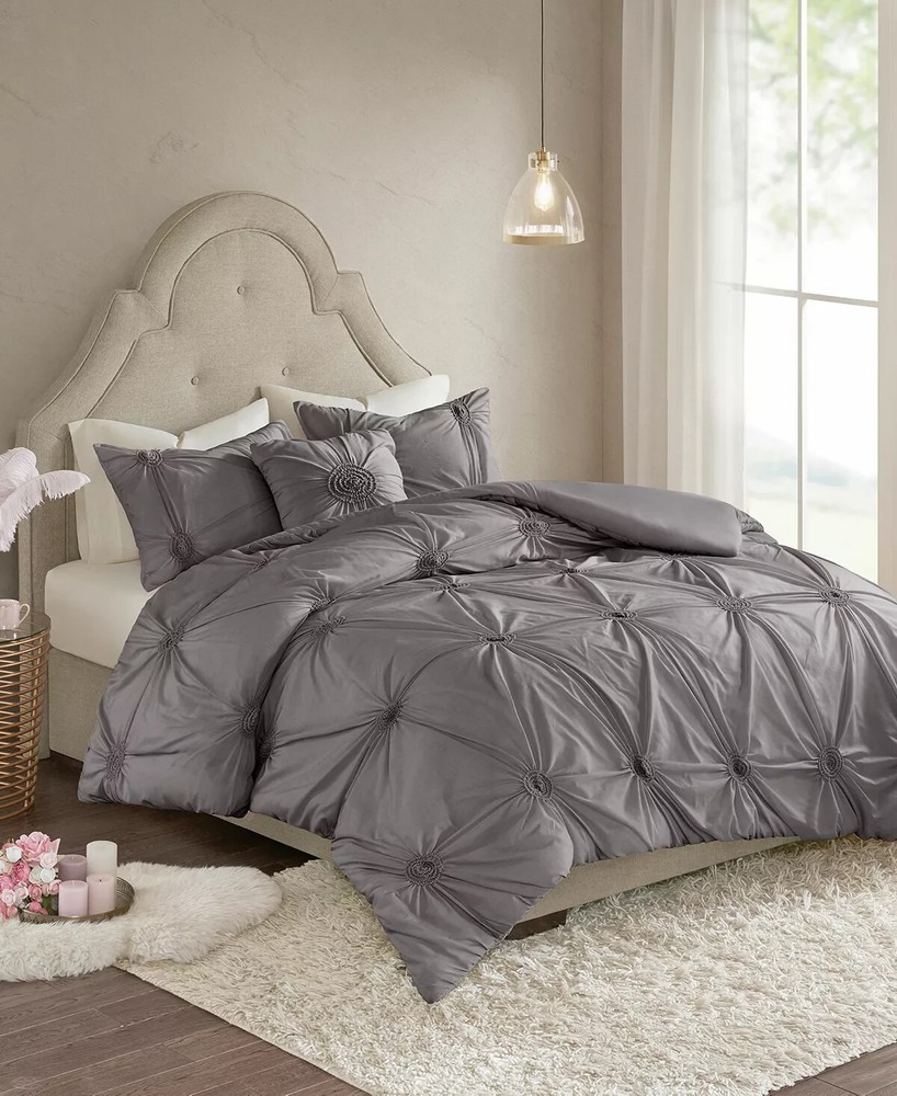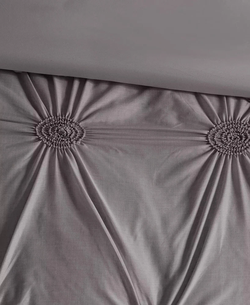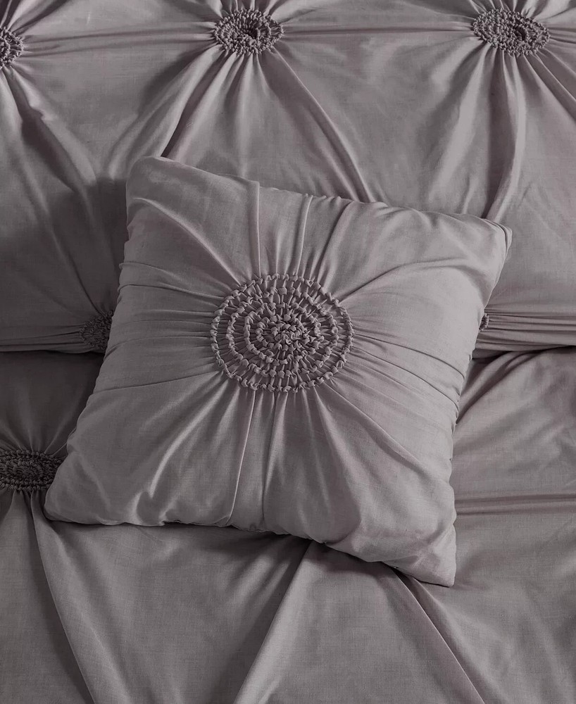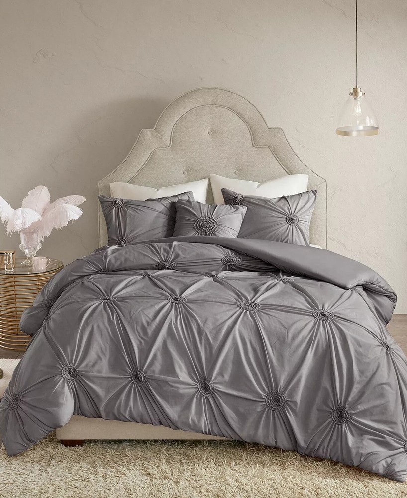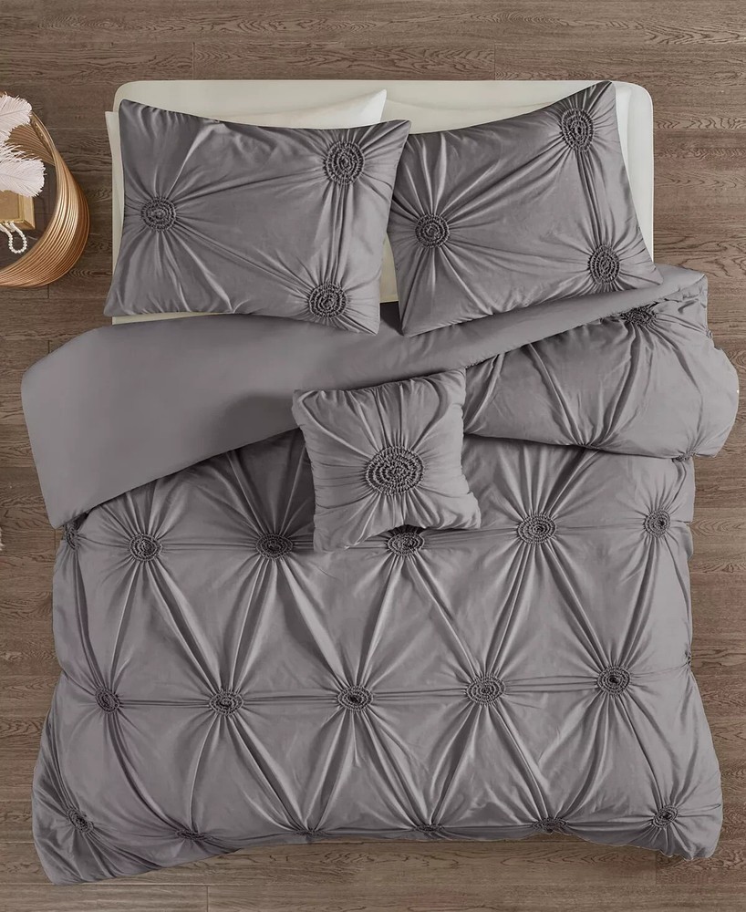 Color: Gray Size: Full / Queen Grace your bedroom with the beauty and comfort of the Madison Park Leila 4 Piece Duvet Cover Set. The gorgeous duvet cover flaunts tufting and ruched detailing in a puckered diamond design, for a charming textural look. Button closures. duvet cover, 2 standard shams, decorative pillow duvet cover:90" x 90", standard sham (2):20" x 26", decorative pillow:18" x 18" 80% polyester, 20% cotton ; Decorative pillow fill: 100% polyester Machine Washable, Spot Clean Pillows Imported