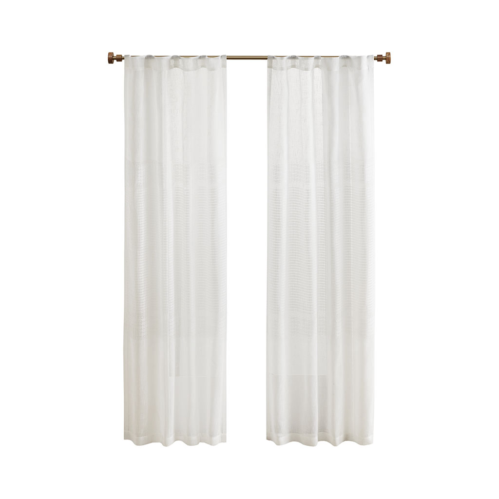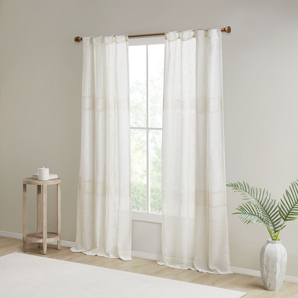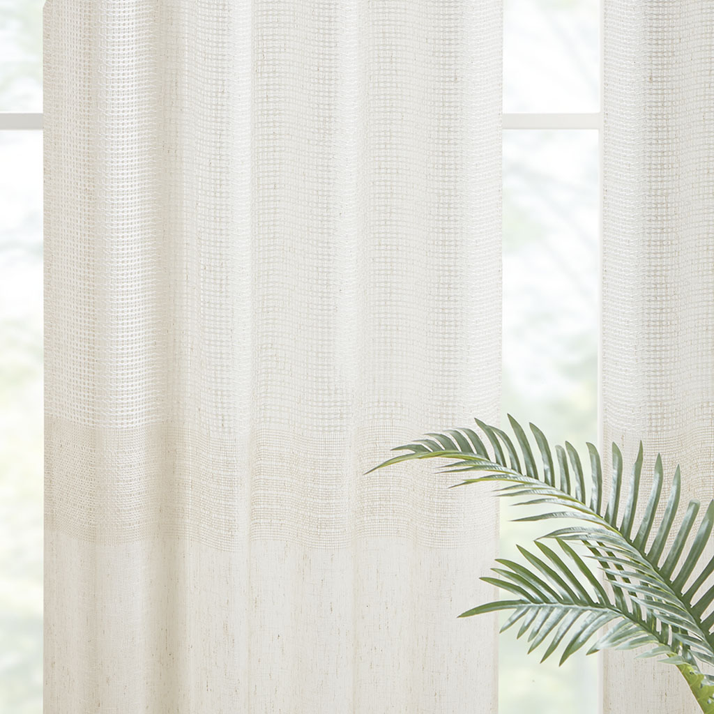 Madison Park Aida Yarn Dye Sheer Curtain Panel Pair 2-PK 37x84 2-PK 37x95 DESCRIPTION Create a soft and graceful allure in your home with the Madison Park Aida Yarn Dye Sheer Window Panel Pair. This sheer panel pair features a beautiful woven linen texture to create an airy look that drapes softly from your window; while handcrafted detailing creates a beautiful tonal color block pattern, giving each sheer panel a stylish and Boho-inspired touch. A rod pocket top finish makes these panels easy to hang, or hang on back tabs for a more tailored look; each top finish fits up to a 1.25" diameter rod. Machine washable for easy care; this sheer window panel pair is also OEKO-TEX certified, meaning it does not contain any harmful substances or chemicals to ensure quality comfort and wellness. FEATURES • Beautiful Linen texture woven window sheer pair • Lightweight and soft drape handcrafted detailing window pair in soft neutral hues • Set of 2, each panel measures 37" wide • Oeko-Tex Certified, includes no harmful substances or chemicals • Rod pocket/back tab top finish fits up to 1.25" diameter rod • Machine washable for easy care • Panel pair value set ready to hang MATERIAL DETAILS 100% Polyester CARE INSTRUCTIONS Machine washable in mesh laudry bag, spot clean is recommended Available Sizes (In Inches): 84" Panel Size: Includes 2 Window Panels measuring 37"W x 84"L (2). 95" Panel Size: Includes 2 Window Panels measuring 37"W x 95"L (2).