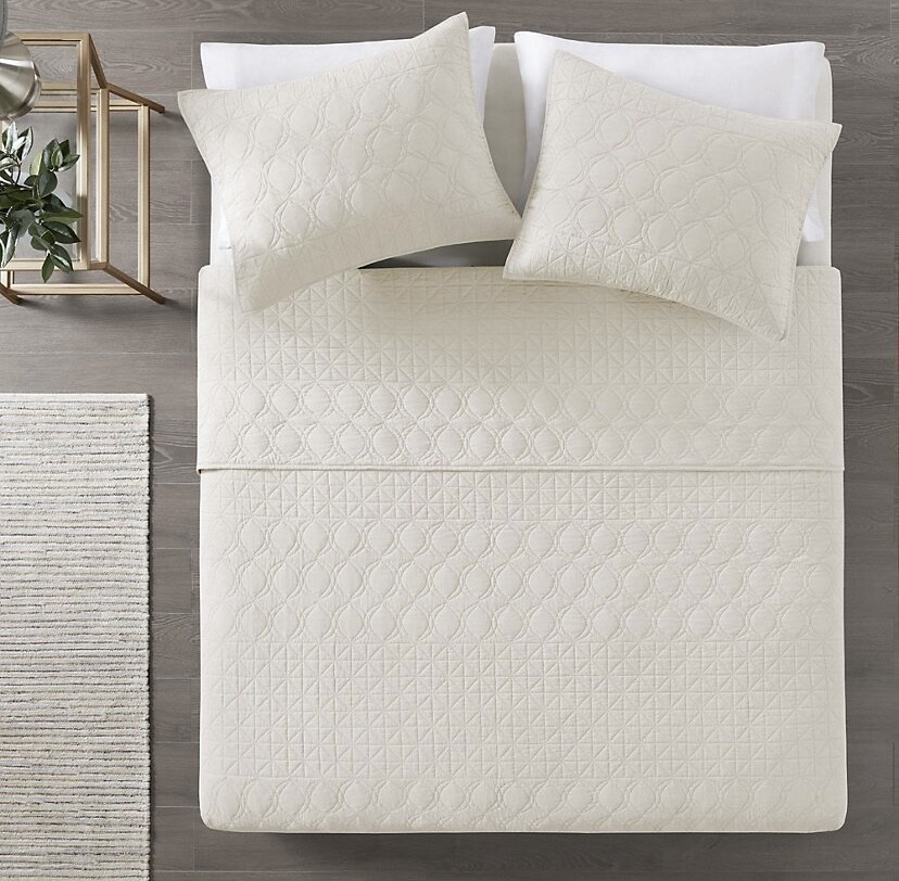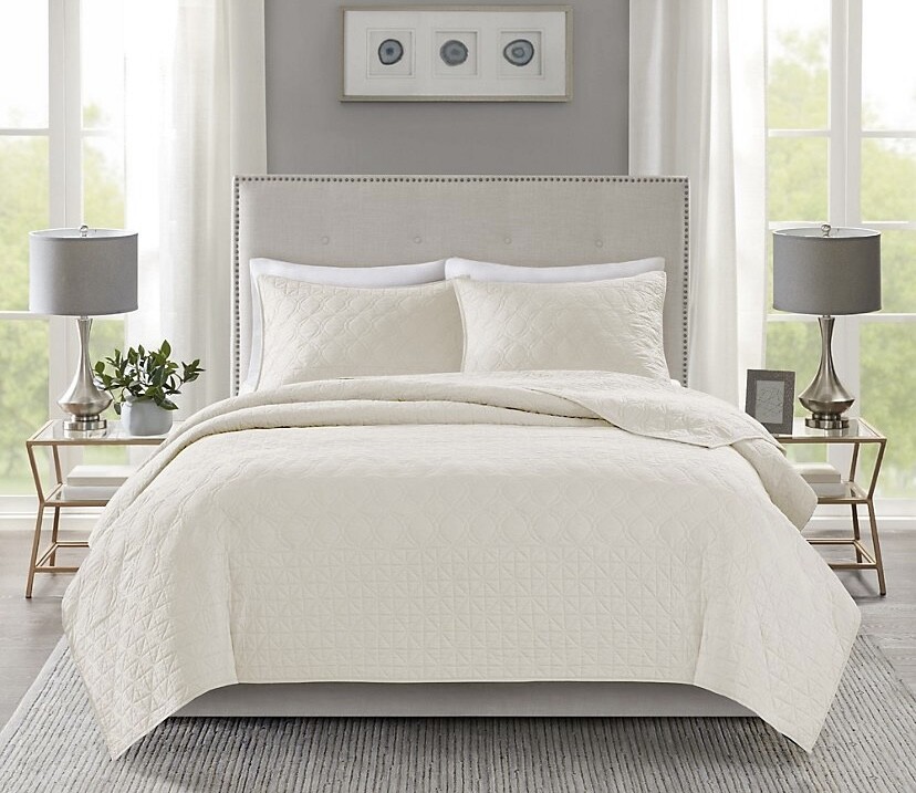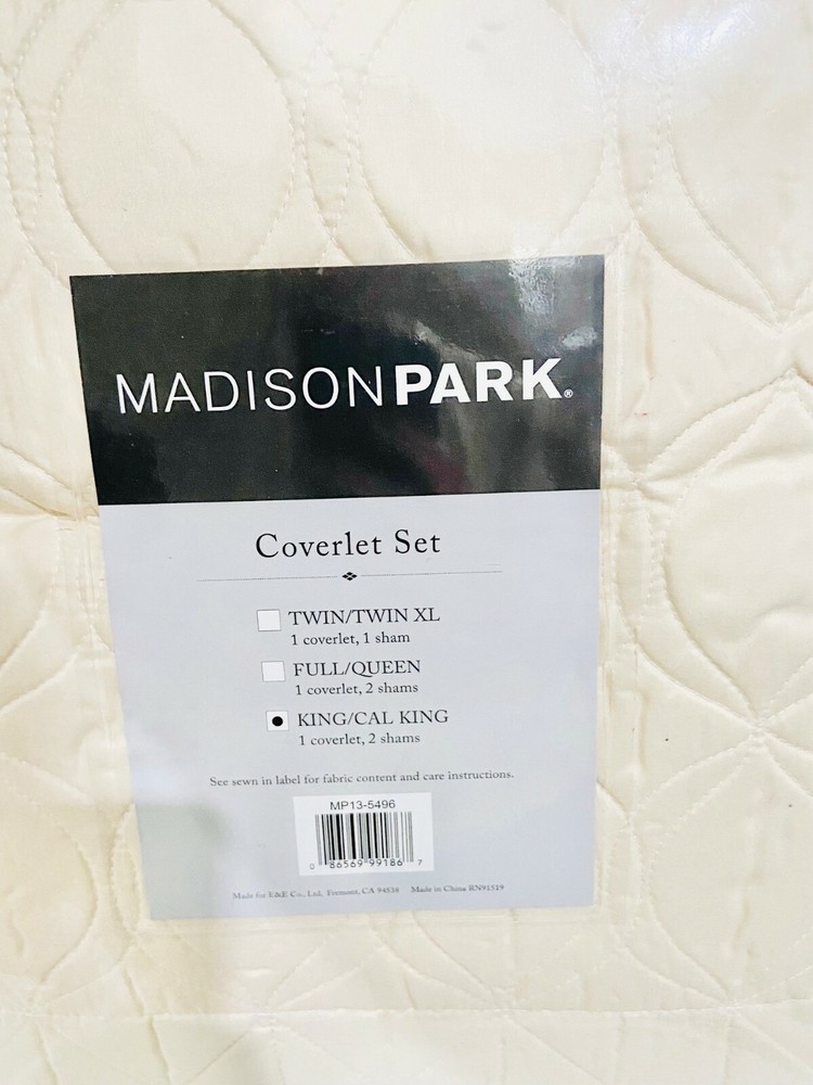 Madison Park Linnette King/California King Coverlet Set in Ivory Casual elegance meets uncompromising comfort with the Madison Park Linnette Coverlet Set. Quilted with a distinctive mix of geometric and ogee patterns across the soft, prewashed fabric, the cotton-rich filling makes it an incredibly cozy layer. Elegantly elevate the look and feel of your bed with this luxuriously-soft layer A geometric design alternates with a circlet ogee pattern for a distinctive textural look Pillow shams coordinate with the top of the bed for a complete look Anti-microbial treatment helps reduce the growth of odor causing bacteria and keeps fabric lasting longer King/California King coverlet set includes: 104" W x 94" L coverlet Two 20" W x 36" L king pillow shams 100% polyester Machine wash 90% cotton/10% polyester fill 100% authentic..... Item may have Minor Blemishes..... Item has been removed from original packaging and handled for inspection Please anticipate signs of handling. Outer packaging may have cosmetic imperfections or missing paperwork . This item maybe a floor model or customer return....... Please refer to photo... What you see is what you get... PAYMENTS Your payment must be submitted within 3 days of our notification. We follow eBay's Non-Paying Policies. A unpaid case will be opened with ebay. Please review and agree with all our policies contained on this page before bidding. You will not be held responsible for your bid. ALL SALES ARE FINAL DUE TO THE NATURE OF THE SALE SHIPPING AND HANDLING We utilize FedEx or USPS for our shipping services This item has been opened from original packaging Original packaging may show damage This merchandise is generally customers returns, overstock items, or retail shelf pulls Some items may be tested to ensure it is in working condition comes with everything you see in the photos (if you don't see it.. It doesn't come with it) GENERAL Bidder is responsible to ask any questions prior of bidding. We do our best to give an accurate description of the items being auctioned We highly recommend bidders to read the description and bid accordingly New—Open box: The item is in Good, new condition with no functional defects. The item may be missing original packaging and may have been used for testing or demo purposes. The item includes accessories found with the original product. See the listing for full details and a description. Open box: The item is in Good condition with no wear. The item may be missing the original packaging or protective wrapping, or it may not be in the original packaging or sealed. The item includes original accessories (as seen in photos). The item may be a factory second. See the listing for full details and a description. Used: The item was previously used. The item may have some signs of cosmetic wear, but it is fully operational and functions as intended. This item may be a floor model or store return that was used. See the listing for full details and a description of any imperfections.