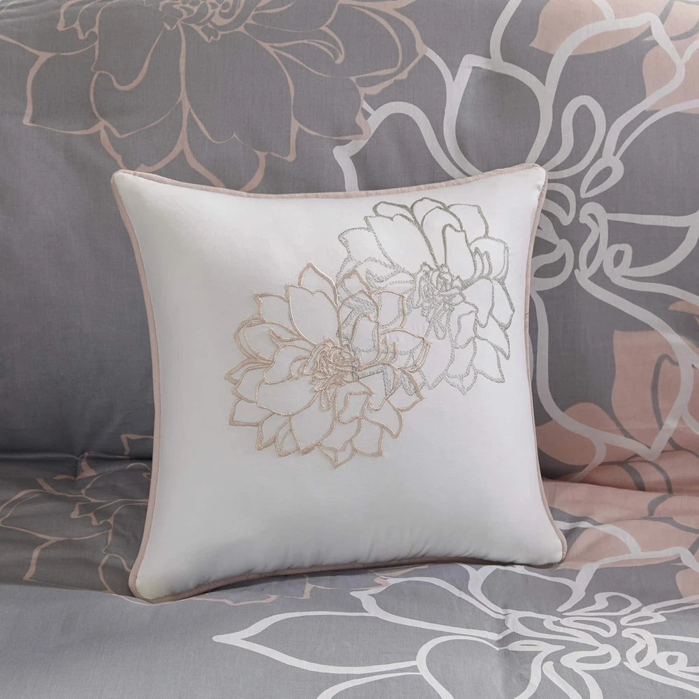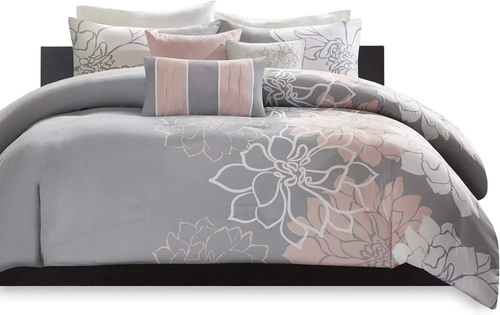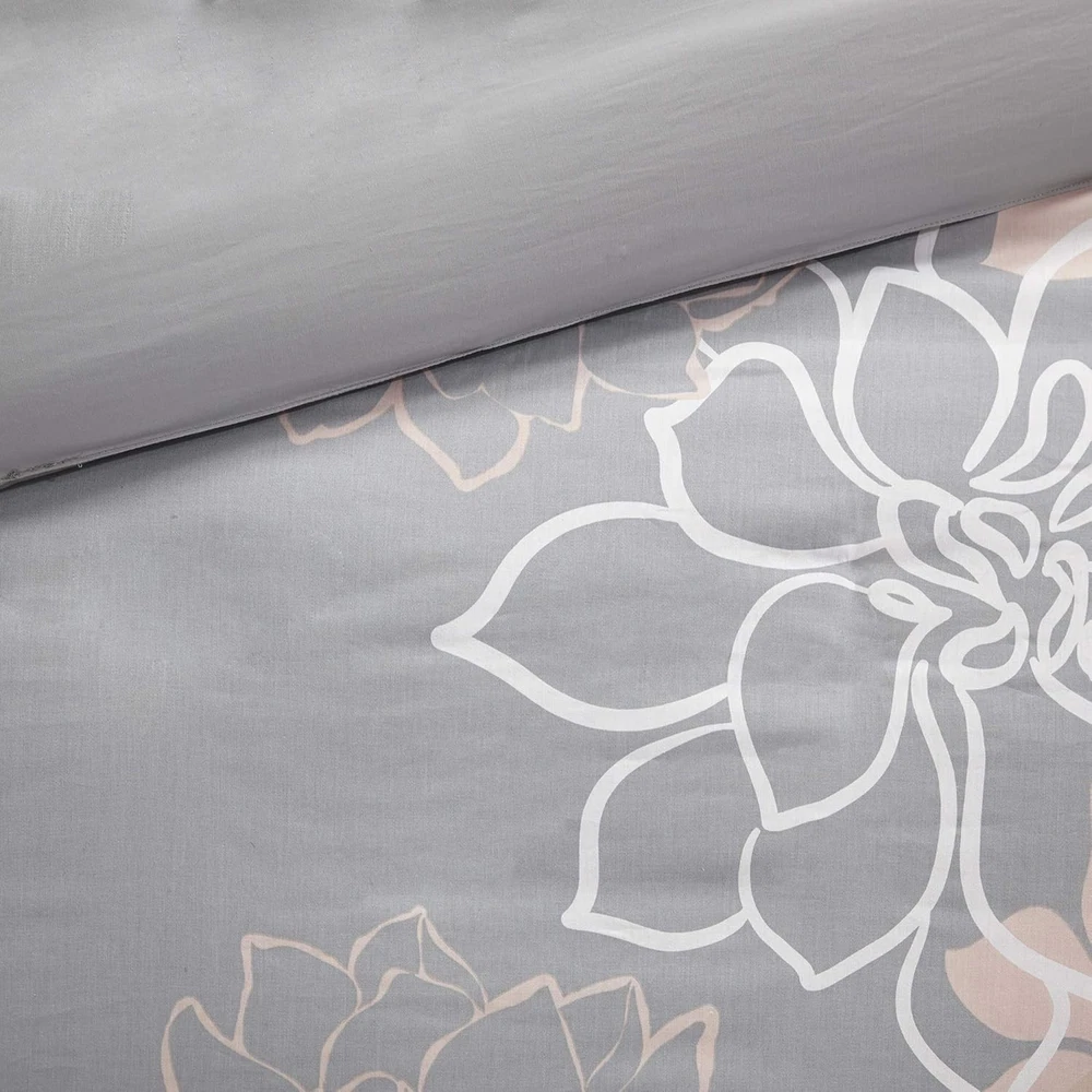 Madison Park Lola 100% Cotton Duvet Set King(104"x92"), Blush/Grey Product Details Size: King(104"x92") Material: Cotton Color: Blush/Grey Pattern: Floral Brand: Madison Park Number of Pieces: 6 Special Feature: Breathable Style: Traditional Included Components: Duvet Cover Closure Type: Button Thread Count: 200 Age Range (Description): Adult Occasion: everyday/casual Product Care Instructions: Machine wash cold on gentle cycle, tumble dry on low heat, do not bleach Theme: Floral Cartoon Character: Floral Seasons: All Item dimensions L x W x H: 104 x 92 x 0.13 inches Item Weight: 0.01 Ounces Weave Type: Twill Pillowcase Quantity: 5 Unit Count: 6.0 Count Sham Quantity: 2 Item Display Dimensions: 92 x 2 x 104 x 0.13 inches Manufacturer: Madison Park Pillowcase Length: 36 Inches Product Dimensions: 104 x 92 x 0.13 inches Item Weight: 0.01 ounces Department: unisex-adult Country of Origin: China Item model number: MP12-5674 Fabric Type: Cotton Sateen Refill: polyester Assembly required: No Batteries required: No Cotton Sateen The Madison Park Lola 6 Piece Printed Duvet Cover Set brings beauty and grace to your bedroom. A large scale printed floral motif is displayed on the cotton duvet cover and shams, for a chic transitional look. Cotton fabric that is Oeko-Tex certified to be free of any chemicals and harmful substance. Equipped with 4 corner ties and button closure to secure the filled insert from shifting Set includes: 1 Duvet Cover: 104"W x 92"L, 3 Decorative Pillows: 12"W x 20"L/18"W x 18"L/16"W x 16"L, 2 King Shams: 20"W x 36"L Care instructions: Machine wash cold, gentle cycle, and separately. Do not bleach. Tumble dry low, remove promptly. Do not iron. Spot clean pillow. If there is no free movement in the washer or dryer, use large capacity commercial washer/dryer. The Madison Park Lola 6 Piece Printed Duvet Cover Set transforms your bedroom into a beautiful and graceful space. A gorgeous floral print pops against the solid cotton duvet cover and shams for a stunning transitional look. Three decorative pillows with embroidered details and fabric manipulation add texture and dimension to the bed. A button closure secures a comforter insert within the duvet cover and inside corner ties prevent it from shifting (insert is NOT included). This bedding set is also OEKO-TEX certified, meaning it is free of any harmful substances or chemicals for your comfort and wellness. Items in the set may come in a rolled or compressed packaging, which will need to be fluffed up or steam ironed before use to remove wrinkles. This bedding set is available in 3 different colorways: Yellow: soft white and yellow hue pops against taupe grey ground; Grey/Peach: soft white and peach hue pops against grey ground; Purple: soft white and purple hue pops against taupe grey ground.