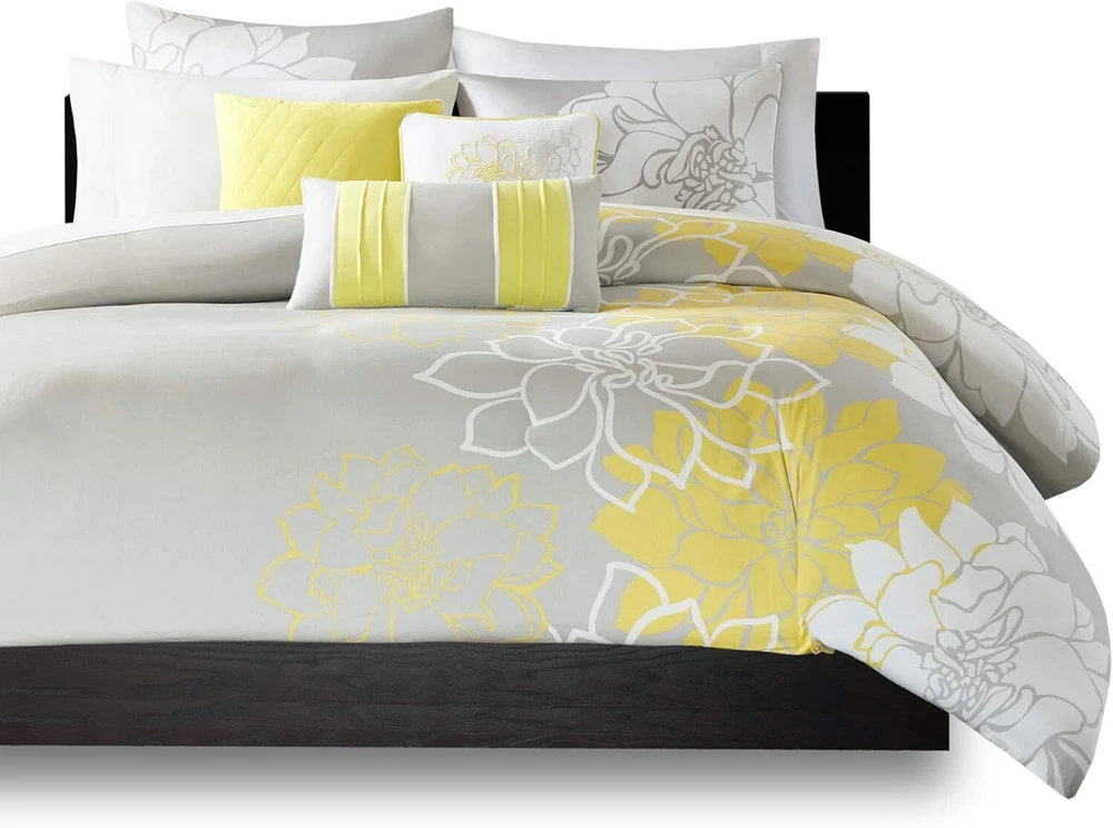 Madison Park Lola 100% Cotton Duvet Set Queen(90"x90"), Yellow/Grey Product Details Size: Queen(90"x90") Material: Cotton Color: Yellow/Grey Pattern: Nature / Floral Brand: Madison Park Number of Pieces: 6 Special Feature: Breathable Style: Traditional Included Components: Duvet Cover Closure Type: Zipper Age Range (Description): Adult Product Care Instructions: Machine Wash Theme: Floral Cartoon Character: Floral Seasons: All Item dimensions L x W x H: 90 x 90 x 0.13 inches Item Weight: 8.04 Pounds Unit Count: 6.0 Count Item Display Dimensions: 90 x 90 x 0.13 inches Manufacturer: Madison Park Product Dimensions: 90 x 90 x 0.13 inches Item Weight: 8.04 pounds Department: Female Country of Origin: China Item model number: MP12-176 Fabric Type: 100% Cotton Refill: cotton Specifications: certified frustration-free Assembly required: No Batteries required: No Import: Imported 100% Cotton Imported PRODUCT FEATURES- This duvet collection features an overscaled floral print design printed on 100% cotton fabric for a super soft hand feel. The reverse of the duvet is a soft white color that coordinates with the grey, white and yellow from the face of the duvet SUPERIOR QUALITY FABRIC- 100% Cotton sateen front and cotton pecale reverse to offer 100% natural soft hand feel PACKAGE AND MEASUREMENTS- 1 Duvet Cover:90x90", 3 Decorative Pillows:18x18"/16x16"/12x20", 2 Standard Shams:20x26 + 2" (2) YOU CAN SEE AND FEEL LUXURY : Create a welcoming environment and a restful feeling in the bedroom with this top quality and affordable bedding Collection. You’ll find yourself getting a restful night of sleep with our 100% cotton duvet set EASY CARE- Machine Wash gentle, do not bleach. Dry on low, warm iron if necessary. Lola is the perfect solution to an updated, modern print look. This duvet collection features an overscaled floral print design printed on 100% cotton fabric for a super soft hand feel. The reverse of the duvet is a soft white color that coordinates with the grey, white and yellow from the face of the duvet. The decorative pillows feature embroidery and piecing details. A duvet cover is a protective cover for your comforter, most likely for your down comforter. Sometimes it’s referred to as a comforter cover. Duvet covers are not filled. It has an opening where you can insert your comforter. Filler not included.
