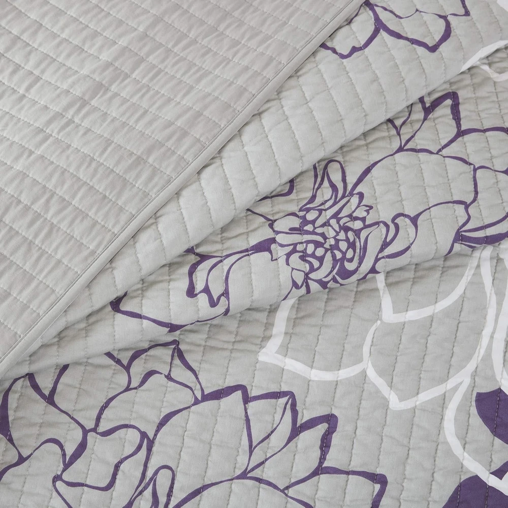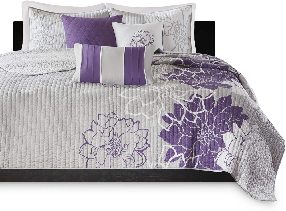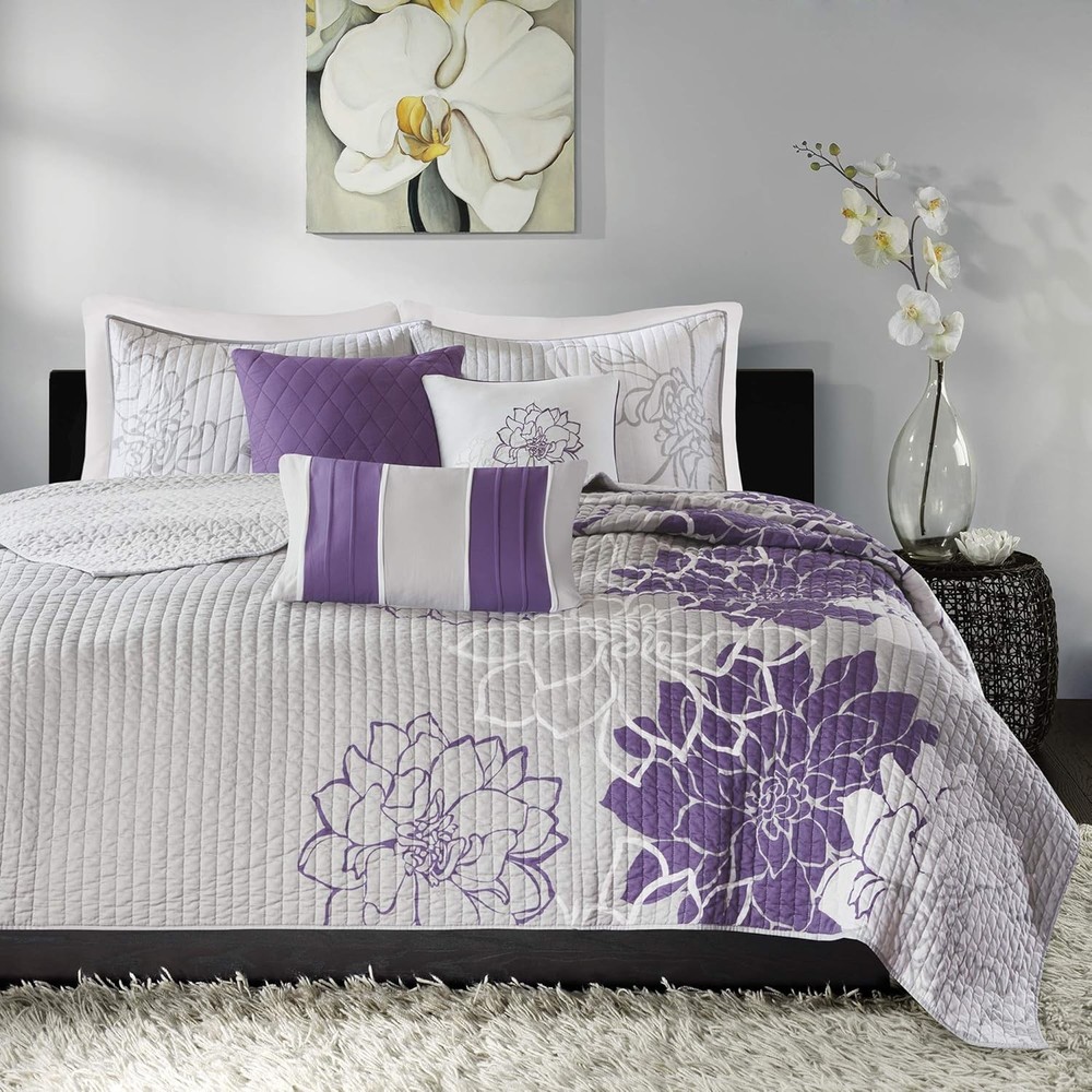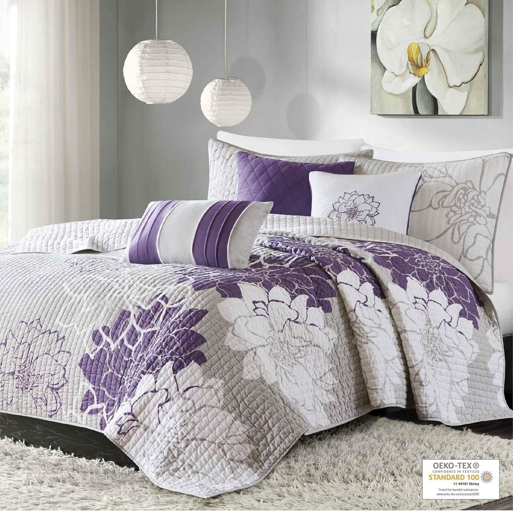 This is an OpenBoxed Item. Our Opened Box items are in great condition. Typically the item is 100% brand new in a replaced box. A great way to get a lot more for your money. All our items are 100% guaranteed! So buy worry free! Madison Park Lola 100% Cotton King/Cal King(104"x94"), Purple Product Details Size: King/Cal King(104"x94") Included Components: Quilt, 2 King Shams, 3 Decorative Pillows Color: Lola Purple Style: Coverlet Set Brand: Madison Park Theme: Floral Pattern: Floral Material: Cotton Fabric Type: Cover: 100% Polyester Filling: 90% Cotton/10% Other Fiber Number of Pieces: 6 Seasons: All Product Care Instructions: Machine Wash Manufacturer: Madison Park Item dimensions L x W x H: 104 x 94 x 0.25 inches Product Dimensions: 104 x 94 x 0.25 inches Item Weight: 11.9 pounds Department: unisex-adult Country of Origin: China Item model number: MP13-2313 Refill: cotton Specifications: certified frustration-free Assembly required: No Batteries required: No Import: Imported Cover: 100% Polyester Filling: 90% Cotton/10% Other Fiber Imported The Madison Park Lola 6 Piece Reversible Cotton Printed Coverlet Set brings beauty and grace to your bedroom. A large scale printed floral motif is displayed on the cotton coverlet and shams, for a chic transitional look. Naturally breathable and lightweight cotton fabric that is Oeko-Tex certified to be free of any chemicals and harmful substance for a perfect all season bedding. Set includes: 1 Coverlet: 104"W x 94"L, 2 King Shams: 20"W x 36"L + 2"D, 3 Decorative Pillows: 18"W x 18"L/16"W x 16"L/12"W x 20"L Care instructions: Machine wash cold, gentle cycle, and separately. Do not bleach. Tumble dry low, remove promptly. Do not iron. Spot clean pillow. If there is no free movement in the washer or dryer, use large capacity commercial washer/dryer. The Madison Park Lola 6 Piece Reversible Cotton Printed Coverlet Set transforms your bedroom into a beautiful and graceful space. A gorgeous floral print pops against the solid cotton coverlet and shams for a stunning transitional look. Three decorative pillows with embroidered details and fabric manipulation add texture and dimension to the bed. This bedding set is also OEKO-TEX certified, meaning it is free of any harmful substances or chemicals for your comfort and wellness. This bedding set is available in 4 different colorways: Aqua: soft white and aqua hue pops against taupe grey ground; Yellow: soft white and yellow hue pops against taupe grey ground; Grey/Peach: soft white and peach hue pops against grey ground; Purple: soft white and purple hue pops against taupe grey ground.