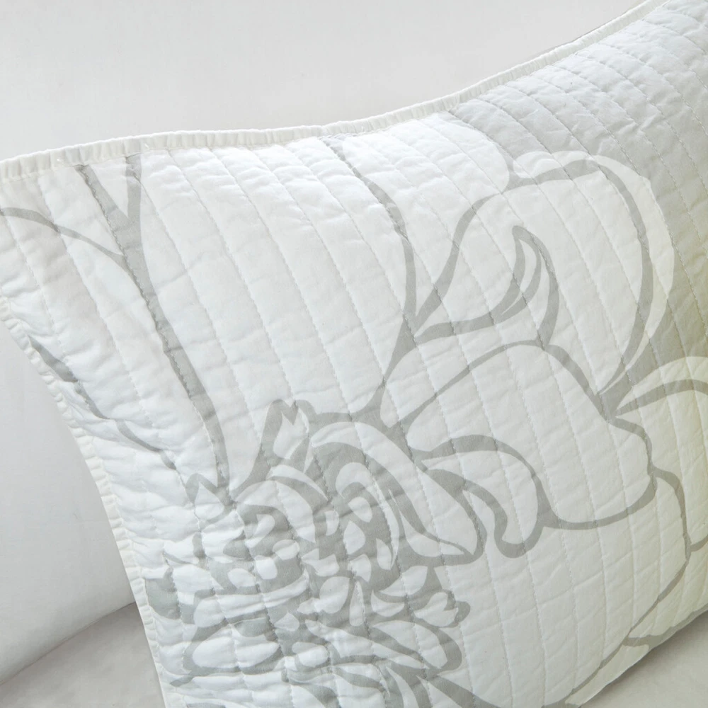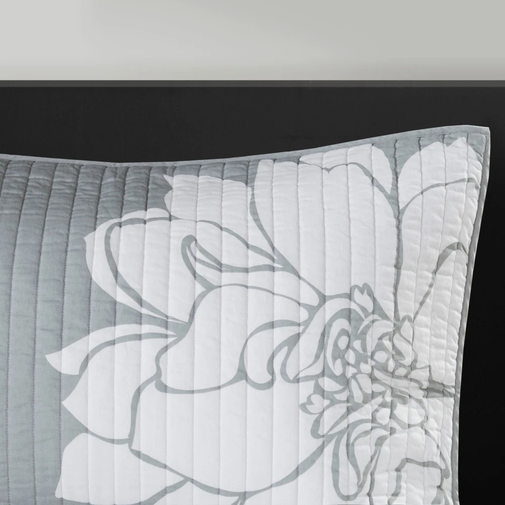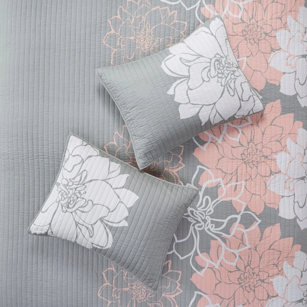 Store Categories Store Categories Bedding Comforters Decorative Pillows Duvet Covers Quilts & Coverlets Sheets Blankets & Throws Mattress Pads Pillows Home Decor Window Treatments Wall Art Home Accents Furniture Beds Dining Seating Ottomans & Benches Accent Chairs Accent Tables Dining Tables Sofas Bath Bath Robes Shower Curtains Towels Bath Rugs Bath Accessories Apparel Pajama Sets Nightgowns Rugs Rugs & Carpets Lighting Lamp Pendant Other Product Overview Details DESCRIPTION The Madison Park Lola 6 Piece Reversible Cotton Printed Quilt Set transforms your bedroom into a beautiful and graceful space. A gorgeous floral print pops against the solid cotton quilt and shams for a stunning transitional look. Three decorative pillows with embroidered details and fabric manipulation add texture and dimension to the bed. This bedding set is also OEKO-TEX certified, meaning it is free of any harmful substances or chemicals for your comfort and wellness. This bedding set is available in 4 different colorways: Aqua: soft white and aqua hue pops against taupe grey ground; Yellow: soft white and yellow hue pops against taupe grey ground; Grey/Peach: soft white and peach hue pops against grey ground; Purple: soft white and purple hue pops against taupe grey ground. FEATURES • Set includes quilt, 2 shams, and 3 decorative pillows • Printed cotton quilt set • Printed floral motif on one side, and solid on the reverse side • Reversible cotton sateen quilted quilt with pre-washed cotton filling • Available in Grey/Peach, Light Grey/Aqua, Light Grey/Purple, and Light Grey/Yellow • Perfect for summer use or layer it on to a comforter for extra warmth • Oeko-Tex Certified, includes no harmful substances or chemicals • Machine washable for easy care MATERIAL Printed Cotton face, Cotton/Poly back quilt and shams, Cotton filling; cotton/poly pillows Available Sizes: Full/Queen Quilt set includes: 1 Quilt: 90"W x 90"L 2 Standard Shams: 20"W x 26"L + 2"D 1 Decorative Pillow: 18"W x 18"L 1 Decorative Pillow: 16"W x 16"L 1 Decorative Pillow: 12"W x 20"L King/California King Quilt set includes: 1 Quilt: 104"W x 94"L 2 King Shams: 20"W x 36"L + 2" 1 Decorative Pillow: 18"W x 18"L 1 Decorative Pillow: 16"W x 16"L 1 Decorative Pillow: 12"W x 20"L Bedding Comforters Decorative Pillows Duvet Covers Quilts & Coverlets Sheets Blankets & Throws Mattress Pads Pillows Home Decor Window Treatments Wall Art Home Accents Furniture Beds Dining Seating Ottomans & Benches Accent Chairs Accent Tables Dining Tables Sofas Bath Bath Robes Shower Curtains Towels Bath Rugs Bath Accessories Rugs Rugs & Carpets Lighting Lamp Pendant Product Overview Product Details DESCRIPTION The Madison Park Lola 6 Piece Reversible Cotton Printed Quilt Set transforms your bedroom into a beautiful and graceful space. A gorgeous floral print pops against the solid cotton quilt and shams for a stunning transitional look. Three decorative pillows with embroidered details and fabric manipulation add texture and dimension to the bed. This bedding set is also OEKO-TEX certified, meaning it is free of any harmful substances or chemicals for your comfort and wellness. This bedding set is available in 4 different colorways: Aqua: soft white and aqua hue pops against taupe grey ground; Yellow: soft white and yellow hue pops against taupe grey ground; Grey/Peach: soft white and peach hue pops against grey ground; Purple: soft white and purple hue pops against taupe grey ground. FEATURES • Set includes quilt, 2 shams, and 3 decorative pillows • Printed cotton quilt set • Printed floral motif on one side, and solid on the reverse side • Reversible cotton sateen quilted quilt with pre-washed cotton filling • Available in Grey/Peach, Light Grey/Aqua, Light Grey/Purple, and Light Grey/Yellow • Perfect for summer use or layer it on to a comforter for extra warmth • Oeko-Tex Certified, includes no harmful substances or chemicals • Machine washable for easy care MATERIAL Printed Cotton face, Cotton/Poly back quilt and shams, Cotton filling; cotton/poly pillows Available Sizes: Full/Queen Quilt set includes: 1 Quilt: 90"W x 90"L 2 Standard Shams: 20"W x 26"L + 2"D 1 Decorative Pillow: 18"W x 18"L 1 Decorative Pillow: 16"W x 16"L 1 Decorative Pillow: 12"W x 20"L King/California King Quilt set includes: 1 Quilt: 104"W x 94"L 2 King Shams: 20"W x 36"L + 2" 1 Decorative Pillow: 18"W x 18"L 1 Decorative Pillow: 16"W x 16"L 1 Decorative Pillow: 12"W x 20"L