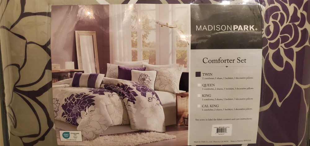 New, unused, packaged comforter set. This set includes a twin-sized comforter, 1 pillow sham, 3 decorative pillows, and 1 bed skirt, all featuring a floral pattern in shades of purple and grey. The set is machine washable and comes with care instructions for easy maintenance.