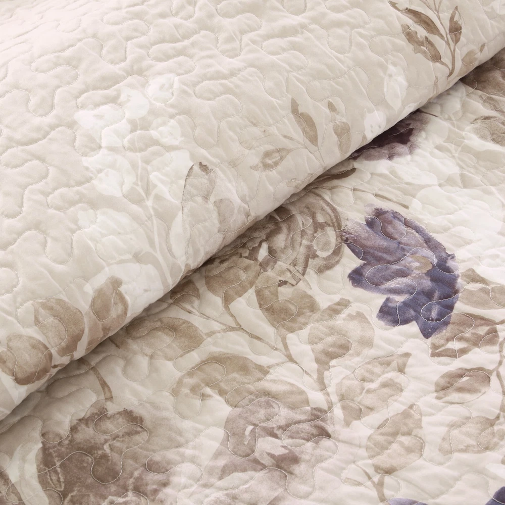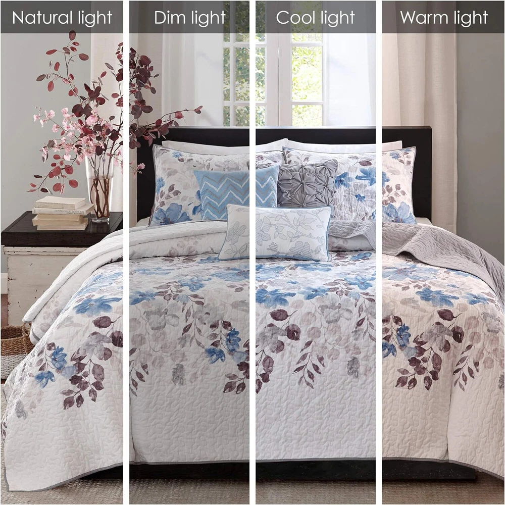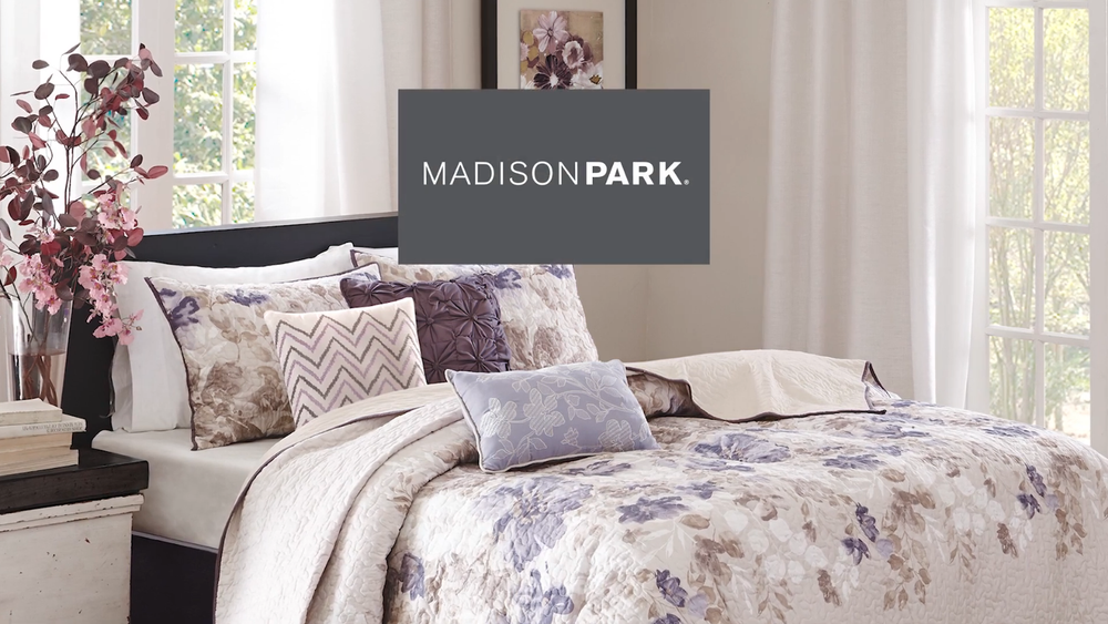 Store Categories Store Categories Bedding Comforters Decorative Pillows Duvet Covers Quilts & Coverlets Sheets Blankets & Throws Mattress Pads Pillows Home Decor Window Treatments Wall Art Home Accents Furniture Beds Dining Seating Ottomans & Benches Accent Chairs Accent Tables Dining Tables Sofas Bath Bath Robes Shower Curtains Towels Bath Rugs Bath Accessories Apparel Pajama Sets Nightgowns Rugs Rugs & Carpets Lighting Lamp Pendant Other Product Overview Details DESCRIPTION Create a calming oasis with the Madison Park Luna 6 Piece Reversible Quilt Set. This beautiful collection features a watercolor floral print across the center of the quilt that dissipates to solid ivory on the top and bottom. Three decorative pillows play up the soft blue and taupes to pull this collection together. FEATURES • Transitional style 6 piece reversible quilt set • Features watercolor floral print and vermicelli quilting • 100% microfiber quilt reverse to soft brushed fabric in solid color • Embroidery and tuffed details on decorative pillows • Set includes 1 quilt, 2 matching shams and 3 decorative pillows • Machine washable for easy care MATERIAL Quilt/Sham: 100% Polyester Microfiber, printed, all over quilting, 100% brushed Polyester reverse, 90% Cotton, 10% other fiber filling Pillow: 100% Polyester shell, Polyester filling Available Sizes: Full/Queen Quilt Set includes: 1 Quilt: 90"W x 90"L 2 Standard Shams: 20"W x 26"L 1 Decorative Pillow: 16"W x 16"L 1 Decorative Pillow: 18"W x 18"L 1 Decorative Pillow: 12"W x 18"L King/California King Quilt Set includes: 1 Quilt: 104"W x 94"L 2 King Shams:2 0"W x 36"L 1 Decorative Pillow: 16"W x 16"L 1 Decorative Pillow: 18"W x 18"L 1 Decorative Pillow: 12"W x 18"L Bedding Comforters Decorative Pillows Duvet Covers Quilts & Coverlets Sheets Blankets & Throws Mattress Pads Pillows Home Decor Window Treatments Wall Art Home Accents Furniture Beds Dining Seating Ottomans & Benches Accent Chairs Accent Tables Dining Tables Sofas Bath Bath Robes Shower Curtains Towels Bath Rugs Bath Accessories Rugs Rugs & Carpets Lighting Lamp Pendant Product Overview Product Details DESCRIPTION Create a calming oasis with the Madison Park Luna 6 Piece Reversible Quilt Set. This beautiful collection features a watercolor floral print across the center of the quilt that dissipates to solid ivory on the top and bottom. Three decorative pillows play up the soft blue and taupes to pull this collection together. FEATURES • Transitional style 6 piece reversible quilt set • Features watercolor floral print and vermicelli quilting • 100% microfiber quilt reverse to soft brushed fabric in solid color • Embroidery and tuffed details on decorative pillows • Set includes 1 quilt, 2 matching shams and 3 decorative pillows • Machine washable for easy care MATERIAL Quilt/Sham: 100% Polyester Microfiber, printed, all over quilting, 100% brushed Polyester reverse, 90% Cotton, 10% other fiber filling Pillow: 100% Polyester shell, Polyester filling Available Sizes: Full/Queen Quilt Set includes: 1 Quilt: 90"W x 90"L 2 Standard Shams: 20"W x 26"L 1 Decorative Pillow: 16"W x 16"L 1 Decorative Pillow: 18"W x 18"L 1 Decorative Pillow: 12"W x 18"L King/California King Quilt Set includes: 1 Quilt: 104"W x 94"L 2 King Shams:2 0"W x 36"L 1 Decorative Pillow: 16"W x 16"L 1 Decorative Pillow: 18"W x 18"L 1 Decorative Pillow: 12"W x 18"L