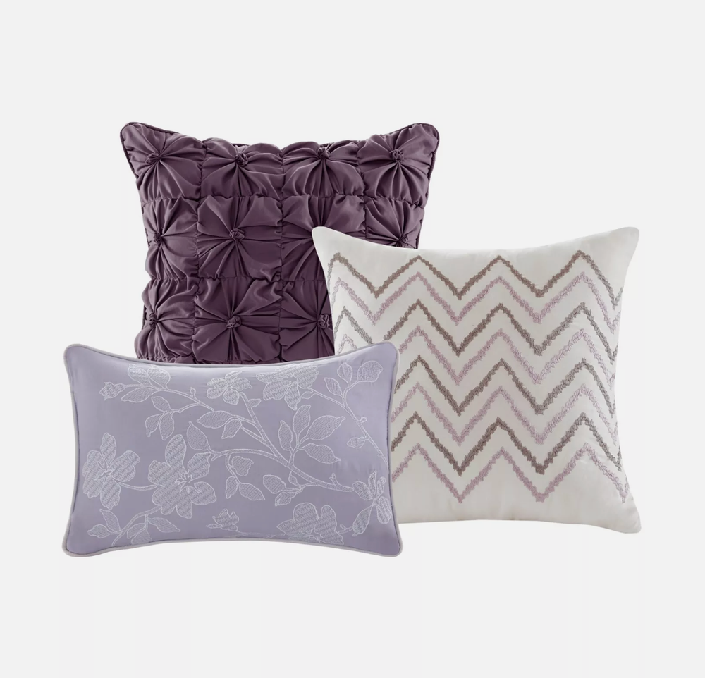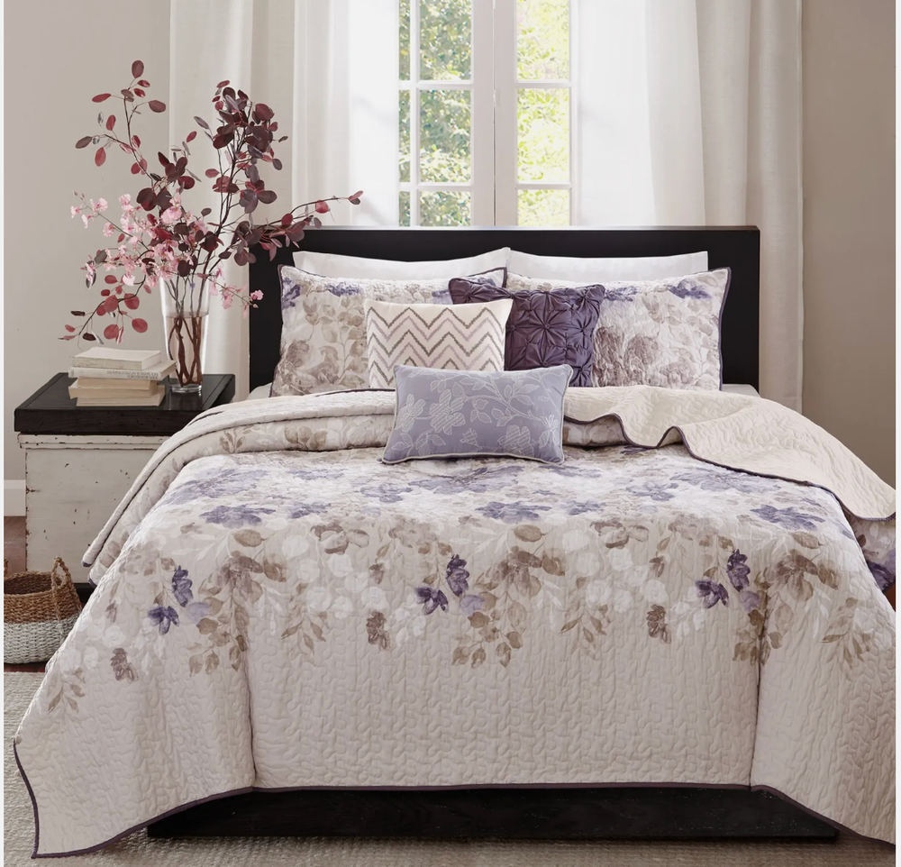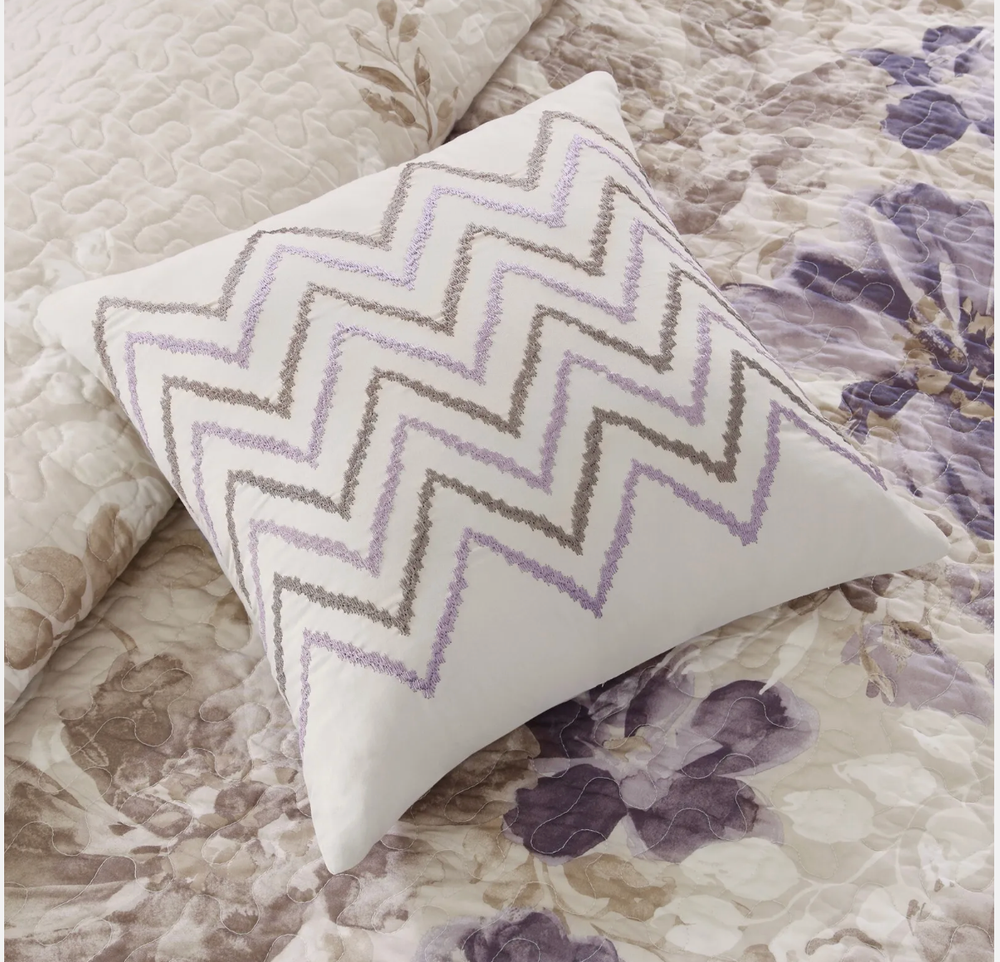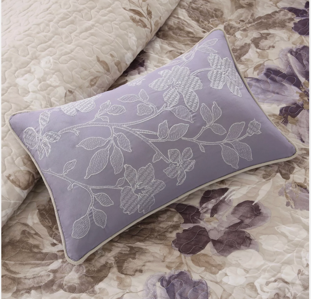 Create a calming oasis with the Willow 6pc Reversible Coverlet Set. Dimensions: 23.23 in (L) x 18.11 in (W) x 11.42 in (H) This beautiful collection features a watercolor floral print across the center of the coverlet that dissipates to solid ivory on the top and bottom. To complete the bedding set, three decorative pillows with embroidered and tufted ruching details are included. With a microfiber polyester face and a brushed fabric reverse, this coverlet is soft to the touch and machine washable for easy care. Law Label: UNDER PENALTY OF LAW THIS TAG NOT TO BE REMOVED EXCEPT BY THE CONSUMER ALL NEW MATERIAL Consisting of 97% COTTON 3% POLYESTER REG. NO. UT 1495 (PK) Certification is made by the manufacturer that the materials in this article are described in accordance with law. MADE FOR E&E CO., LTD 45875 Northport Loop East, Fremont, CA 94538 Federal RN#91519 MADE IN PAKISTAN.