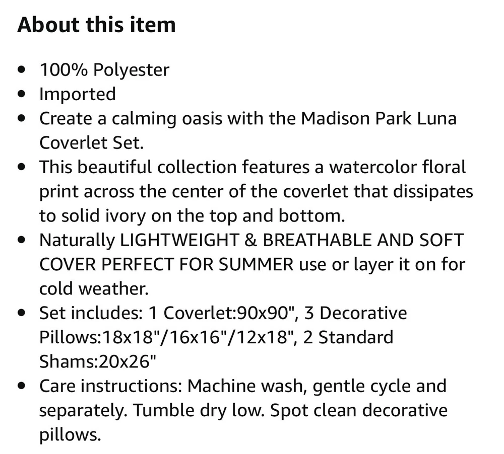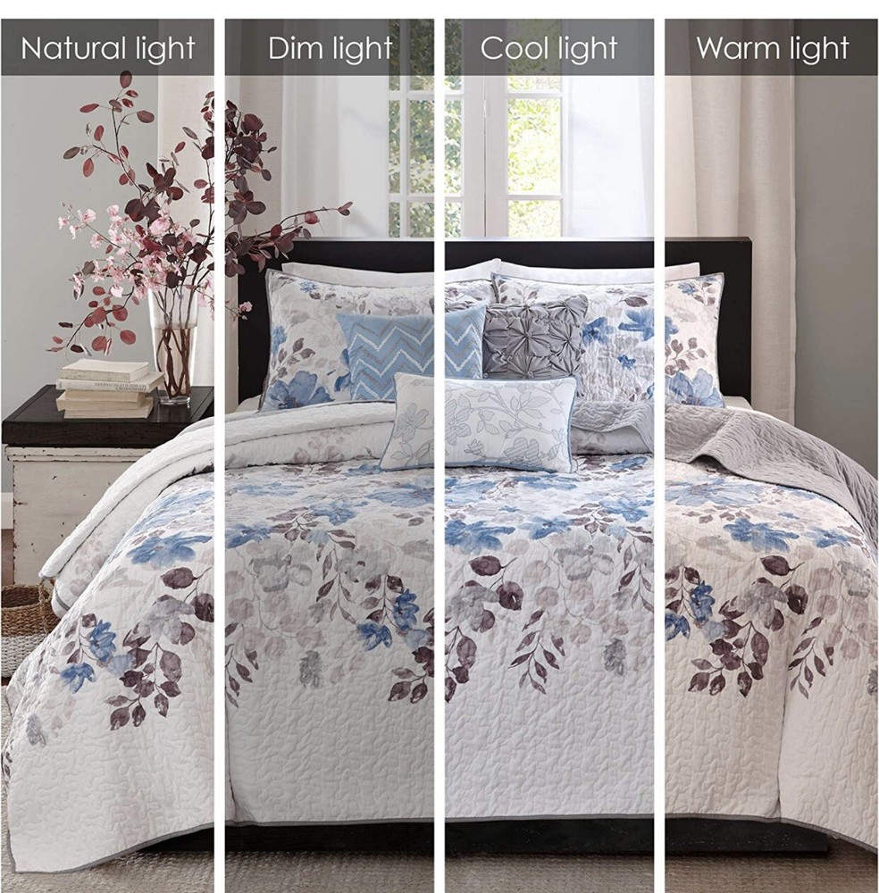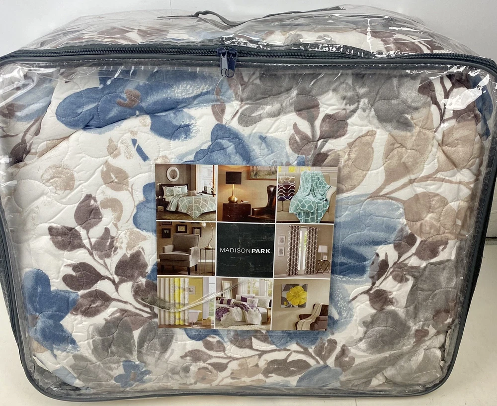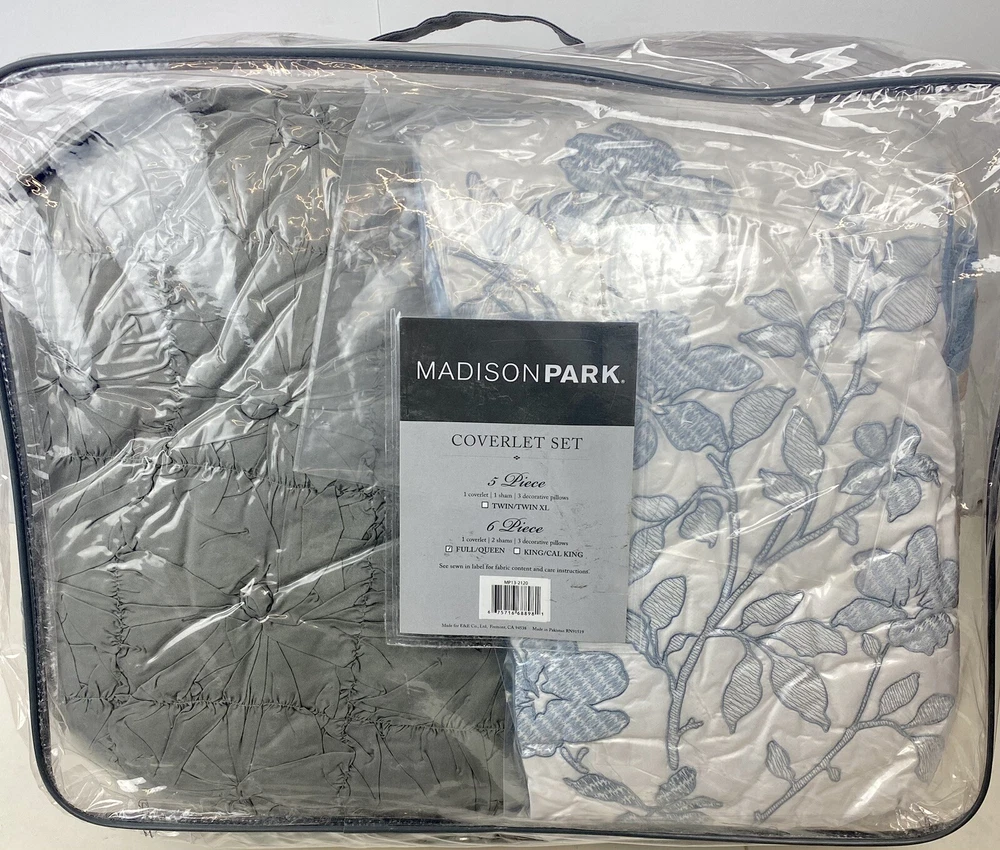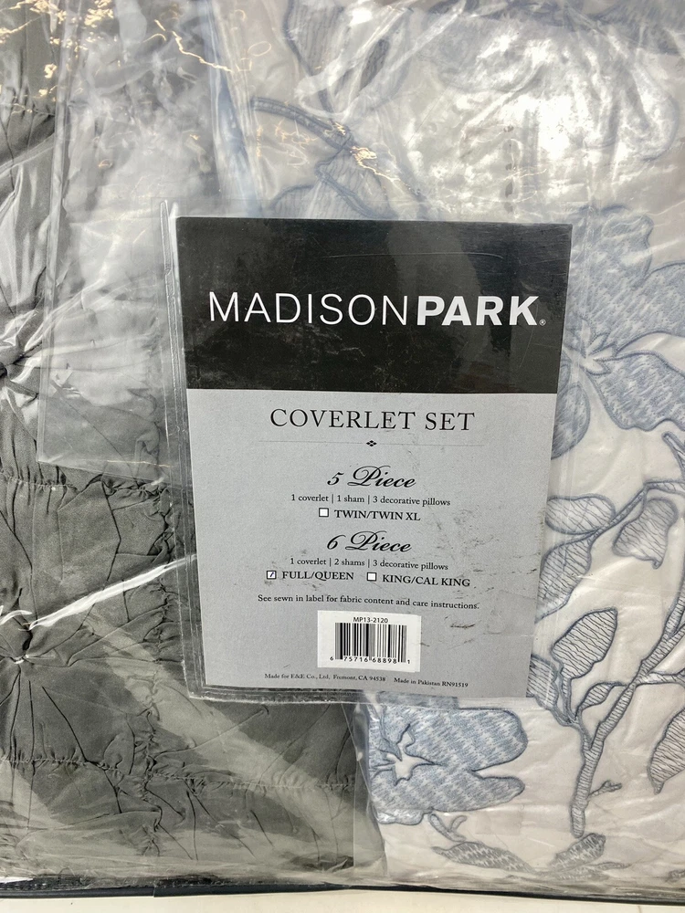 Madison Park Luna 6-Piece Full/Queen Coverlet Set, Floral Blue. Brand new. Outside packaging has some scratches and sticker residue due to storage but everything inside is sealed and brand new. Please look at my last picture for additional details.
