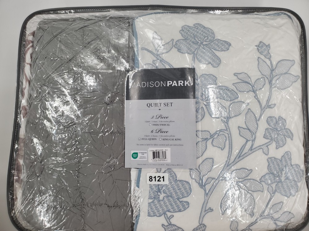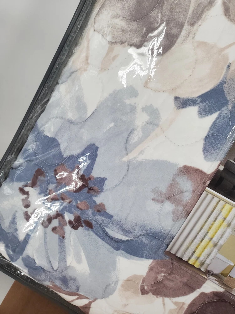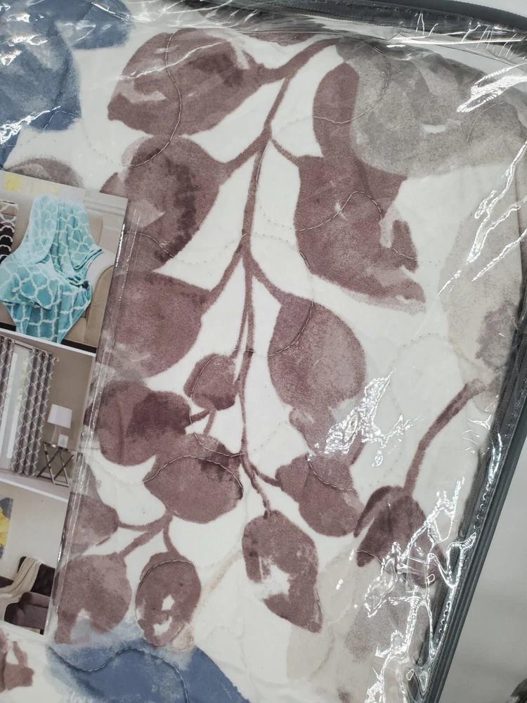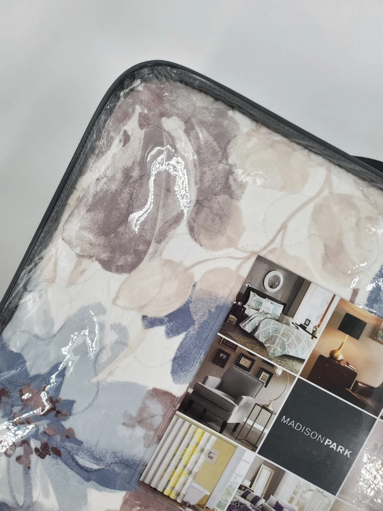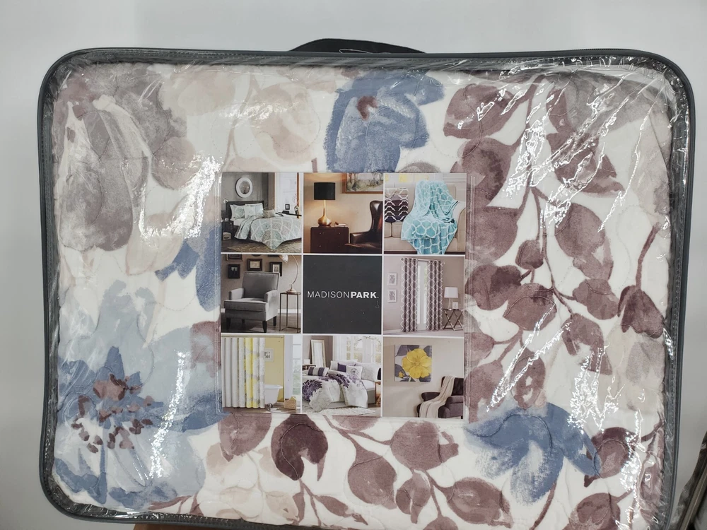 Luna 6 Piece Reversible Coverlet Set Full/Queen by Madison Park Create a calming oasis with the Madison Park Luna 6 Piece Reversible Coverlet Set. This beautiful collection features a watercolor floral print across the center of the coverlet that dissipates to solid ivory on the top and bottom. Three decorative pillows play up the soft blue and taupes to pull this collection together.