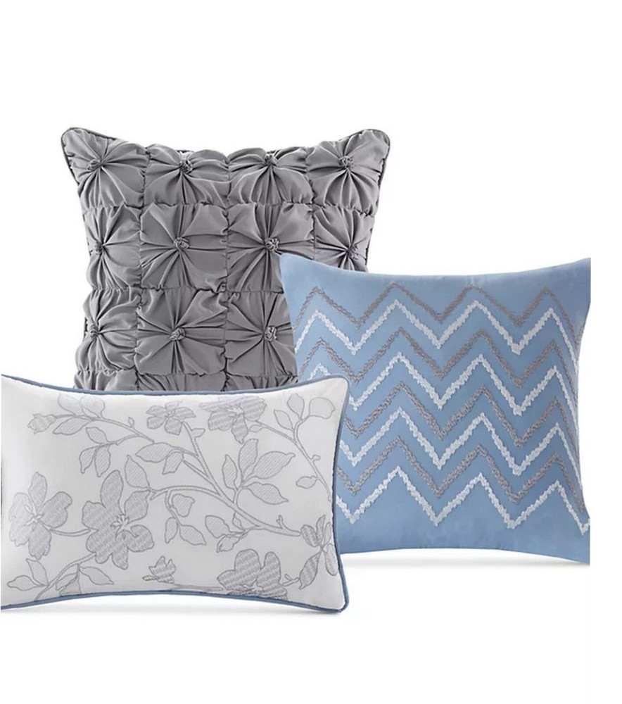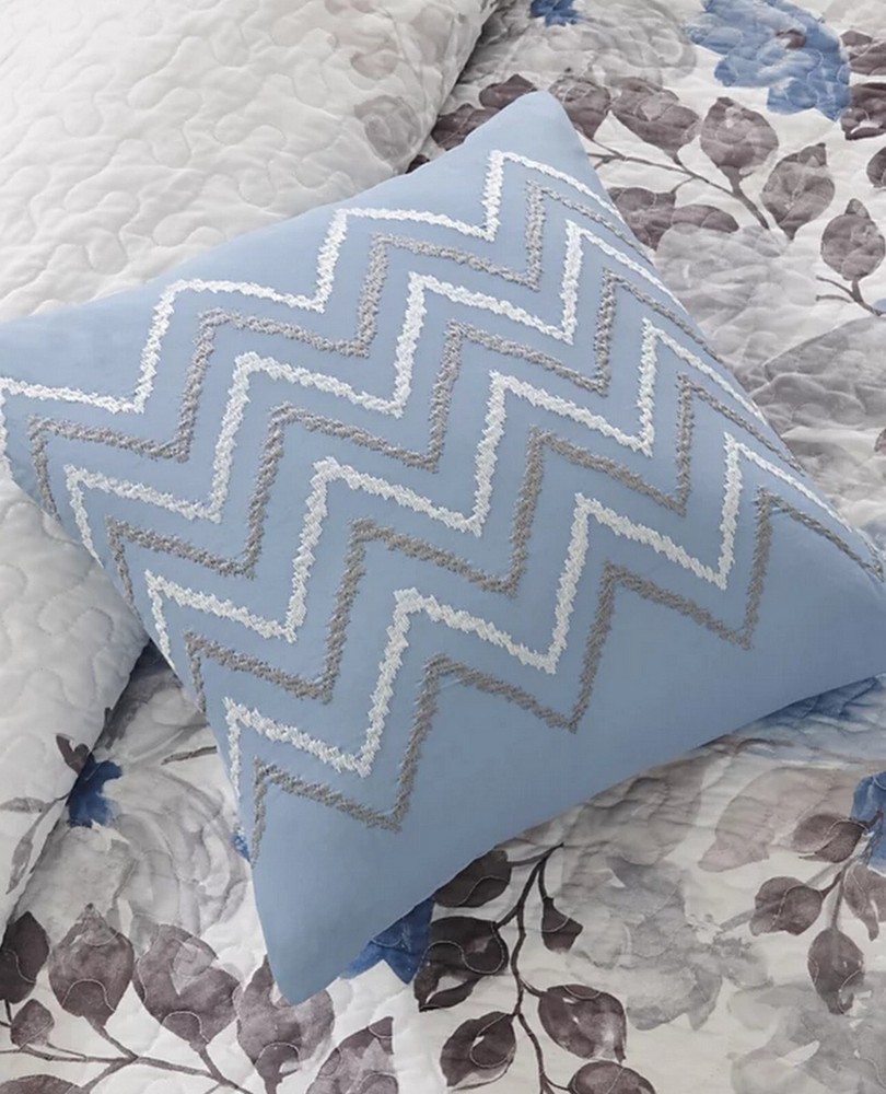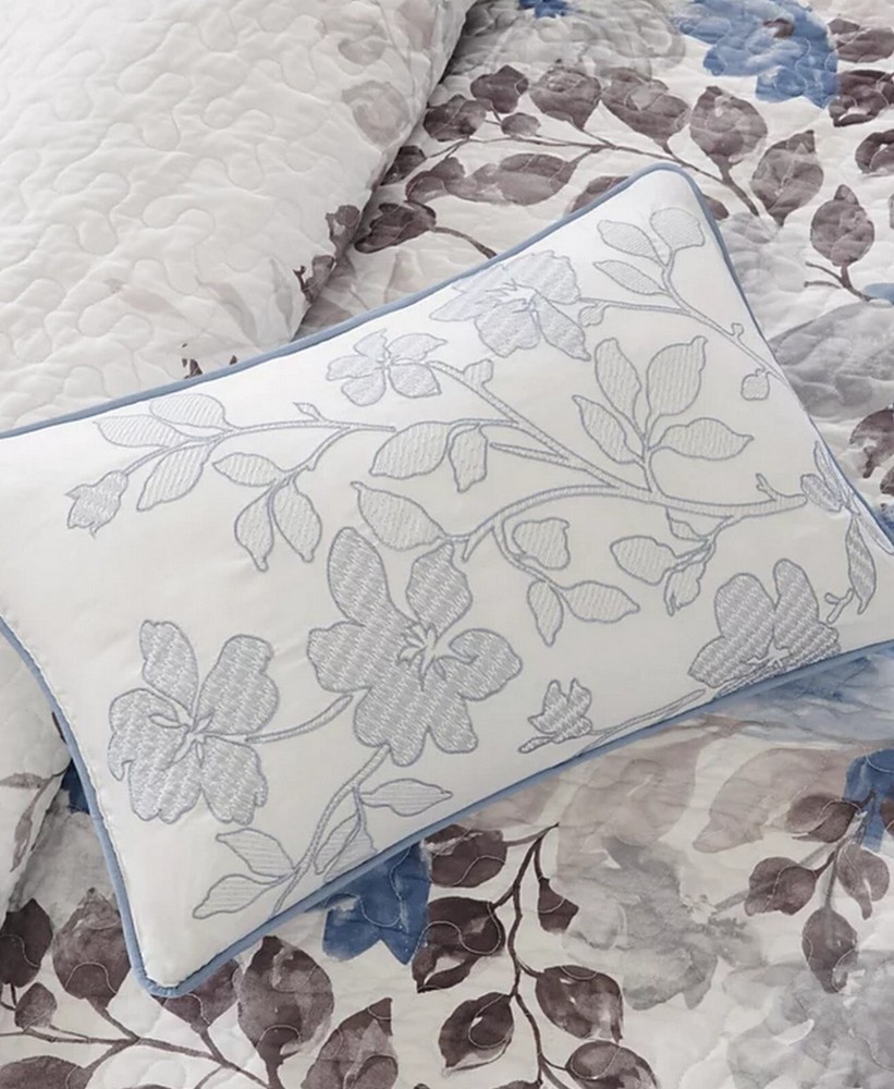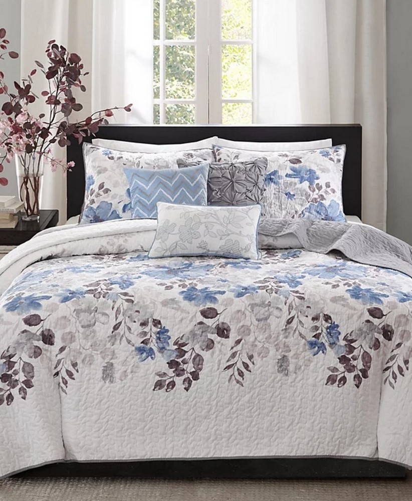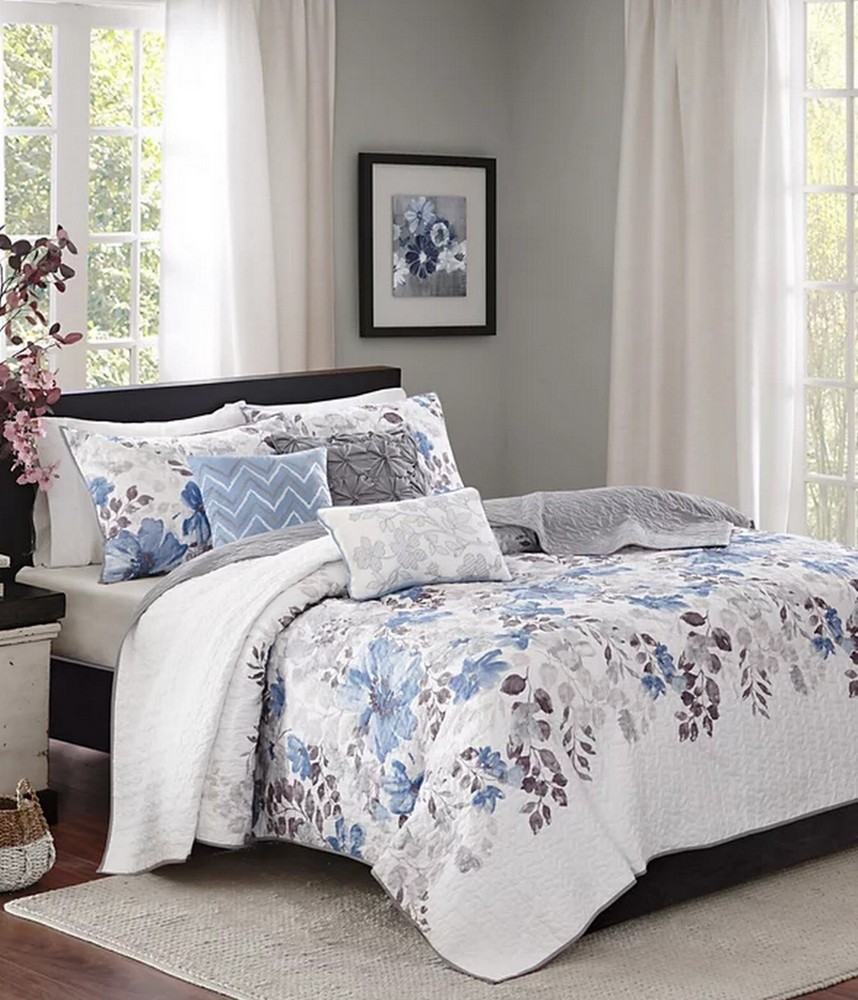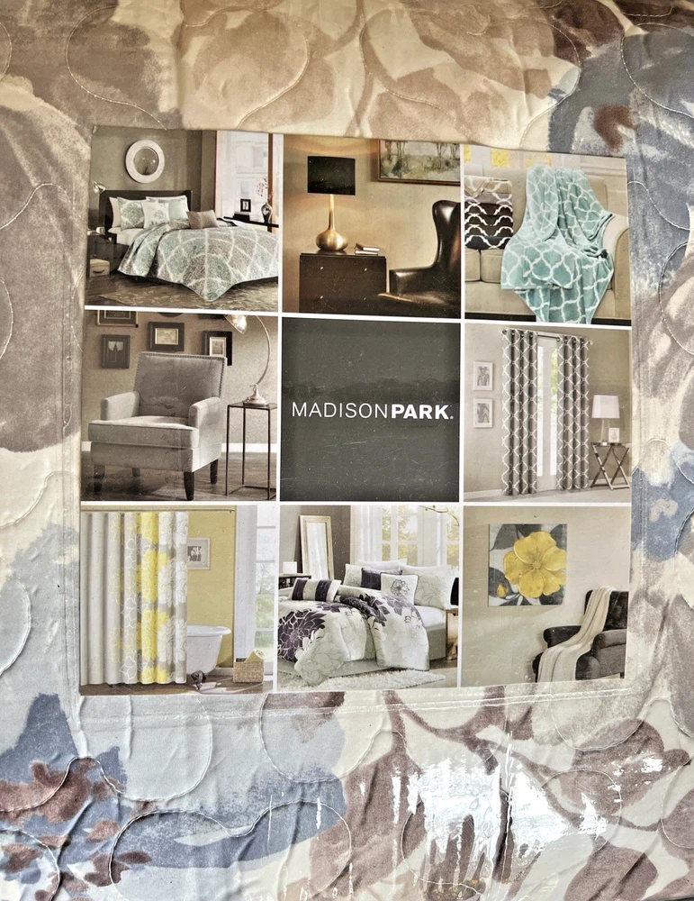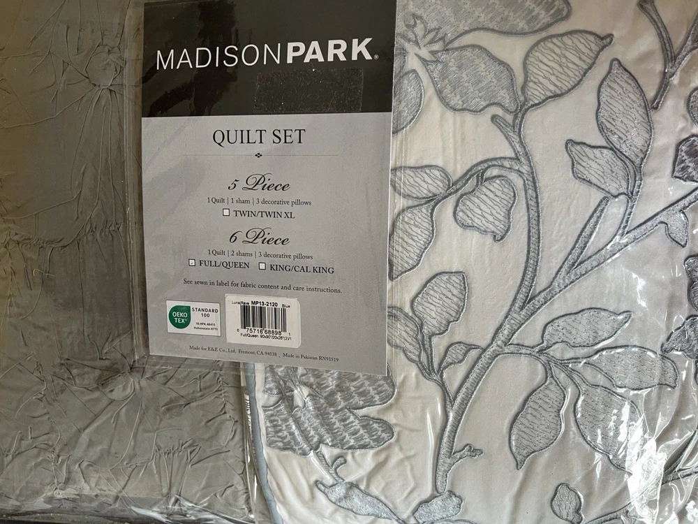UP FOR SALE !!! Madison Park Luna Floral 6-Pc. Reversible Quilt Set Full/Queen Color: Blue/ Multi MSRP $300.00 Packaging has some damage (please see photos) Add charm to your bedroom with the Luna quilt set from Madison Park, featuring quilted fabric and a beautiful floral design on the face of the reversible quilt. Set includes: quilt (90" x 90"), three decorative pillows (18" x 18", 16" x 16", 12" x 18") and two standard shams (20" x 26") Polyester, cotton Machine washable. Spot clean pillows. 97% Cotton 3% Polyester