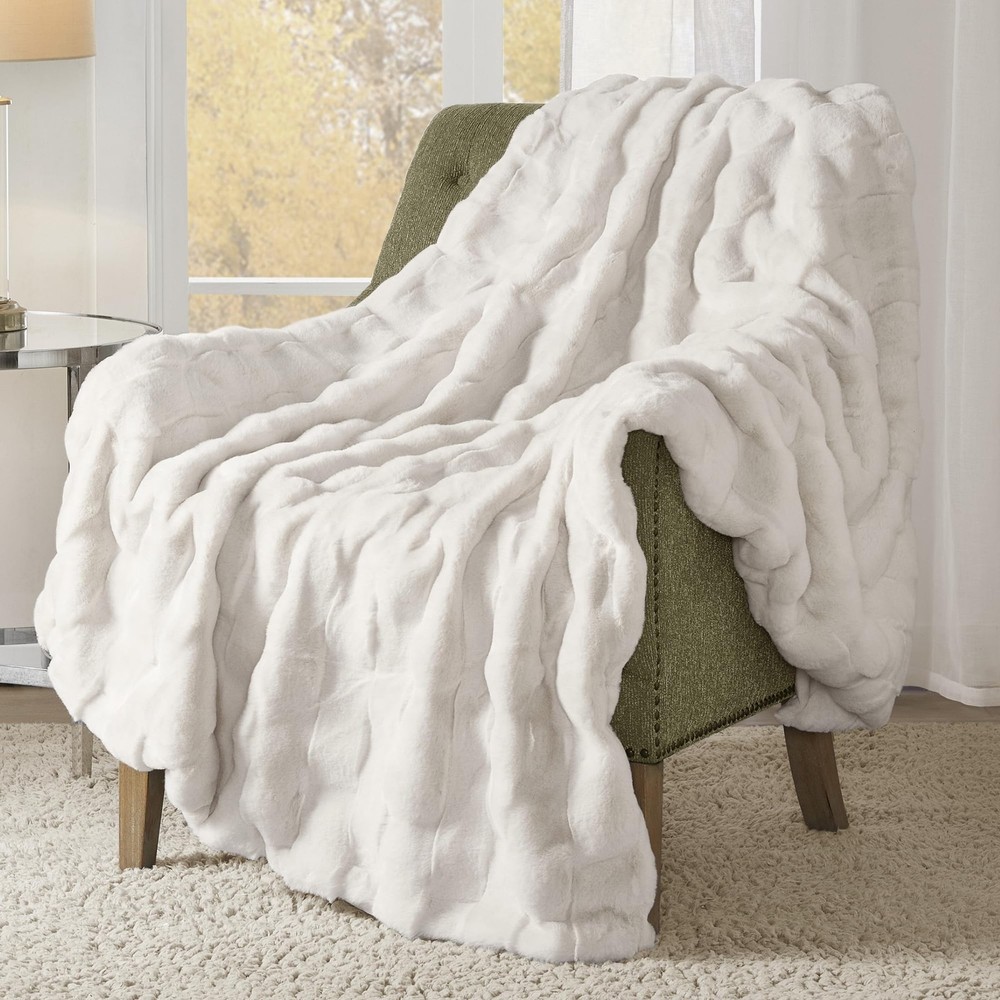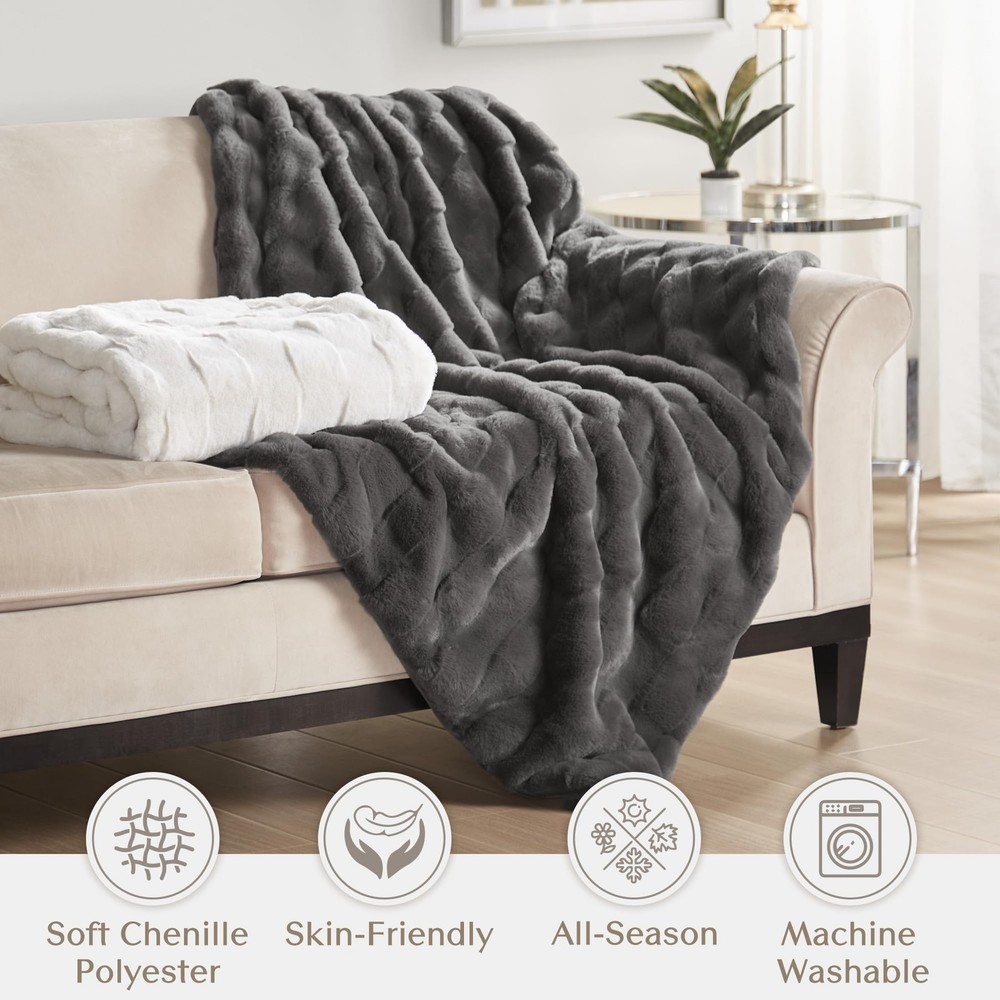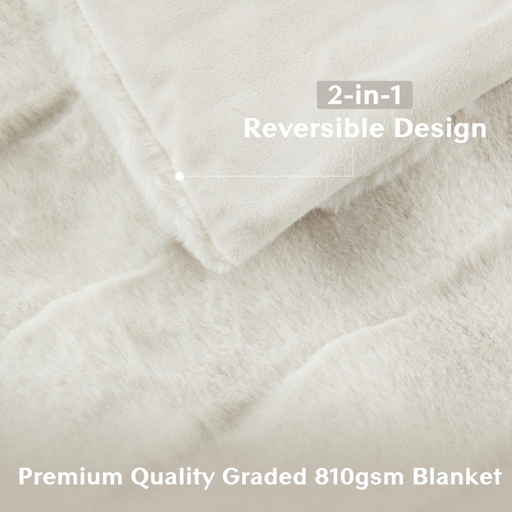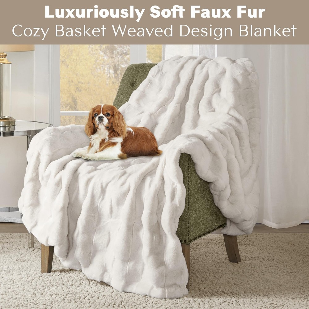 This faux fur throw combines the best of luxury and warmth for your living room. The fur face features a textured basket weave pattern, while the neutral color options create a beautiful and stylish aesthetic to complement any decor. This throw is machine washable for convenient cleaning, and Oeko-Tex certified to ensure quality comfort and wellness. Luxurious Faux Fur Basketweave Blanket - Immerse yourself in the sumptuous softness of long faux fur throw as you snuggle up in its cozy basketweave texture. Embrace a cozier lifestyle with our exquisite premium 810gsm velvet blanket Introducing our Reversible 2-in-1 Blanket - a revolutionary blend of cozy comfort and plush warmth. Combining the breathable, soft faux fur texture of a basketweave design with the irresistibly snug embrace of velvet softness for your ultimate comfort Experience the ultimate comfort with our all-season, skin-friendly faux fur. Whether you're snuggled up for a movie night or seeking comfort at office, our breathable basketweave & buttery soft velvet throw ensures you're pampered in warmth and luxury Set: 1 Throw: 50"W x 60"L. Compact and well-packaged, our blanket is the perfect gift idea for any occasion – birthdays, Valentine's Day, Mother's Day, or Christmas – celebrate yourself or that special someone with everlasting warmth and affection DURABLE & EASY CARE: Our faux fur throw blanket boasts quality stitching offers durability to withstand daily wear and tear. For easy care, simply machine wash separately in cold water on a gentle cycle and tumble dry on low heat
