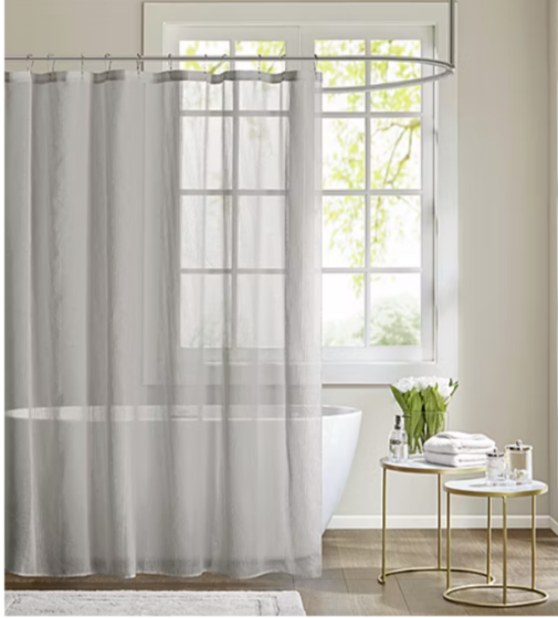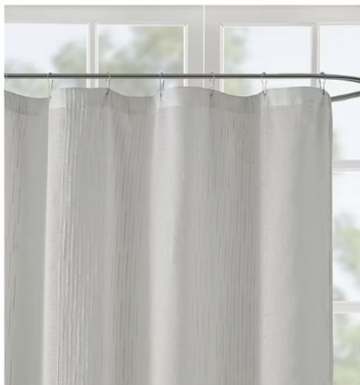 Add a casual update to your bathroom with our Madison Park Lydia sheer shower curtain. A striped texture within this shower curtain provides the perfect backdrop for the soft white hue, creating beautiful dimension for a clean and fresh update. As this curtain is sheer, you may want to use an opaque liner to give a more solid look. Lightweight sheer Texture vertical stripe detailing Number of Hook Holes: 12 Included: 1 72x72 Inch Shower Curtain(s) Shower Curtain Liner: Liner Not Required Measurements: 72 Length/Inches Shower Curtain/Liner Material: 100% Polyester Decor Styles: Farmhouse Material: Microfiber Curtains Type: Shower Curtains Shower Curtain/Liner Care: Machine Wash Country of Origin: Imported
