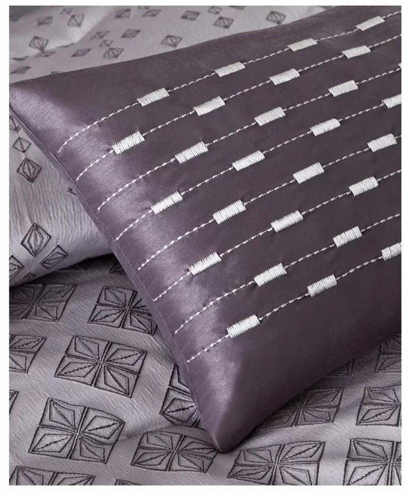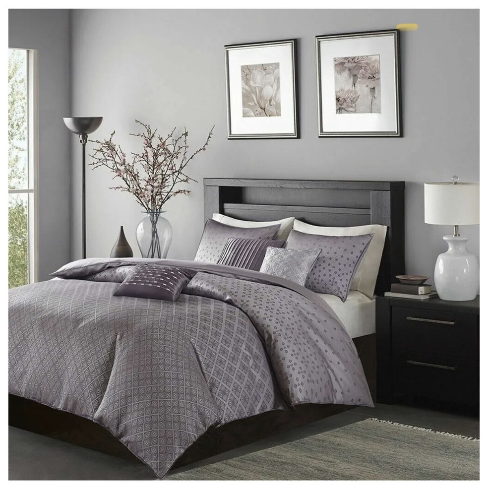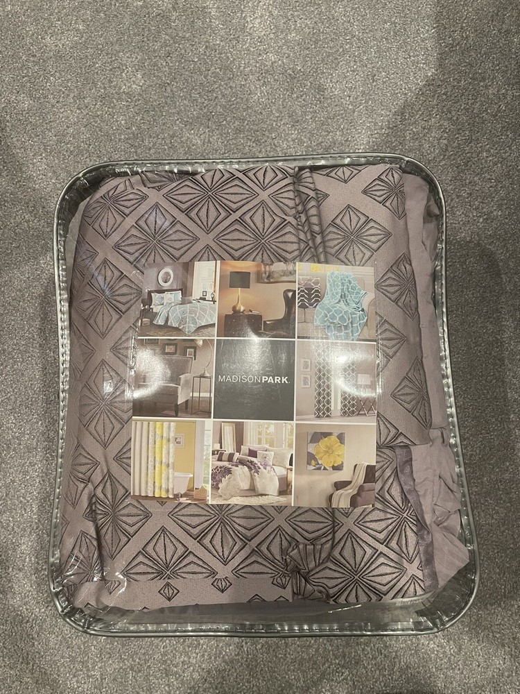 Elevate your bedroom decor with the luxurious Madison Park MP12-3053 Biloxi 6 Piece Duvet Cover Set. This modern set comes in a beautiful shade of purple and is made with high-quality materials including jacquard and polyester and is woven to look like sequins. The design has an ombre affect, looking heavy in the center of the bed and spreading out towards the top and bottom of the duvet cover. Two matching shams share this ombre design. The six piece set includes: 1 Full/Queen duvet cover: 90”W x 90”L 2 standard shams: 16”W x 26”L 1 decorative pillow: 16”W x 16”L 1decorative pillow: 18”W x 18”L 1 decorative pillow: 12”W x 18”L Features 100% polyester sequin jacquard design Brushed polyester reverse polyester filling button closure machine washable Smoke free home.