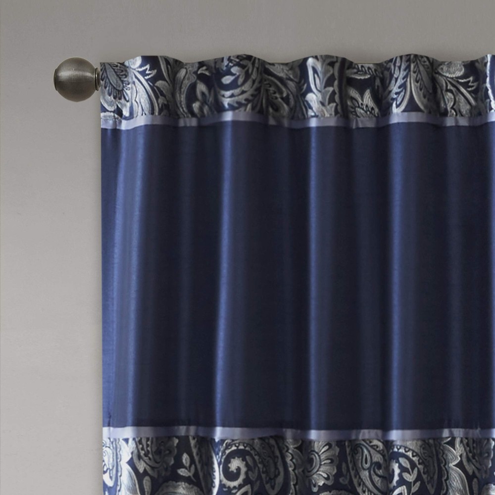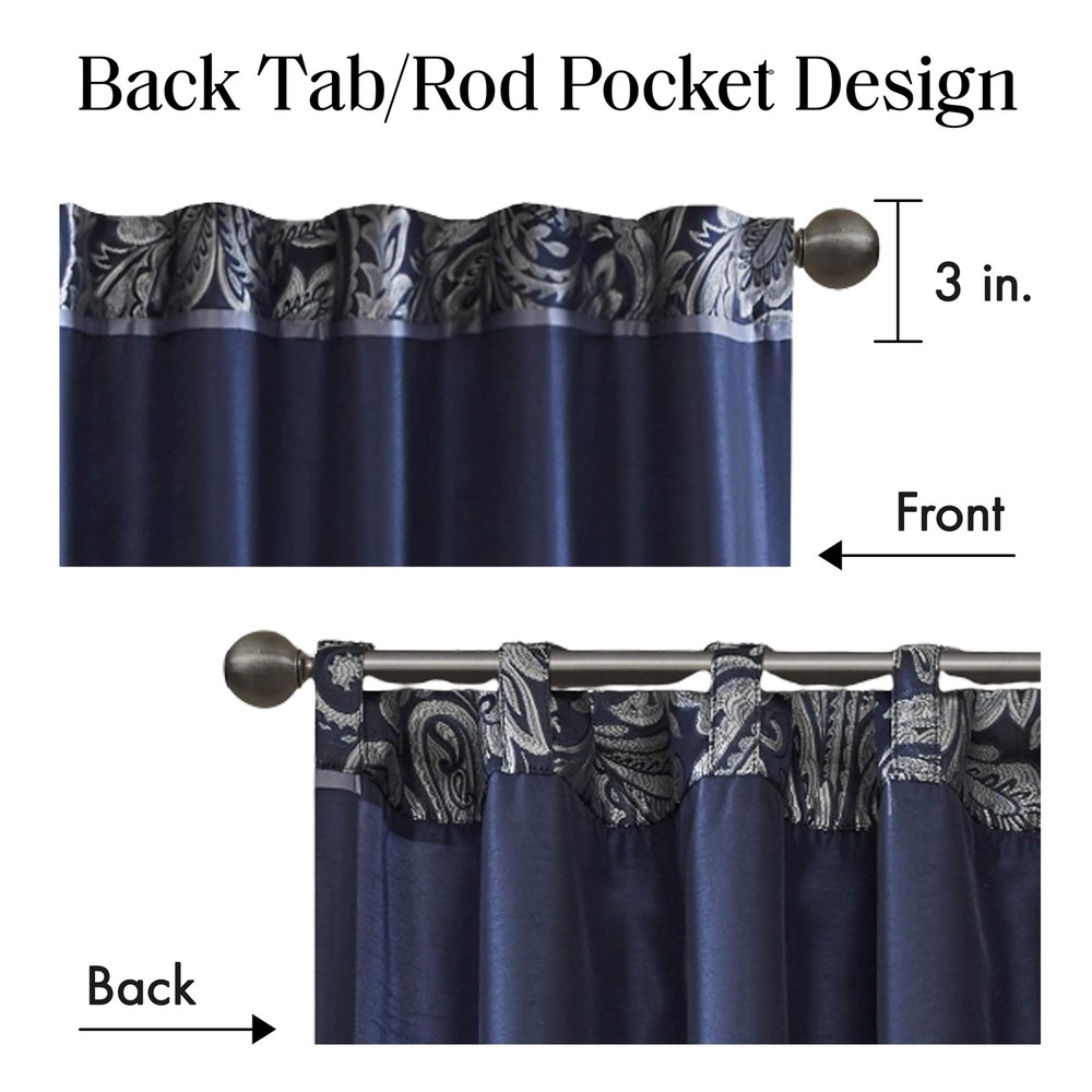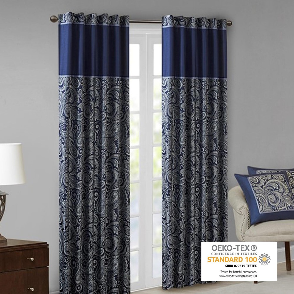 Product Page Madison Park Aubrey 2 Panel Curtain Faux Silk Paisley Jacquard, Rod Po Kitchen Description: For a luxuriously classic style, our Madison Park Aubrey Window Curtain Pair is the perfect touch to your decor. The alluring jacquard weave is inspired from an updated paisley motif and is woven in beautiful hues of navy, ivory, and a hint of silver for a shimmering accent. The window panels are pieced with solid faux silk and beautiful flat piping details in gold, creating an elegant look. While also achieving the OEKO-TEX certification, meaning it does not contain any harmful substances or chemicals, ensuring quality comfort and wellness. Rod pocket or back tabs top finish makes this curtain easy to hang, open, and close panels throughout the day; while fitting up to a standard 1.25" diameter rod. Coordinating bedding is also available and sold separately. Features: Set of 2 curtain panels showcasing an elegant paisley jacquard with a sophisticated natural luster, perfect for a fresh and stylish update For a luxuriously classic style, our Madison Park Aubrey Window Curtain Pair adds an elegant touch to your décor while providing room darkening effect, for enhanced privacy The window panels are pieced with solid faux silk and beautiful flat piping details in gold, creating an elegant look OEKO-TEX certification, meaning it does not contain any harmful substances or chemicals, ensuring quality comfort and wellness. Simply hang on rod pocket or back tabs for a tailored finish; fits up to a 1. 25 diameter rod CARE - Machine wash cold on gentle cycle, tumble dry on low heat, wash alone, do not bleach