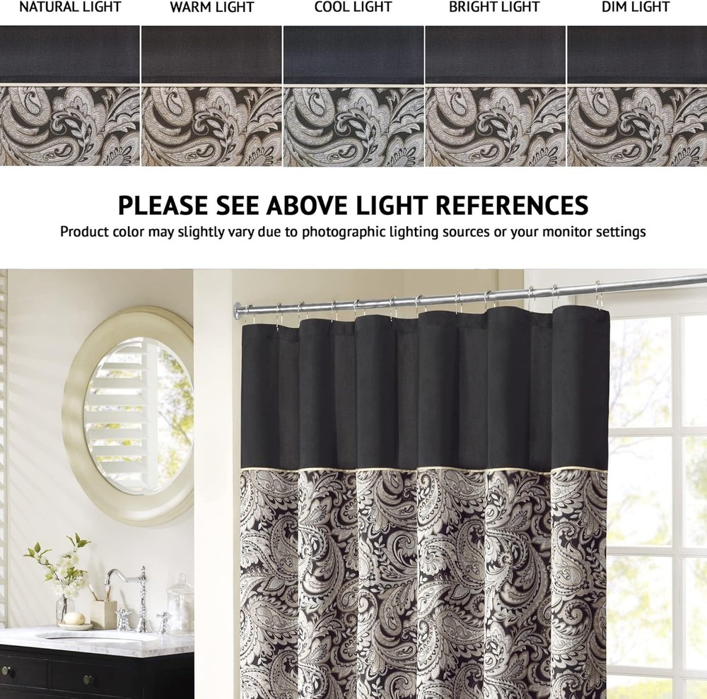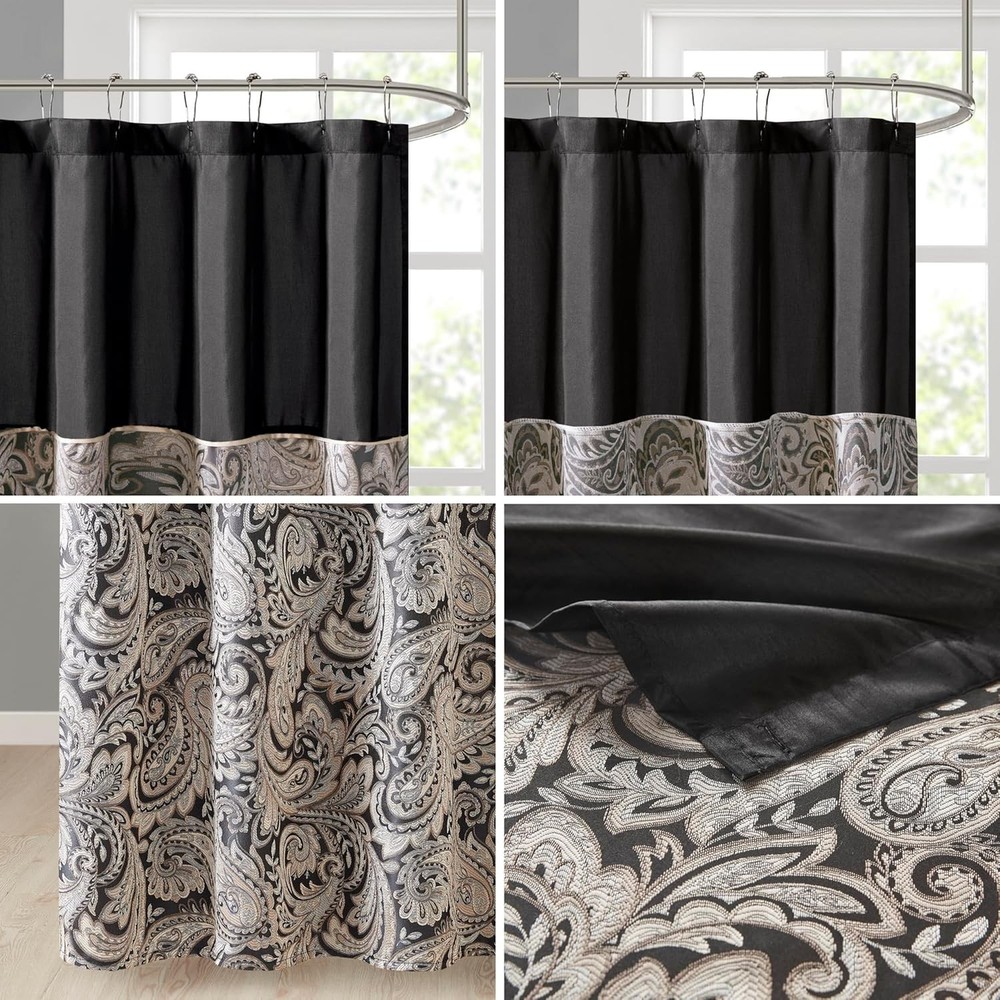 Madison Park - MP70-845 Aubrey 72"W x 72"L (Pack of 1), Black The Madison Park Aubrey Polyester Jacquard Shower Curtain creates a sophisticated modern look in your bathroom. The pieced design flaunts a beautiful woven jacquard in an updated paisley motif with a large solid stripe at the top of the shower curtain. This jacquard shower curtain is machine washable for easy care. Complete the collection and look with coordinate bath towels, bath rugs, bedding, window, and dec pillow - available and sold separately. 🌟 Product Features ✨ 100% Polyester, Jacquard ✨ NEW & TRENDY - Modern and luxurious bathroom shower curtain from Aubrey collection features a pieced design that flaunts a beautiful woven jacquard in an updated paisley motif with a large solid stripe at the top of the shower curtain. For a complete look coordinating bedding is available and sold separately ✨ QUALITY - The ultra soft microfiber provides a simple and sophisticated update, while also making this shower curtain to be durable and naturally wrinkle resistant for an easy care ✨ MEASUREMENT- 1 Shower Curtain: 72(W) x 72(L) Inches ✨ PRIVACY - Provides privacy and decorative appeal; shower liner is recommended; comes with buttonholes for shower hooks (NOT INCLUDED) ✨ EASY CARE- Machine wash cold, gently and separately. Do not bleach. Tumble dry low. Remove promptly 📦 Shipping: Shipping is complimentary within the lower 48 US States. 😊 🚫 We Do Not Ship to PO/APO Boxes, HI or Alaska 🌍 We Do Not Ship Outside of the Continental US ⏱ All items ship within 24-72 hours of Payment 📞 For large items that require Freight shipping, a valid phone number is required to call and schedule your delivery 📜 Terms of Sale and Feedback: ⭐ Feedback is extremely important to us and eBay 👍 If you are satisfied with our transaction, please take a moment to leave Positive Feedback. YOUR Satisfaction is our #1 Priority! ⚠ If there are any issues, PLEASE contact us BEFORE leaving a neutral or negative rating so that we may resolve any concerns. 💖 We PROMISE we can make you happy if you give us a fair chance. 🔃 Returns / Concerns: 📅 All items qualify for returns within 14 - 30 days of receipt. Buyer is responsible for return shipping on any item that is not damaged. 🛒 Please be sure this is an item you want before making your purchase. Customer Satisfaction is our TOP priority! 📦 All items are IN STOCK at time of listing. 📊 Inventory on eBay changes constantly and it is impossible to maintain a perfectly accurate count of all items. 🙋♀️ Please do not penalize us if we have to issue you a refund! 🙌 Thank You For Your Business!