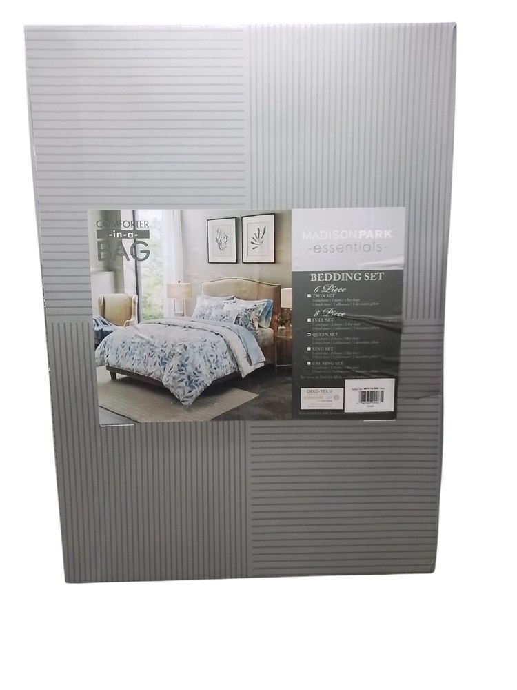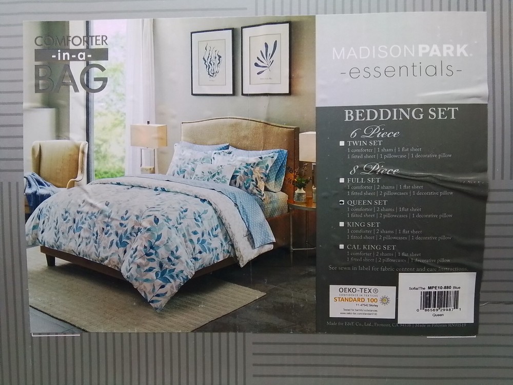 ***OPEN BOX*** Elevate the style of your bedroom with this Madison Park MPE10-880 Thelma 8-Pc Blue Queen Reversible Comforter Set. The set includes one fitted sheet, two shams, two pillowcases, one flat sheet, and a comforter, all made of 100% polyester material. The floral pattern on the blue and gray color scheme adds a touch of elegance to your bedding. This contemporary style comforter set is perfect for your home and is machine washable for easy care. The reversible feature of the set gives you the option to switch up the look of your bedroom whenever you desire. Made in Pakistan, this comforter set is a great addition to any bedroom.