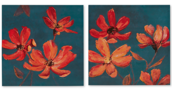 Madison Park Magnolia Hand Embellished 2 Piece Canvas Set 7008 Details & Care Warm vibrant florals pop on the rich blue background Set includes 2 canvas paintings: 20"W x 20"H x 1.5"D each Includes D-ring mounting hardware Hand-embellished canvas MDF medium density fiber board/canvas Wipe clean