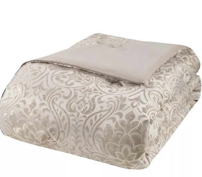Give your bedroom a touch of elegance with this jacquard comforter set featuring a stunning damask pattern that shimmers due to the metallic threads. Available in a lovely khaki mixed with golden accents, or a sophisicated grey with silver accents; the sheet set is a nice egg-shell white. Product Features Set includes: 1 Comforter, 2 King Shams, 1 Bedskirt, 2 Euro Shams, 1 Flat Sheet, 1 Fitted sheet, 2 Pillowcases, 2 Decorative Pillows Polyester Jacquard face and microfiber reverse; microfiber sheet set; 100% polyester filling Jacquard woven damask pattern with metallic shine for a classy traditional bedroom update Two throw pillows with pleating and embroidery techniques Fitted sheet fits up to 16" mattress depth, comes fully elasticized for better coverage and fit Hypoallergenic polyester filling contains no allergens and is dust proof Machine washable and spot clean fabric Throw pillow(s) may come in compressed packaging Throw pillow(s) will need to be fluffed up if compressed Asian American & Pacific Islander Owned, Woman Owned Polyester Machine Washable Imported