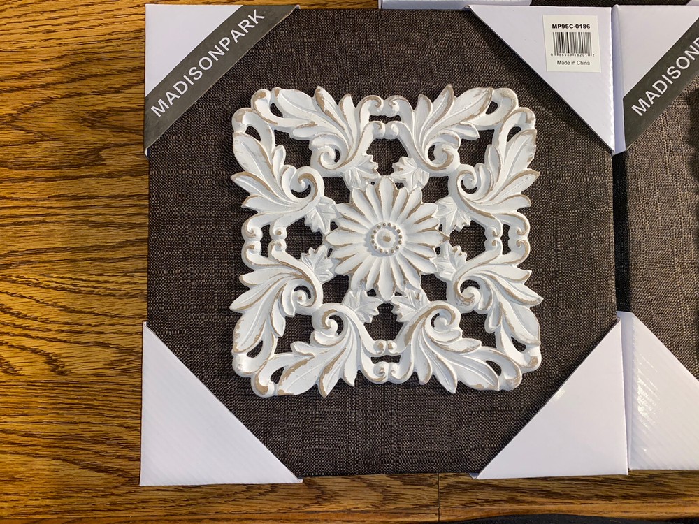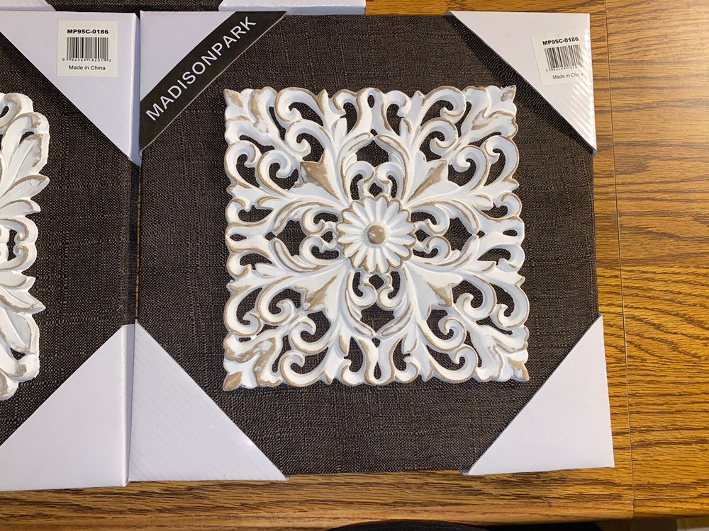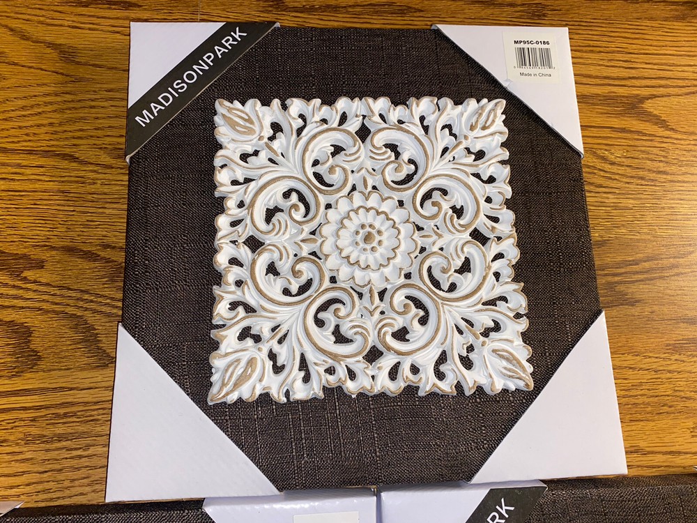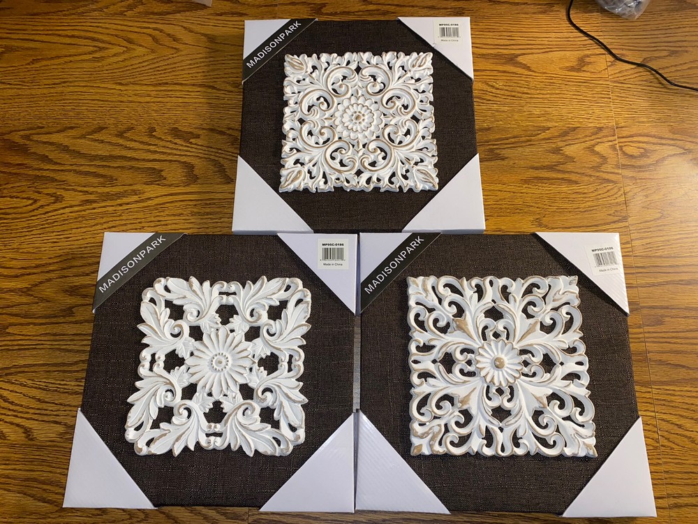 This beautiful 3 piece wall art set features a white mandala design with brown accents, adding a touch of elegance to any room. The canvases are made of high-quality linen and are embellished with a 3D effect, adding depth and texture to the artwork. The brand of this artwork is Madison PARK and the dimensions are 12 inches by 12 inches. The theme of this artwork is art and the subject is mandala. This set comes with no additional parts required and weighs 4.4 pounds. FREE SHIPPING!