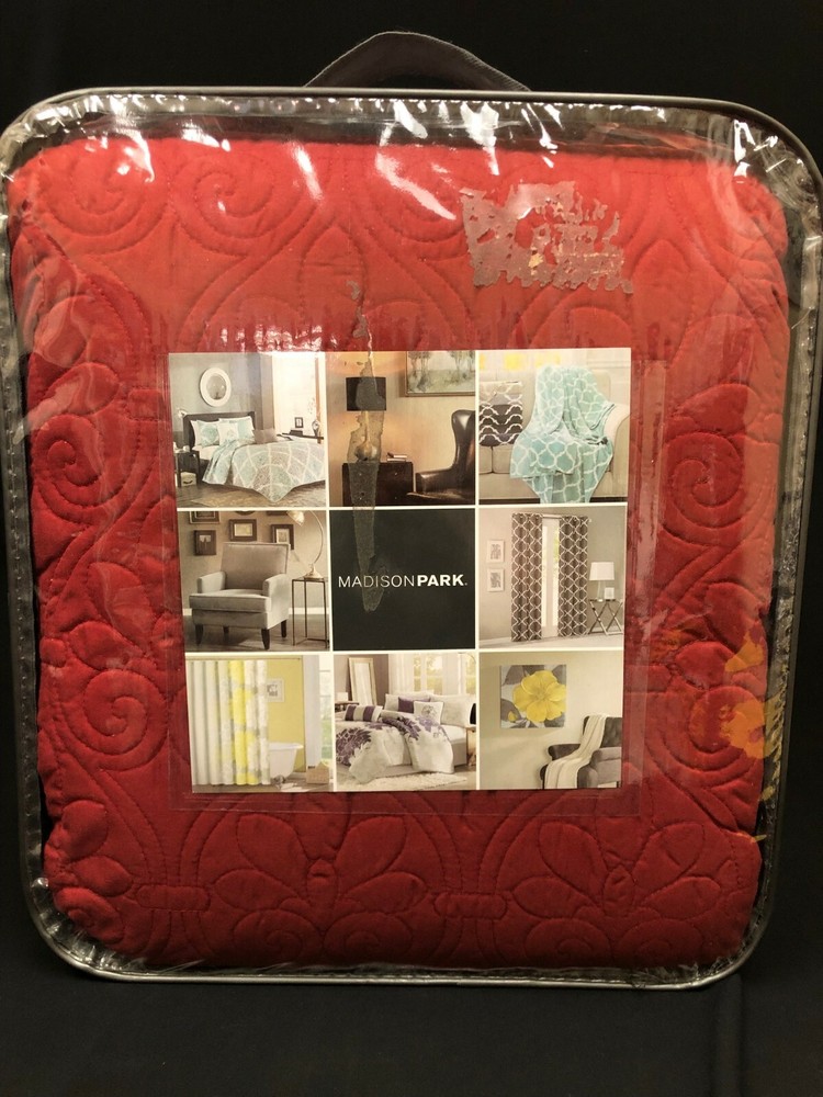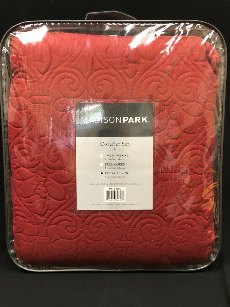 RETAILS FOR $75.00 Madison Park Mansfield Reversible Coverlet Set is the perfect coverlet to use as a layering piece or an alternative to your comforter for a new solid look. The classic stitch pattern pairs easily with your existing decor and will sure to add a new decorative element to your bedroom. The face and the reverse of the coverlet are a super soft brushed fabric. Pre-washed cotton filling for comfort and stability King/California king set includes:1 coverlet:104 in. x 94 in. 2 king shams:20 in. x 36 in. (2) Dimensions Quilt/Coverlet Length (in.) 104 in Quilt/Coverlet Width (in.) 94 in Sham Length (in.) 36 in Sham Width (in.) 20 in Details Bedding Material Polyester Care Instructions Machine Wash Color Red Color Family Red Decor Type Bedroom Linen Decorative Accents No Decorative Accents Features Reversible Fill Material Cotton Lifestage Adult Linen Type Coverlet Set Material Polyester (100%) Material Family Polyester Number of Pieces 3 Origin Imported Pattern Type Floral Returnable 30-Day Set Includes Coverlet,Sham Size King/Cal King Style Transitional Thread Count 0