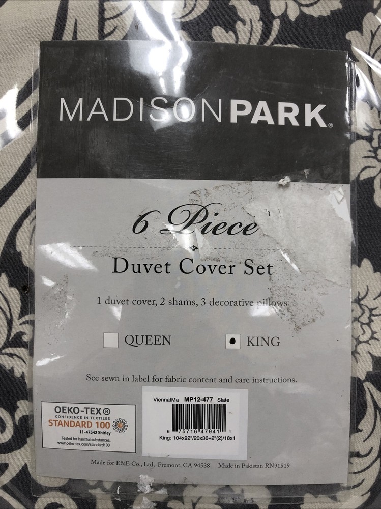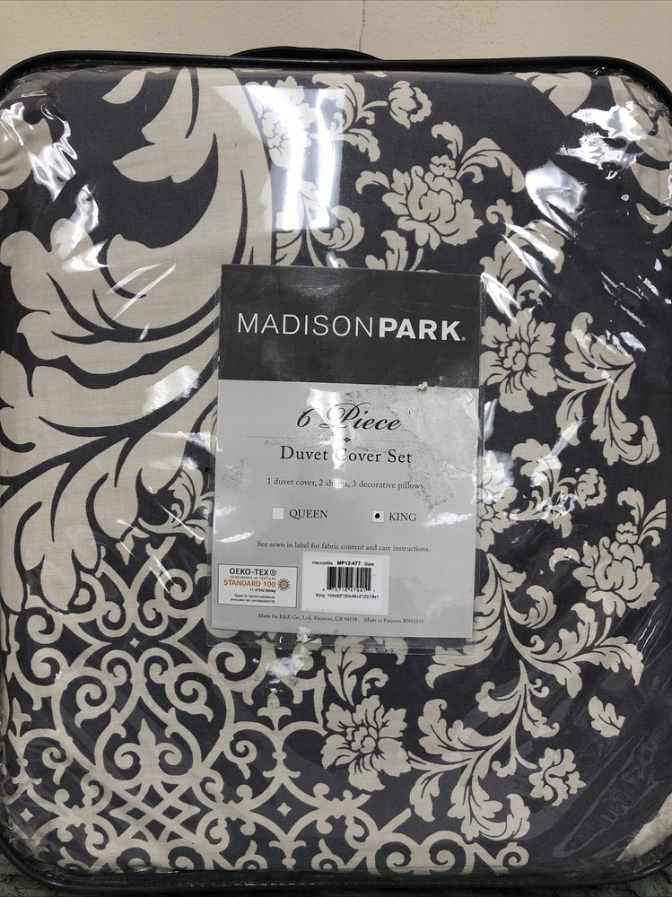 Set the tone of your bedroom space with this Madison Park Marcella 6-piece duvet cover set.Watch the product video here.Click this BED & BATH GUIDE to find the perfect fit and more! 6-piece set 200-thread count cotton sateen face 180-thread count cotton blend reverse Ogee motif with leaves/scrolls Intricate damask design with a solid color on the reverse Tufted & embroidered accents Embroidery & fabric details on decorative pillows Button closure and inside ties FULL/QUEEN 6-PIECE SET 90" x 90" Duvet Cover 2 Standard shams: 20" x 26" Oblong pillow: 12" x 16" Small square pillow: 16" x 16" Large square pillow: 18" x 18" KING/CAL KING 6-PIECE SET 104" x 92" Duvet Cover 2 King shams: 20" x 36" Oblong pillow: 12" x 16" Small square pillow: 16" x 16" Large square pillow: 18" x 18" CONSTRUCTION & CARE Cotton/polyester Machine wash Imported