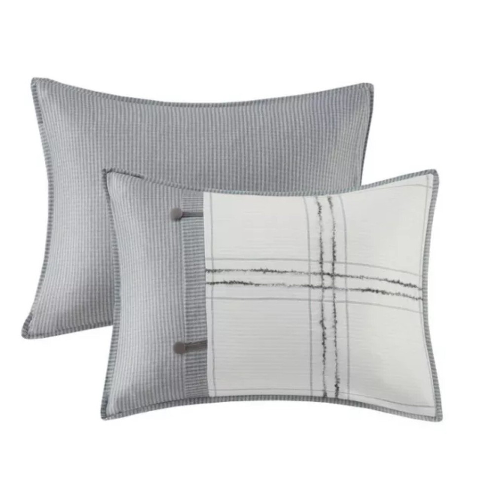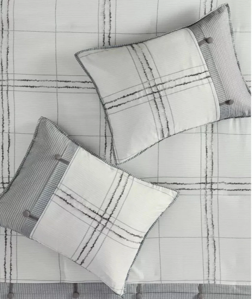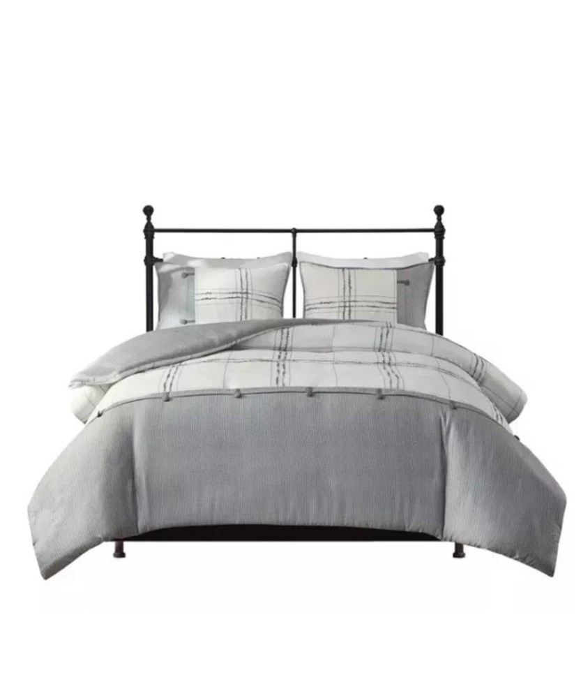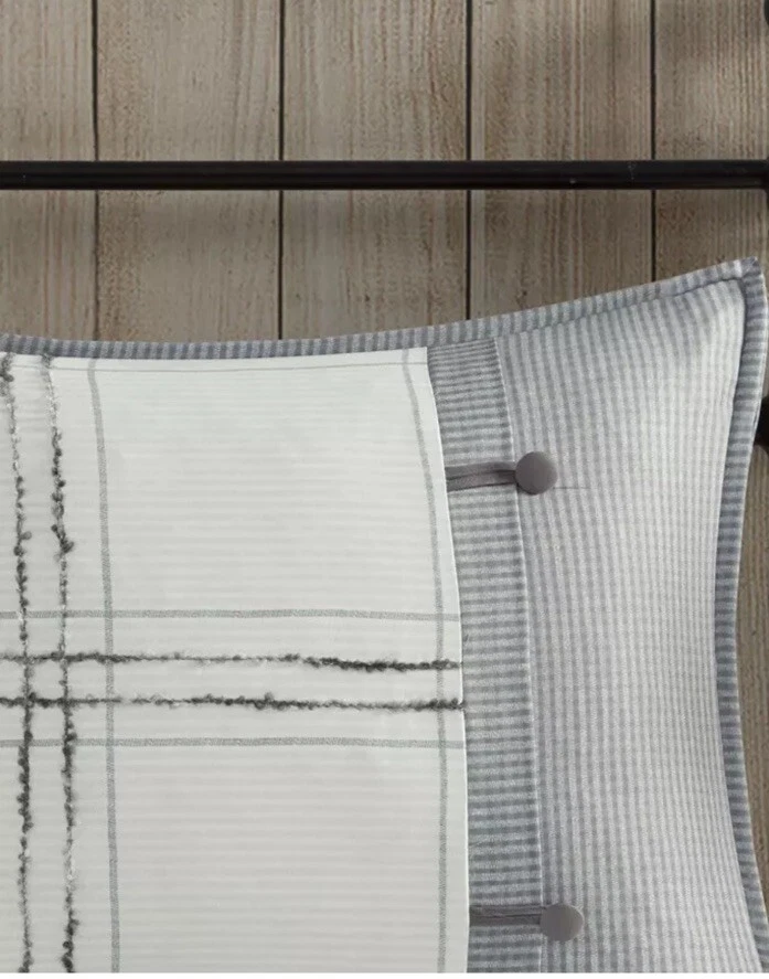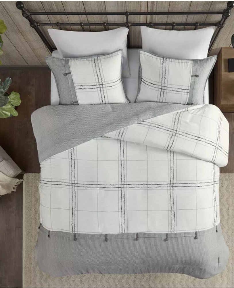 Elevate the look of your existing bed with this bedding collection from Madison Park. Full of endless style and comfort, you'll love the look this incorporates into your existing bedroom decor. This design was sold under the name Maxwell or Hunter depending on retailer. Hard to Find since sold out on most all retail sites PRODUCT FEATURES •3-piece set •Soft, cozy feel •Cabin farmhouse style 3 piece duvet cover set in plaid design •Inside corner ties to secure the insert and button closure (Insert not included in the set) •Printed on herringbone fabric with pieced design and button details, shams and duvet cover are reversible •Give your bedroom a charming farmhouse update with the Madison Park Hunter/ Maxwell 3 Piece Duvet Cover Set. The soft herringbone duvet cover features a pieced design with a plaid print, trims, and button details to create a cozy cottage look. FULL/QUEEN 3-PIECE SET •Duvet cover: 90"W x 90"L •2 Standard shams: 20"W x 26"L (each) CONSTRUCTION & CARE •Polyester •Machine wash •Imported This product was never used but was removed from packaging for viewing only and repackaged.