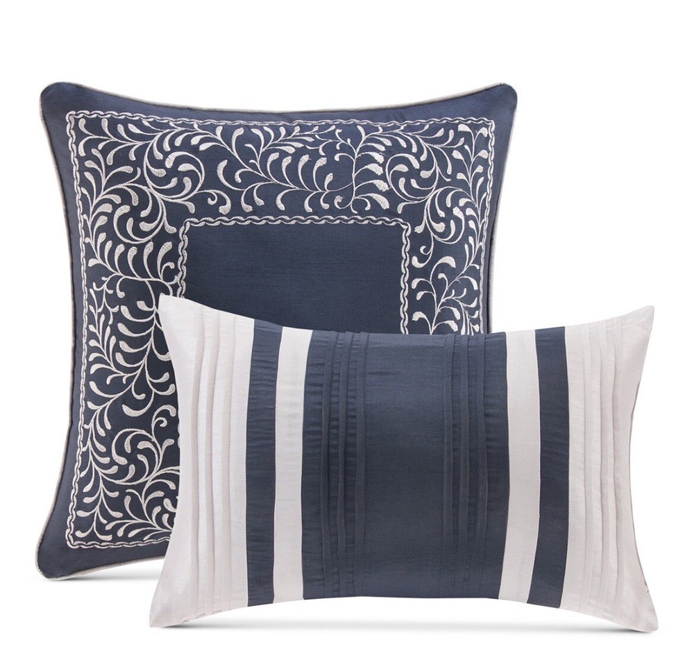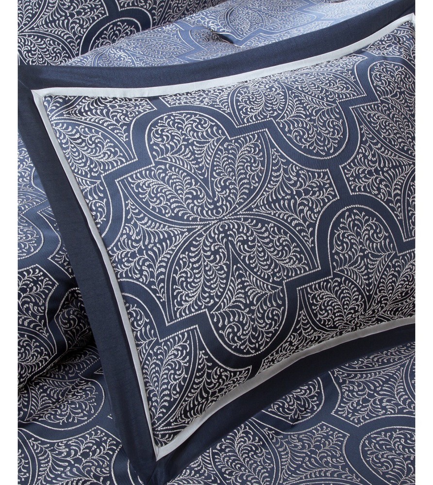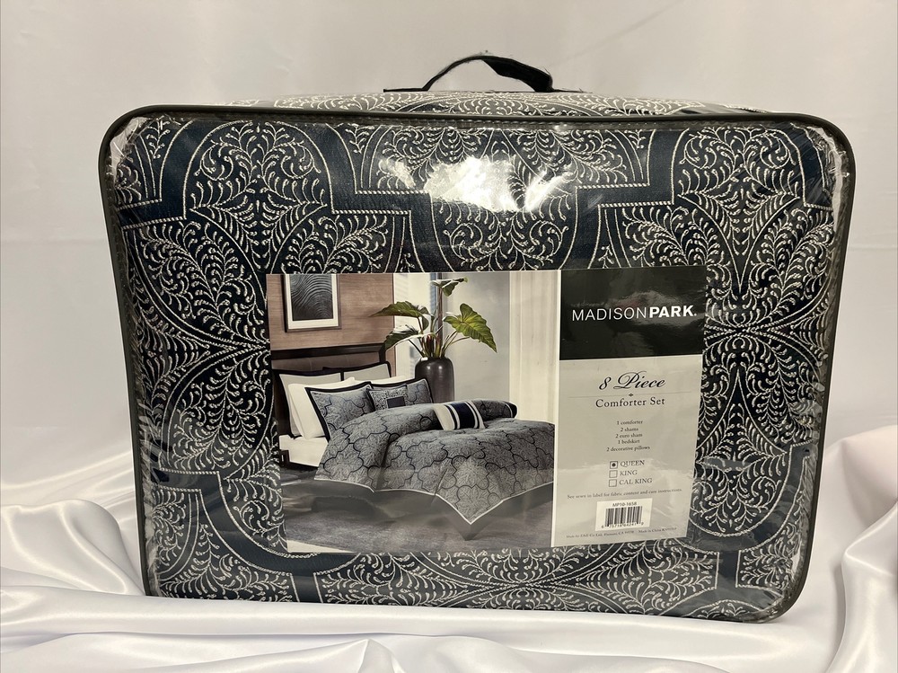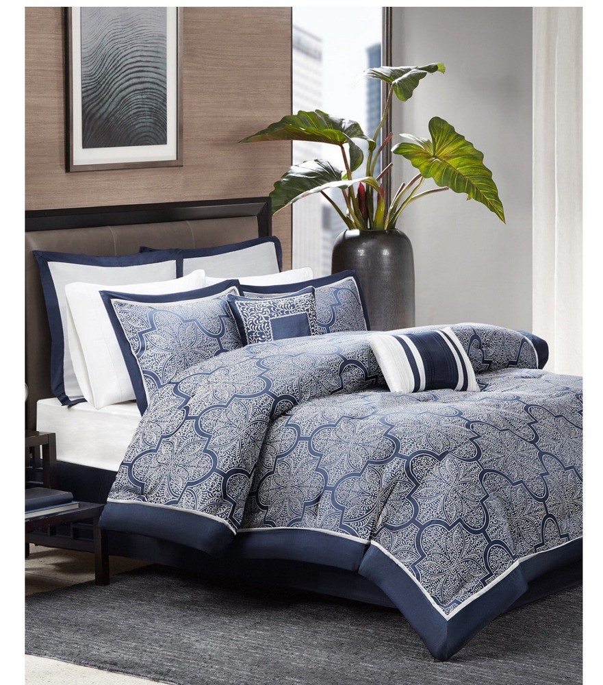 Give your bedroom an elegant touch with the Madison Park Medina 8 Piece Jacquard Comforter Set in Queen size. This set includes a comforter, two shams, two decorative pillows, two euro shams, and a bedskirt. The medallion pattern in navy color adds a stylish look and complements any bedroom decor. The comforter set is made of high-quality polyester and microfiber material, ensuring comfort and durability. It is suitable for all seasons and can be easily maintained by machine washing. Create a cozy and inviting atmosphere in your bedroom with this elegant comforter set from Madison Park.