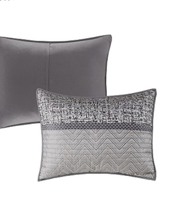 Madison Park Melody grey and beige 7pc. Comforter Set King NIP. Set Includes: One King Comforter - 104” x 92in. Two King Shams - 20in. X 36in. Bedskirt - 78in. X 80in. X 15in. Drop Oblong decorative pillow - 12in. X 18in. Large square pillow - 18in. X 18in. Small square pillow - 16in. X 16in. Brand new Retail - $409.00