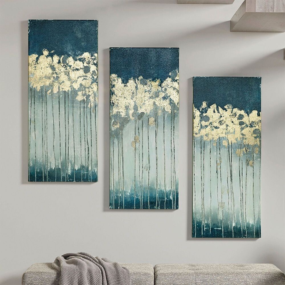 Madison Park Midnight Forest Gel Coat Canvas with Gold Embellishment 3 pcs set in teal. Midnight Forest is a triptych set that will add style and sophistication to your room. The set incorporates a beautiful teal color and hand applied gold foiling for added dimension. Transitional Life Style 70% MDF, 10% Canvas, 10% Foil, 10% Gel coat 3 canvas: 15x35x1.5 inches (3) Approximate weight: 18.5 lbs