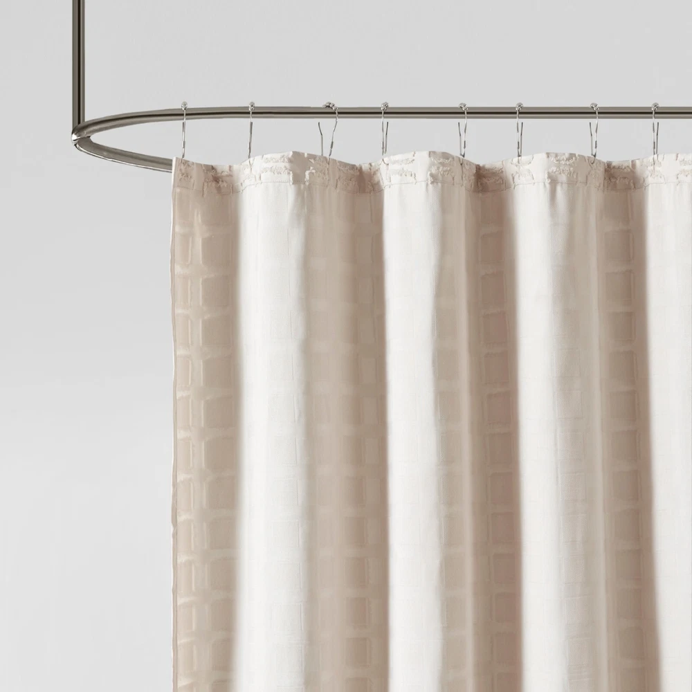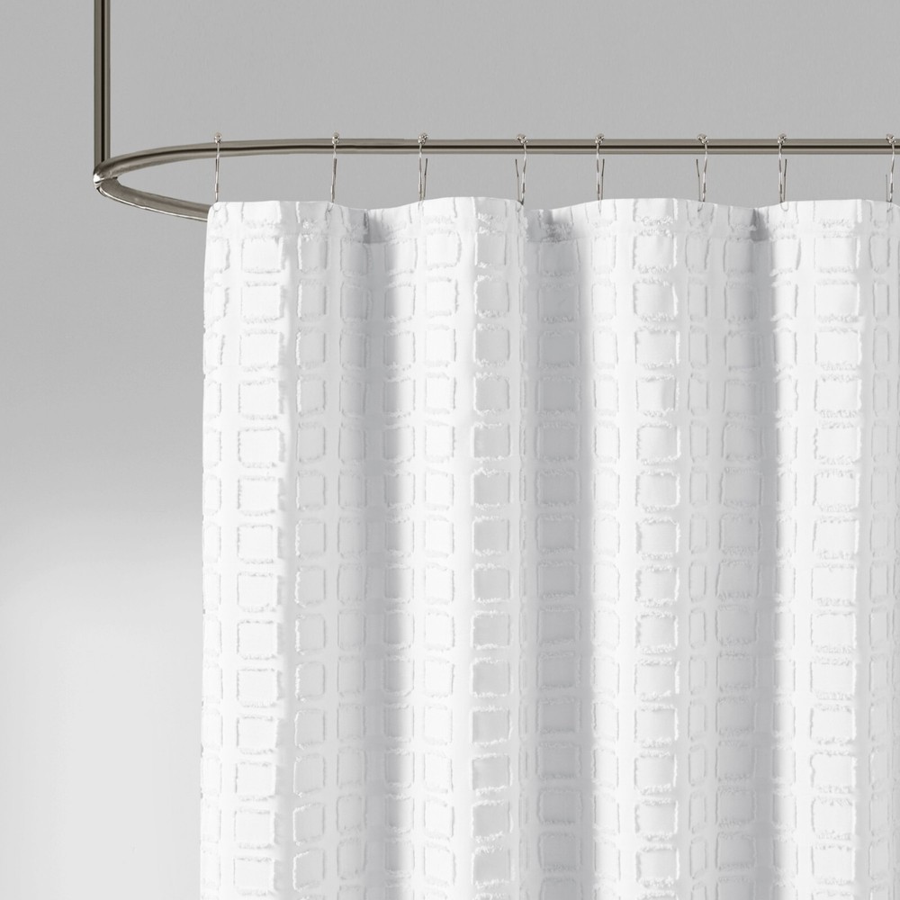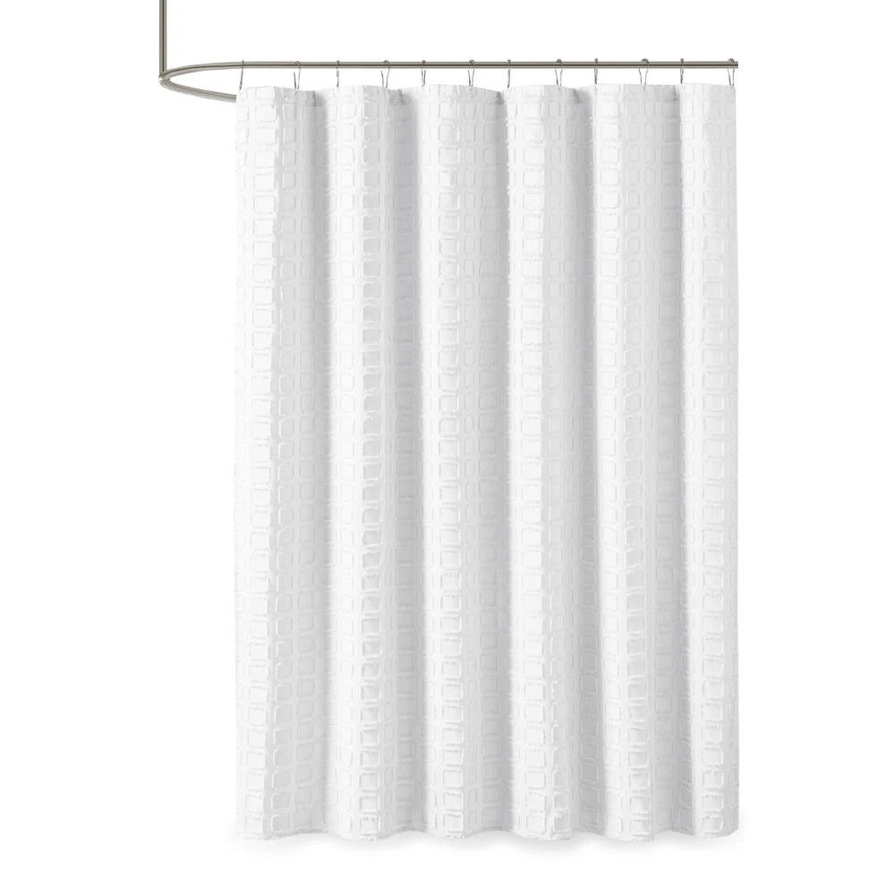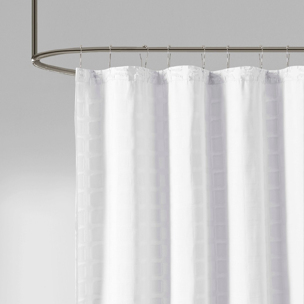 Madison Park Modern Woven Clipped Solid Shower Curtain for Bathroom Decor 72x72" Description: Elevate your bathroom decor with the Madison Park Metro Woven Clipped Solid Shower Curtain. This solid white shower curtain features a woven square geometric design with a clipped treatment to create beautiful texture and dimension, for an updated look. Measuring 72”x72”, this shower curtain adds a chic modern touch to your bathroom and is machine washable for easy care. A water repellant liner is not included, but highly recommended and can be purchased separately. 72x72" Size include: 1 Shower Curtain:72"W x 72"L Care Instruction: Machine Washable Material Details: 100% Polyester