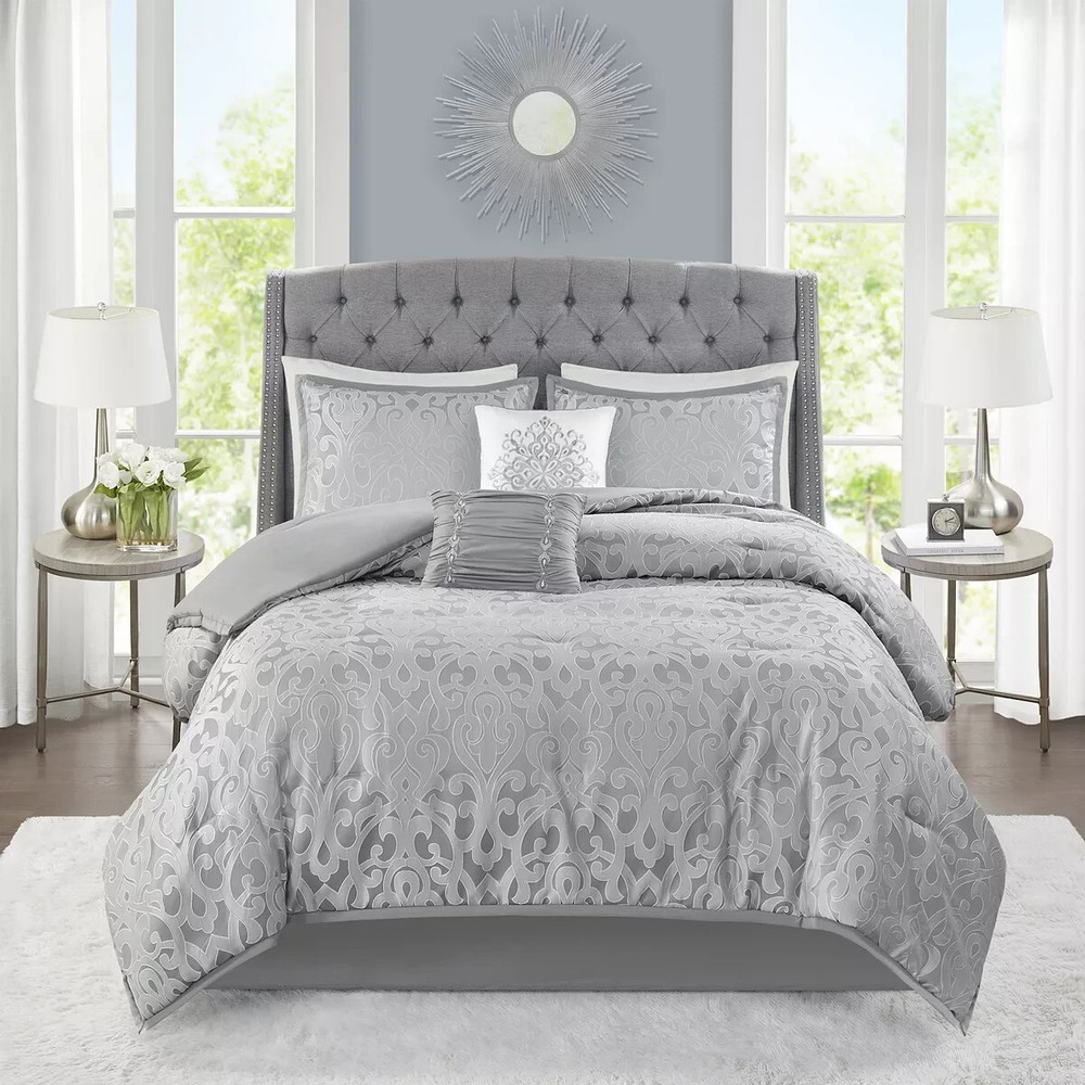 Redefine the look of your existing bed with this Madison Park Morgan 6-Piece Comforter Set with Coordinating Pillows. PRODUCT FEATURES Soft and cozy Woven jacquard fabrication Coordinating solid gray reverse Beautiful light and medium gray damask design Decorative pillows with embroidery, pleating and piping QUEEN SET 6-piece set Comforter: 90"W x 92"L 2 Standard Shams: 20"W x 26"L 1 Bed skirt: 60"W x 80"L x 15"D 2 Decorative Pillows: 12"W x 16"L; 16"W x 16"L CONSTRUCTION & CARE Polyester fill Machine wash Imported SUSTAINABILITY FEATURES Tested for harmful substances STANDARD 100 by OEKO-TEX®-CERTIFIED Certification No. 19.HCN.68889 HOHENSTEIN HTTI Testing Institute: Hohenstein Textile Testing Institute www.oeko-tex.com/standard100