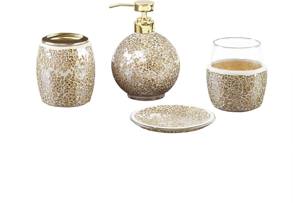 Madison Park Mosaic Bathroom Accessories Set , 4 Piece Bath Gold 4 Product Details Number of Pieces: 4 Finish Type: Glass Manufacturer: Madison Park UPC: 06 Product Dimensions: 4.33 x 4.33 x 6.5 inches Item Weight: 4.07 pounds Country of Origin: China Item model number: MP71-4894 Is Discontinued By Manufacturer: No Finish types: Glass Care instructions: Wipe Clean With Damp Cloth Assembly required: No Batteries required: No Import: Imported Material: Glass Color: Gold 4 Piece Brand: Madison Park Style: Modern; Contemporary Included Components: Tumbler, Soap Dish, Toothbru Set includes: soap dispenser, toothbrush holder, tumbler, ring dish Wipe clean Crackle glass mosaic Yellow gold color Mosaic 1 Soap Dispenser:4.33"W x 4.33"L x 6.5"H 1 Toothbrush Holder:3.54"W x 3.54"L x 4.13"H 1 Tumbler:3.54"W x 3.54"L x 3.86"H 1 Ring Tray:4.92"W x 4.92"L x 0.59"H Wipe clean with damp cloth Add an alluring radiance to your bathroom with the Madison Park Mosaic 4 Piece Bath Accessory Set. Flaunting a crackle glass mosaic design, this bathroom accessory set includes a soap dispenser, toothbrush holder, a tumbler, and a ring dish. Maximize your counter space by incorporating this accessory set in your bathroom for a glamorous touch.