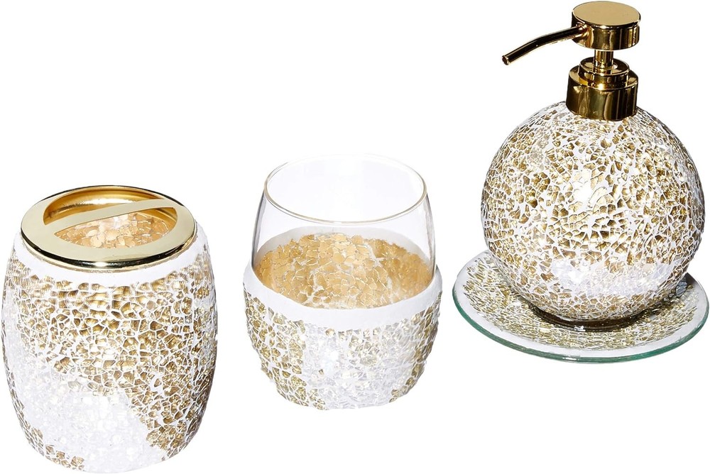Madison Park Mosaic Bathroom Accessories Set , 4 Piece Bath Gold 4 Product Details Number of Pieces: 4 Finish Type: Glass Manufacturer: Madison Park Item Weight: 4.1 Pounds Product Dimensions: 4.33 x 4.33 x 6.5 inches Item Weight: 4.07 pounds Country of Origin: China Item model number: MP71-4894 Is Discontinued By Manufacturer: No Finish types: Glass Care instructions: Wipe Clean With Damp Cloth Assembly required: No Batteries required: No Import: Imported Material: Glass Color: Gold 4 Piece Brand: Madison Park Style: Modern; Contemporary Included Components: Tumbler, Soap Dish, Toothbru Set includes: soap dispenser, toothbrush holder, tumbler, ring dish Wipe clean Crackle glass mosaic Yellow gold color Mosaic 1 Soap Dispenser:4.33"W x 4.33"L x 6.5"H 1 Toothbrush Holder:3.54"W x 3.54"L x 4.13"H 1 Tumbler:3.54"W x 3.54"L x 3.86"H 1 Ring Tray:4.92"W x 4.92"L x 0.59"H Wipe clean with damp cloth Add an alluring radiance to your bathroom with the Madison Park Mosaic 4 Piece Bath Accessory Set. Flaunting a crackle glass mosaic design, this bathroom accessory set includes a soap dispenser, toothbrush holder, a tumbler, and a ring dish. Maximize your counter space by incorporating this accessory set in your bathroom for a glamorous touch.