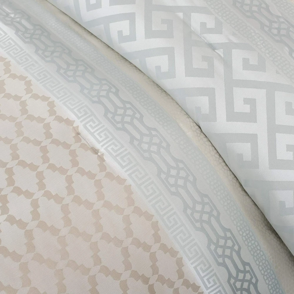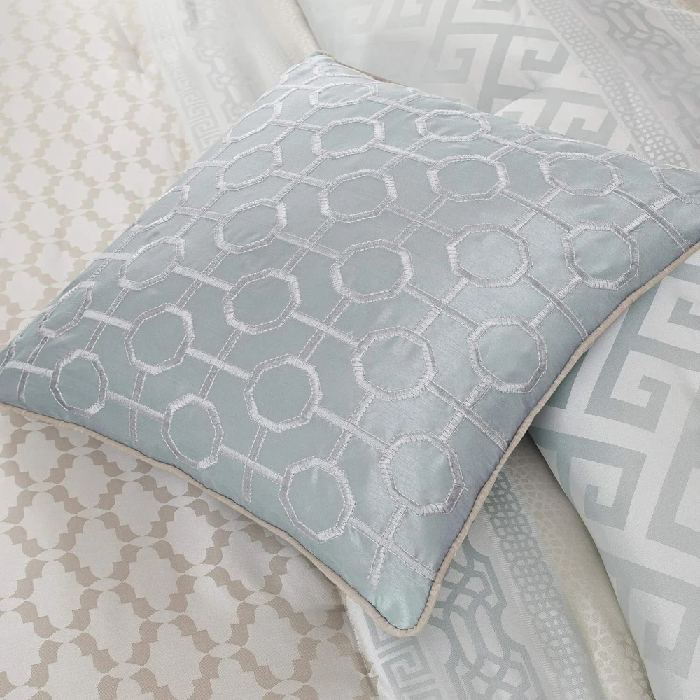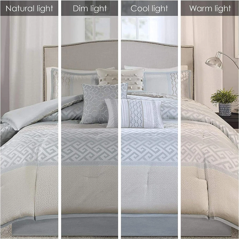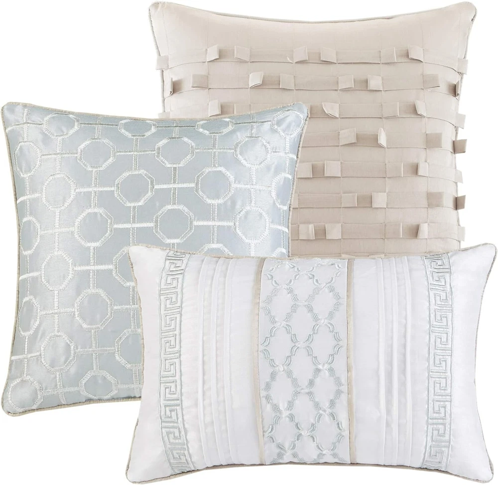 Madison Park Luxury Comforter Set-Traditional Jacquard Design All Season Down Alternative Bedding, Matching Bedskirt, Decorative Pillows, King(104"x92"), Bennett, Geometric Aqua 7 Piece 100% Polyester Imported The Bennett Comforter Set provides a peaceful update to your bedroom with its soft shades of seafoam and taupe. Several geometric prints adorn this collection working together in large and small stripes for an updated traditional look. Stripes of textured jacquard created 3 dimensional effect on the bedding. Set includes: 1 Comforter: 104"W x 92"L, 2 King Shams: 20"W x 36"L + 1"D, 1 Bedskirt: 78"W x 80"L + 15"D, 3 Decorative Pillows: 16"W x 16"L/12"W x 18"L/18"W x 18"L Care instructions: machine washable DESCRIPTION The Madison Park Bennett 7 Piece Jacquard Comforter Set provides an elegant and luxurious update for your bedroom. This jacquard comforter features a striped design with geometric woven motifs to create an updated traditional look. The 2 matching shams repeat a similar striped pattern that pairs perfectly with the comforter. A solid bed skirt made from faux silk and 3 decorative pillows are also included, providing elegant finishing touches. Machine washable for easy care, this jacquard comforter set brings a refined traditional allure to your bedroom decor. Items in the set may come in a rolled or compressed packaging, which will need to be fluffed up or steam ironed before use to remove wrinkles. FEATURES • Luxury and elegant jacquard 7 piece comforter set • Traditional style in several jacquard geometric designs • Set includes 1 comforter, 2 matching shams, 3 decorative pillows and 1 bed skirt • 100% polyester hypoallergenic filling for comforter and pillows • Machine washable and steam iron for wrinkle removal • Items in this set may come in rolled or compressed packaging and will need to be fluffed up MATERIAL Poly Jacquard face, soft microfiber solid back comforter and shams, 8oz/sq yard polyester filling. Polyeter bedskirt and pillows Available Sizes: King Comforter Set includes: 1 Comforter: 104"W x 92"L 2 King Shams: 20"W x 36"L 1 Bed Skirt: 78"W x 80"L + 15"D 1 Decorative Pillow: 16"W x 16"L 1 Decorative Pillow: 12"W x 18"L 1 Decorative Pillow: 18"W x 18"L WILL BE COMPRESSED AND REPACKAGED TO REDUCE SHIPPING. CBA8 288-276 24