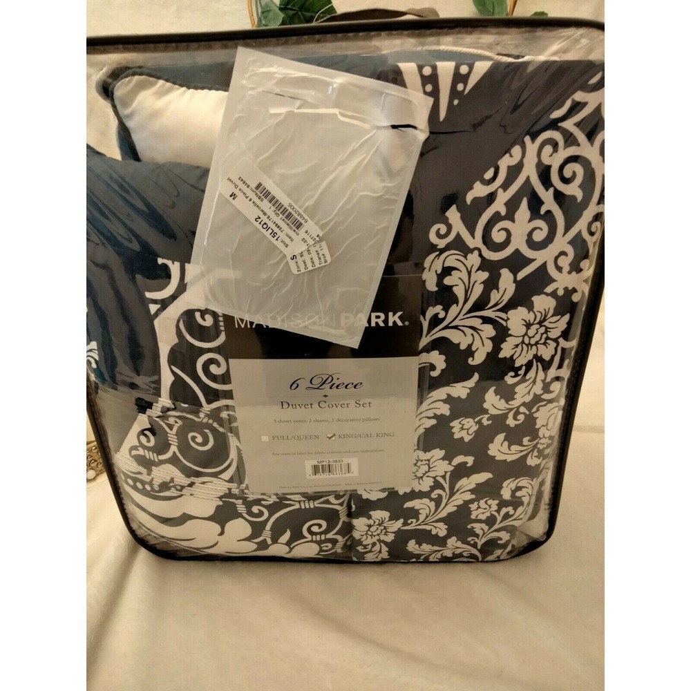 Enhance the elegance of your bedroom with the Madison Park Navy Blue White 6-piece King Duvet set with cushions. This luxurious duvet set features a delightful floral pattern that beautifully complements a modern style bedroom. The set includes a super king duvet cover, decorative pillows, and pillowcases, providing a complete bedding solution that is perfect for a king duvet set. Indulge in a luxurious sleep experience with this exquisite duvet set, which is created with the finest materials to offer a comfortable and relaxing sleep. The navy blue and white color scheme blends beautifully with the theme of luxury and flowers, making it a perfect fit for your bedroom. Bring a touch of modern sophistication to your bedroom with the Madison Park Navy Blue White 6-piece King Duvet set with cushions.