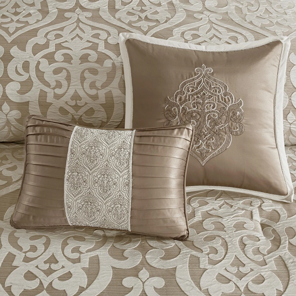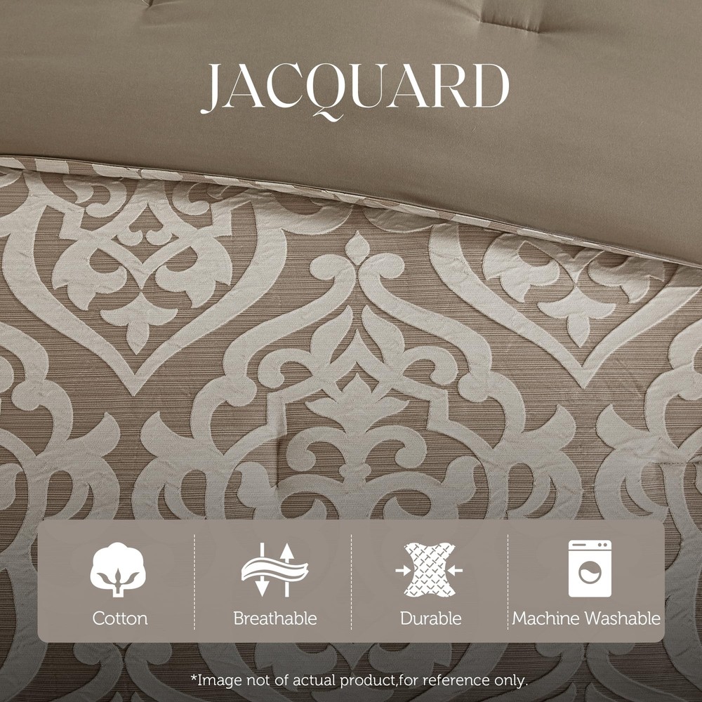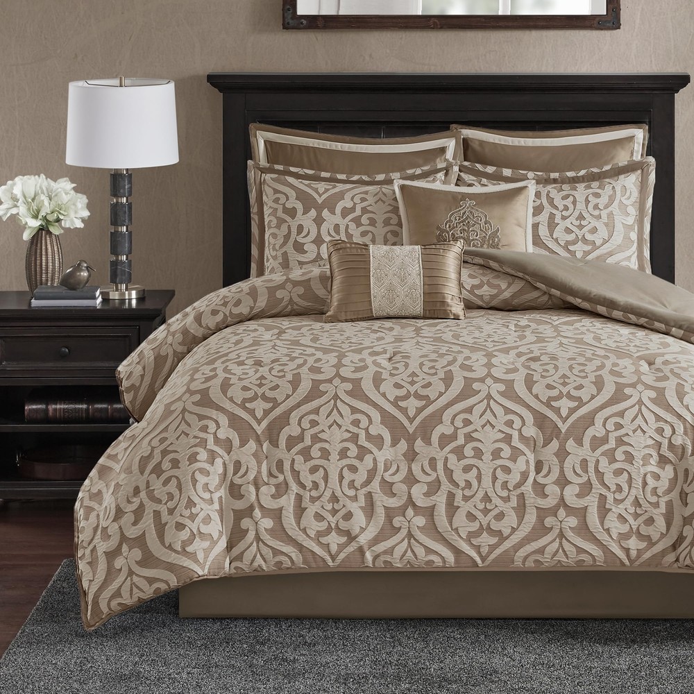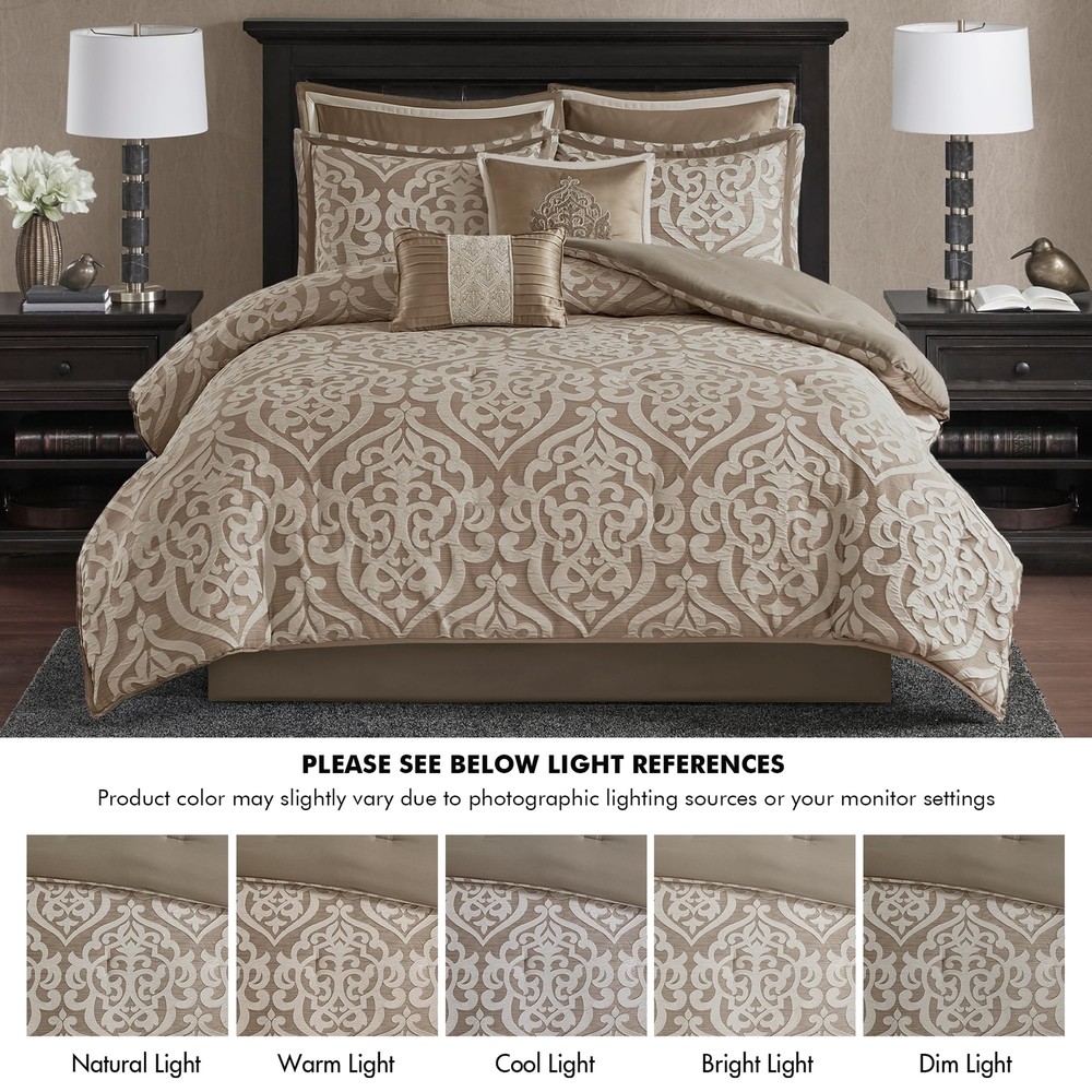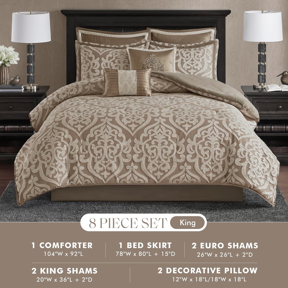 Madison Park Odette Cozy Comforter Set Jacquard Damask Medallion Design - Modern All Season, Down Alternative Bedding, Shams, Decorative Pillow, King(104 in x 92 in), Tan 8 Piece PLEASE NOTE: ITEM IS NEW. BOX HAS BEEN OPENED TO VERIFY CONDITION AND CONTENTS. Add a touch of class to your bedroom with the Madison Park Odette 8 Piece Jacquard Comforter Set. The luxurious textured jacquard comforter and shams flaunt a gorgeous damask medallion design with ivory striations on the satin ground that add dimension to the lavish look. A solid neutral reverse and stunning Euro shams complement the top of the bed to complete the ensemble. Also included are two decorative pillows that feature embroidery and cording details, while a solid neutral bed skirt provides a clean and elegant finish. Machine washable for easy care, This jacquard comforter set offers a strikingly luxurious update to your décor. Features PLEASE NOTE: ITEM IS NEW. BOX HAS BEEN OPENED TO VERIFY CONDITION AND CONTENTS. Add a touch of class to your bedroom with the Madison Park Odette 8 Piece Jacquard Comforter Set. The luxurious textured jacquard comforter and shams flaunt a gorgeous damask medallion design. With the right amount of fill to keep you warm and comfortable year round. Set includes: 1 Comforter:104"W x 92"L, 2 King Shams:20"W x 36"L plus 2"D, 1 Bedskirt:78"W x 80"L plus15"D, 2 Decorative Pillows:12"W x 18"L/18"W x 18"L, 2 Euro Shams:26"W x 26"L plus 2"D Care instructions: Machine wash, delicate and separately. Tumble dry low. Spot clean decorative pillows. Details Product Dimensions: 92.0 x 104.0 x 1.5 inches Item Weight: 16.18 pounds Shipping Weight: 16.18 pounds Manufacturer: E&E Co. Ltd DBA JLA Home Item color: Tan Item model number: MP10-6288 Item MPN: MP10-6288 Item part number: MP10-6288 Fast and Free Shipping You're already purchasing the item. Why pay additional for shipping, especially slow shipping? We get your order shipped out within 1-business day and delivered to your doorstep as quickly as possible. Competitive Pricing With our dynamic pricing model, our prices are always competitive. Our prices are some of the lowest that you will find on the internet. Rest assured that you're getting a good deal when purchasing with us. {{marketing_message_heading_3}} {{marketing_message_body_3}}