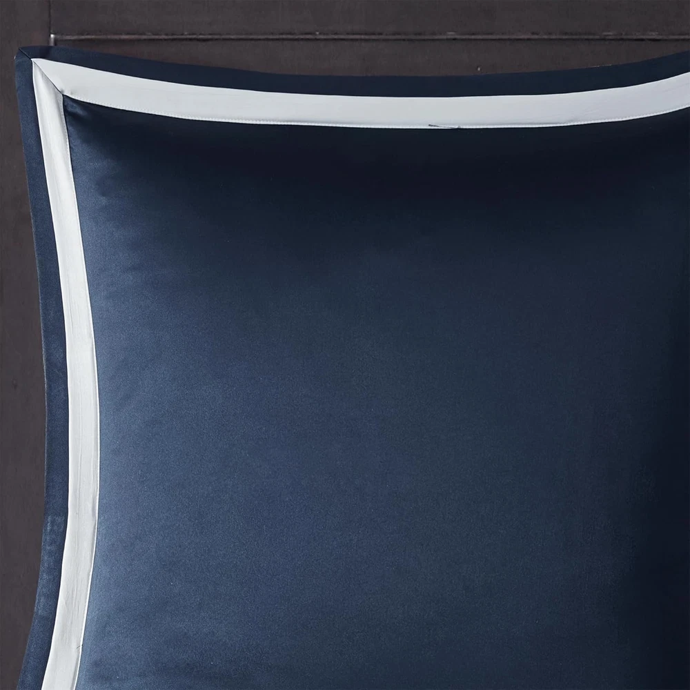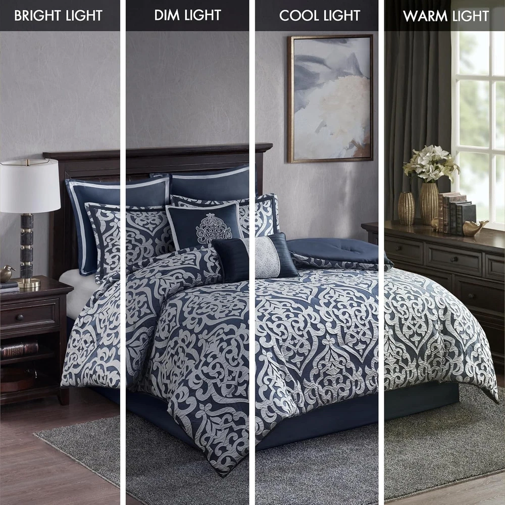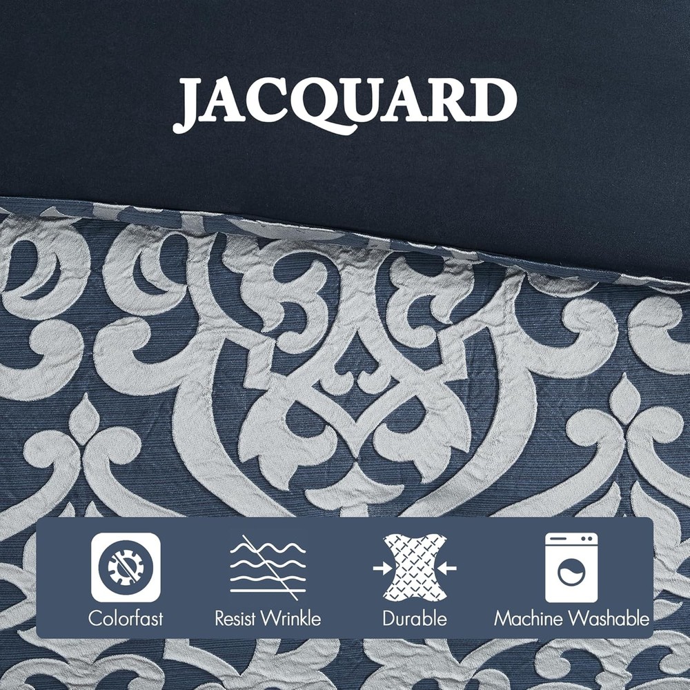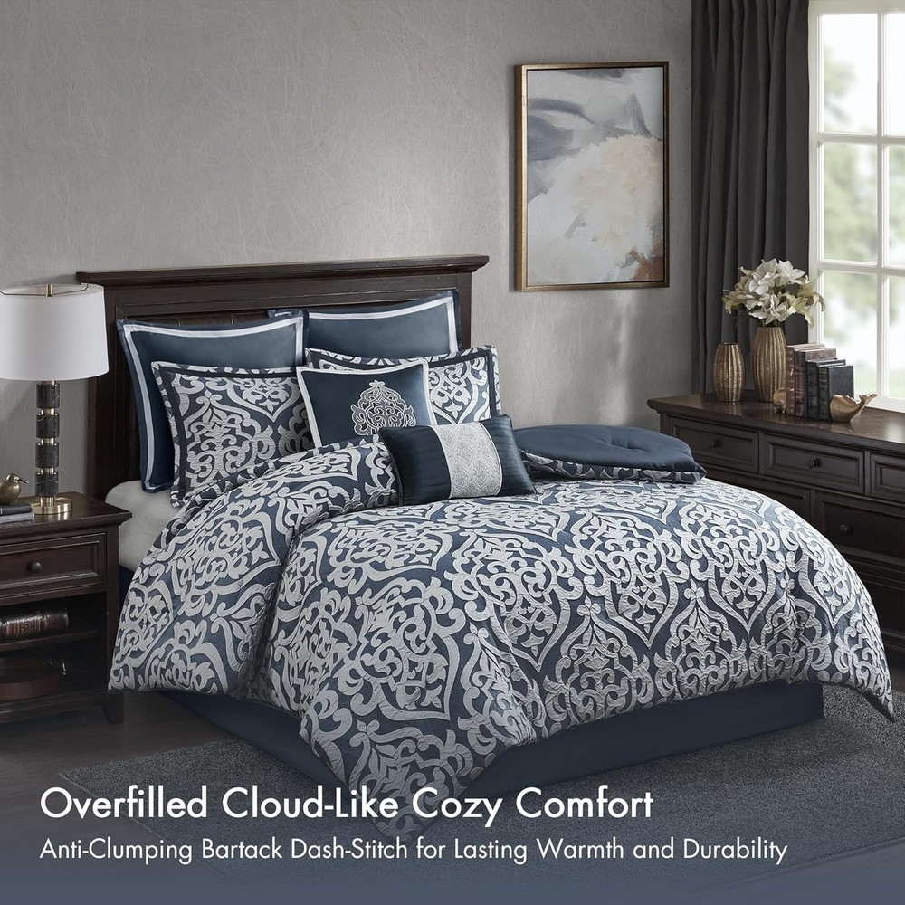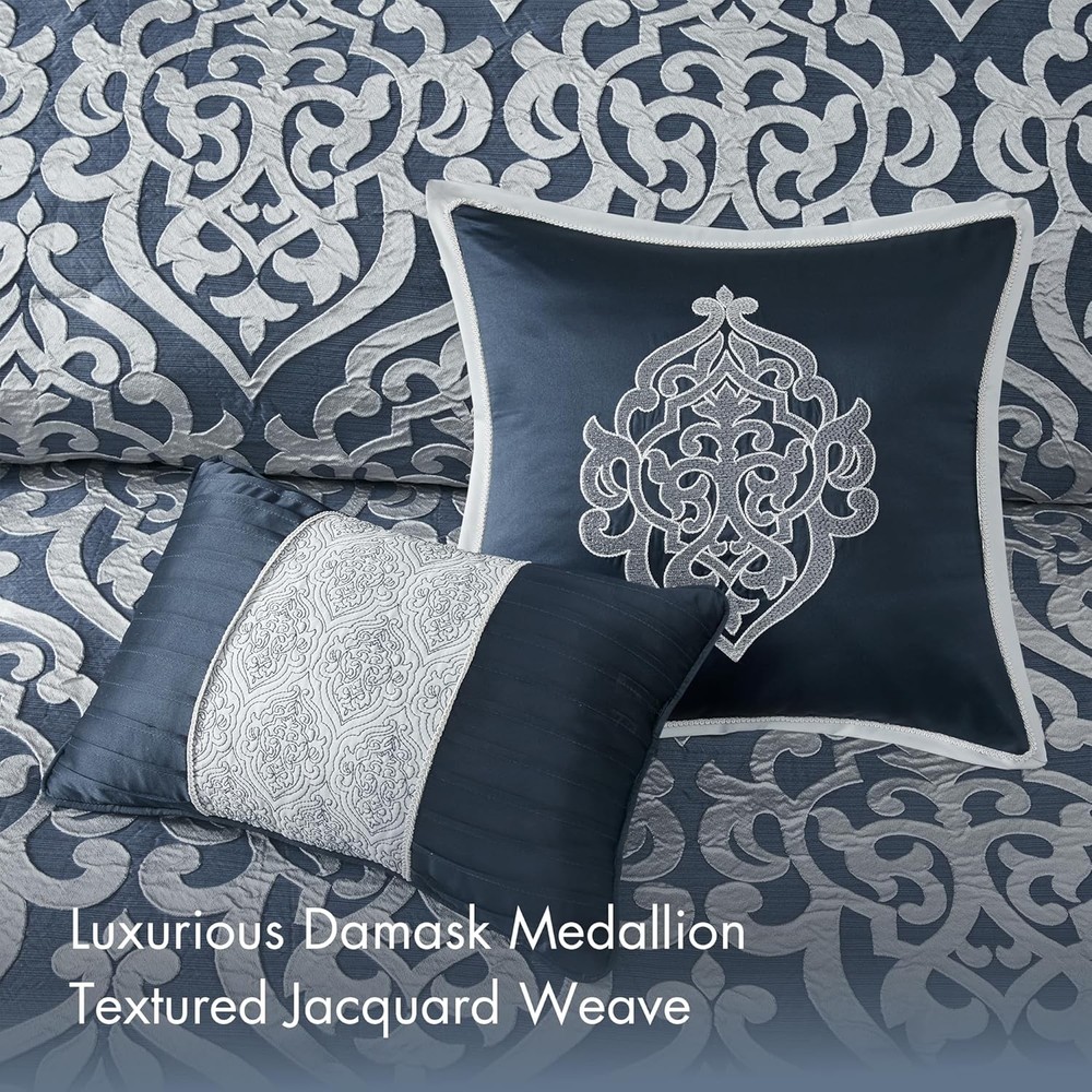 This is an OpenBoxed Item. Our Opened Box items are in great condition. Typically the item is 100% brand new in a replaced box. A great way to get a lot more for your money. All our items are 100% guaranteed! So buy worry free! Madison Park Odette Cozy Comforter Set Jacquard King (104 in x 92 in), Navy Product Details Size: King (104 in x 92 in) Included Components: 1 Comforter, 2 Decoratvie Pillows, 2 King Shams, 2 Euro Shams, 1 Bedskirt Color: Navy Brand: Madison Park Theme: Medallion,Modern,Damask Pattern: Damask Material: Polyester Fabric Type: 100% Polyester Jacquard Number of Pieces: 8 Seasons: All Product Care Instructions: Machine Wash Manufacturer: E&E Co. Ltd DBA JLA Home Item dimensions L x W x H: 92 x 104 x 1.5 inches Product Dimensions: 92 x 104 x 1.5 inches Item Weight: 12.78 pounds Country of Origin: China Item model number: MP10-6837 Refill: down Assembly required: No Batteries required: No 100% Polyester Jacquard Add a touch of class to your bedroom with the Madison Park Odette 8 Piece Jacquard Comforter Set. The sophisticated textured jacquard comforter and shams flaunt a gorgeous damask medallion design. Satin textured jacquard fabric comes with a natural sheen creating a lustrous and luxurious look. With the right amount of hypoallergenic down alternative fill to keep you warm and comfortable year round. Set includes: 1 Comforter:104"W x 92"L, 2 King Shams:20"W x 36"L + 2"D, 1 Bedskirt:78"W x 80"L +15"D, 2 Decorative Pillows:12"W x 18"L/18"W x 18"L, 2 Euro Shams:26"W x 26"L + 2"D Care instructions: Machine wash, delicate and separately. Tumble dry low. Spot clean decorative pillows. Add a touch of class to your bedroom with the Madison Park Odette 8 Piece Jacquard Comforter Set. The luxurious textured jacquard comforter and shams flaunt a gorgeous damask medallion design with silver striations on the satin ground that add dimension to the lavish look. A solid navy reverse and stunning Euro shams complement the top of the bed to complete the ensemble. Also included are two decorative pillows that feature embroidery and cording details, while a solid navy bed skirt provides a clean and elegant finish. Overfilled for superior warmth and comfort, this jacquard comforter set offers a strikingly luxurious update to your decor.